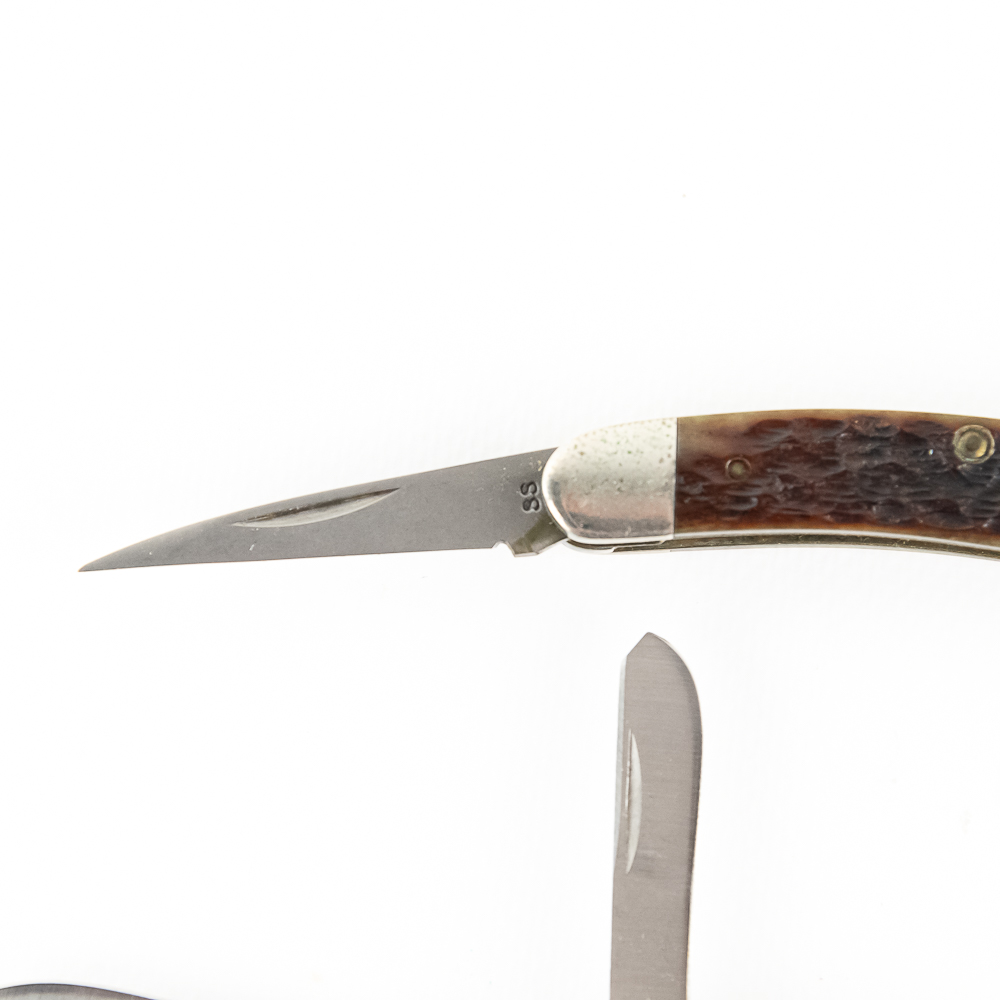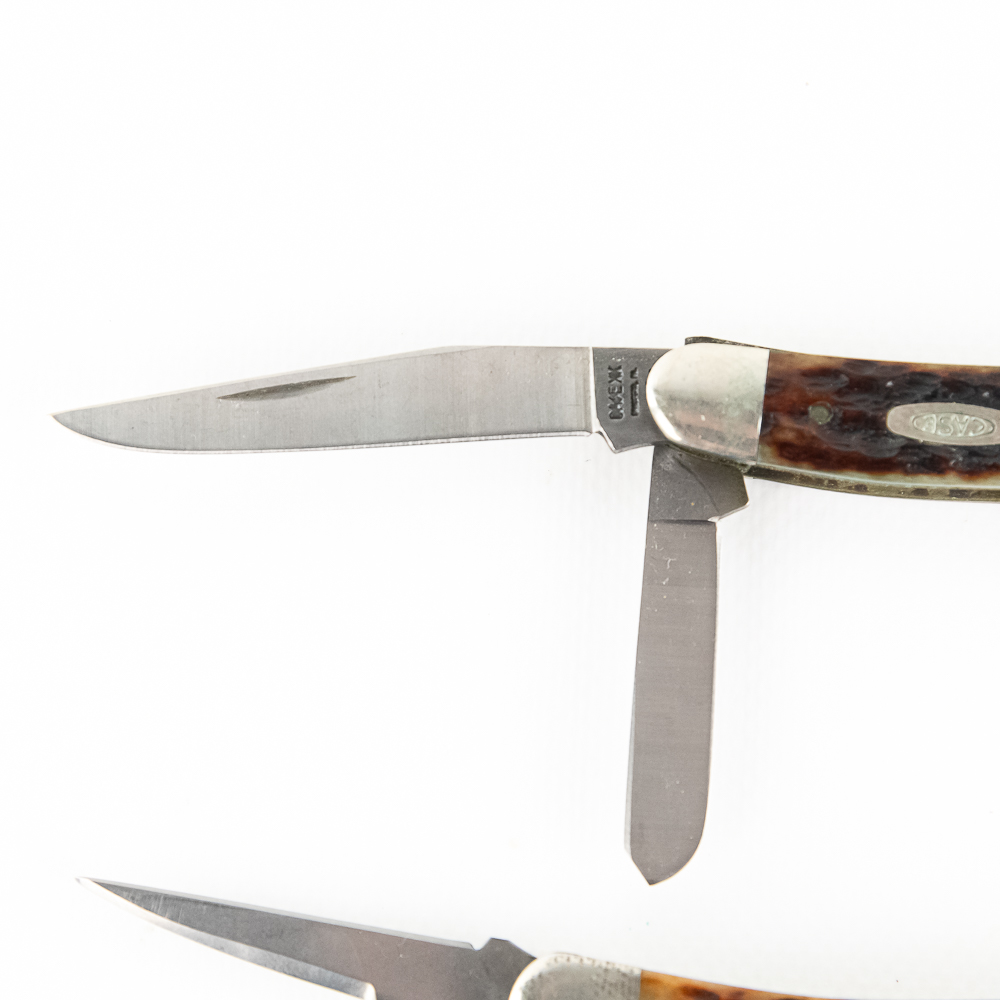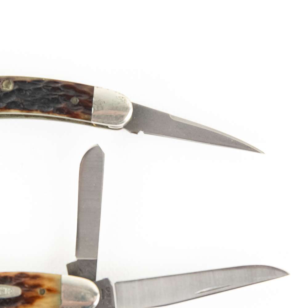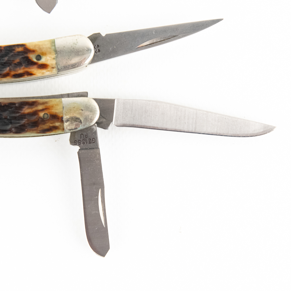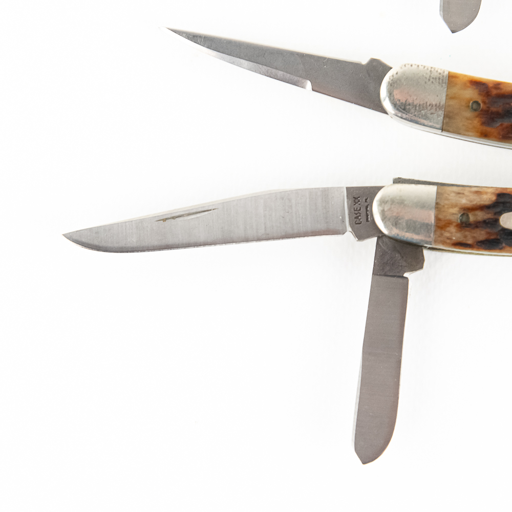 3 Case XX USA Model 6318SS Stockman Knives. 1990s production knives are like new with only minor storage wear on bolsters. Very nice high quality US made knives with Stag handles. Excellent collector lot or gift items. 3.6″ closed length. See photos.