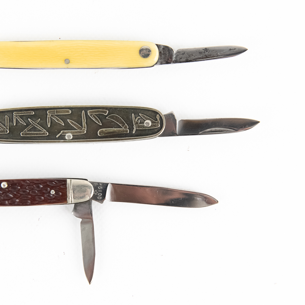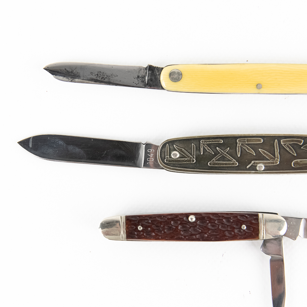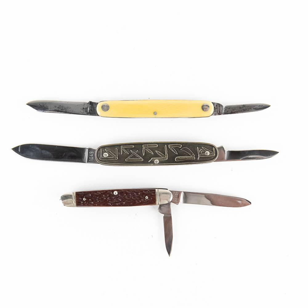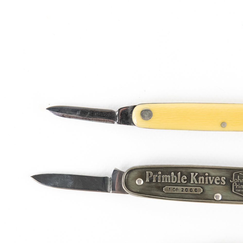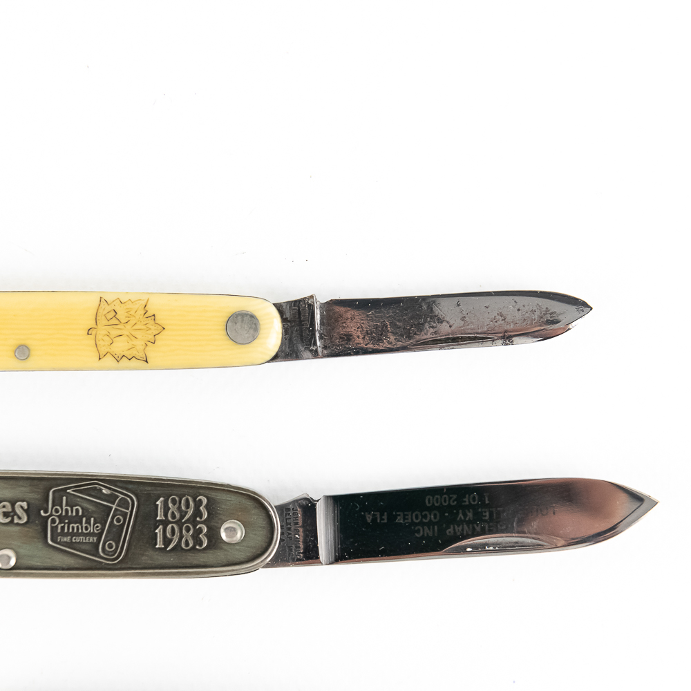 Here are three, very nice 2-blade folders from John Primble. First is an office knife pattern with celluloid scales, slight pitting and good snap. 3.25″ closed. next is a 3.00″ closed with jigged bone scales in excellent condition and a commemorative 1893-1983 Primble folder 1 of 2000, with metal scales in excellent condition.