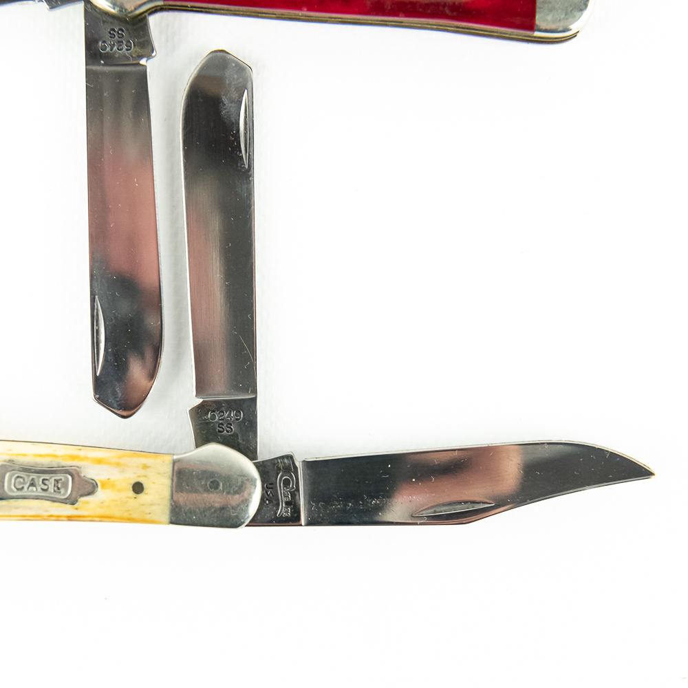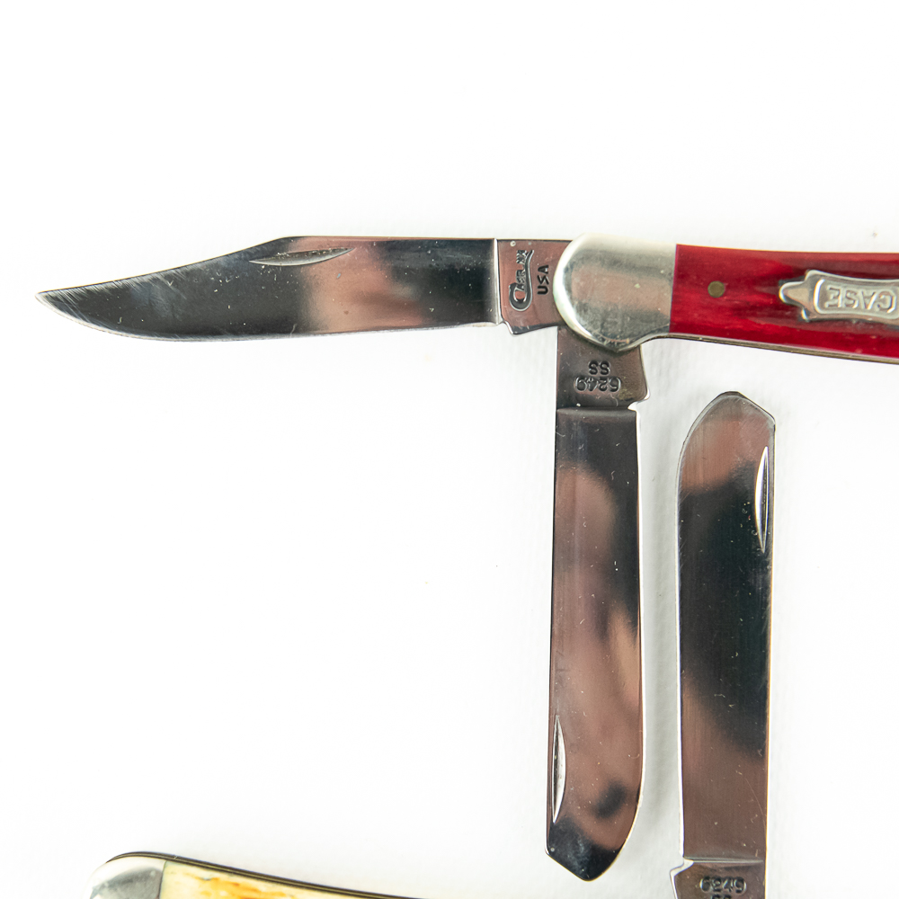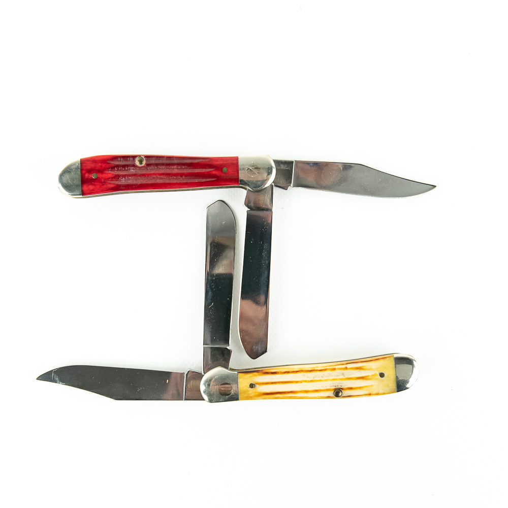 2 Case XX USA Model 6249 Copperhead knives. Both knives are like new with only minor storage wear on bolsters. Very nice high quality US made knives with bone handles. Excellent collector or gift items. 3.9″ closed length. See photos.