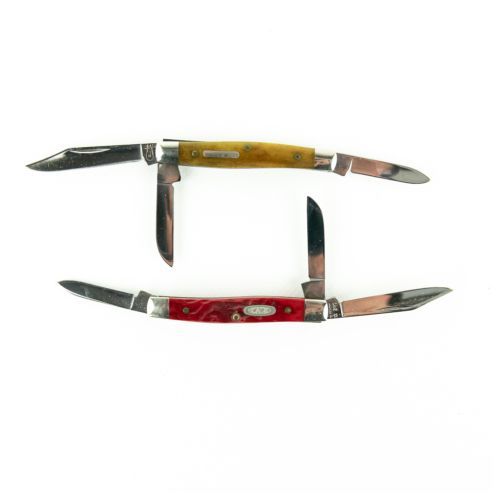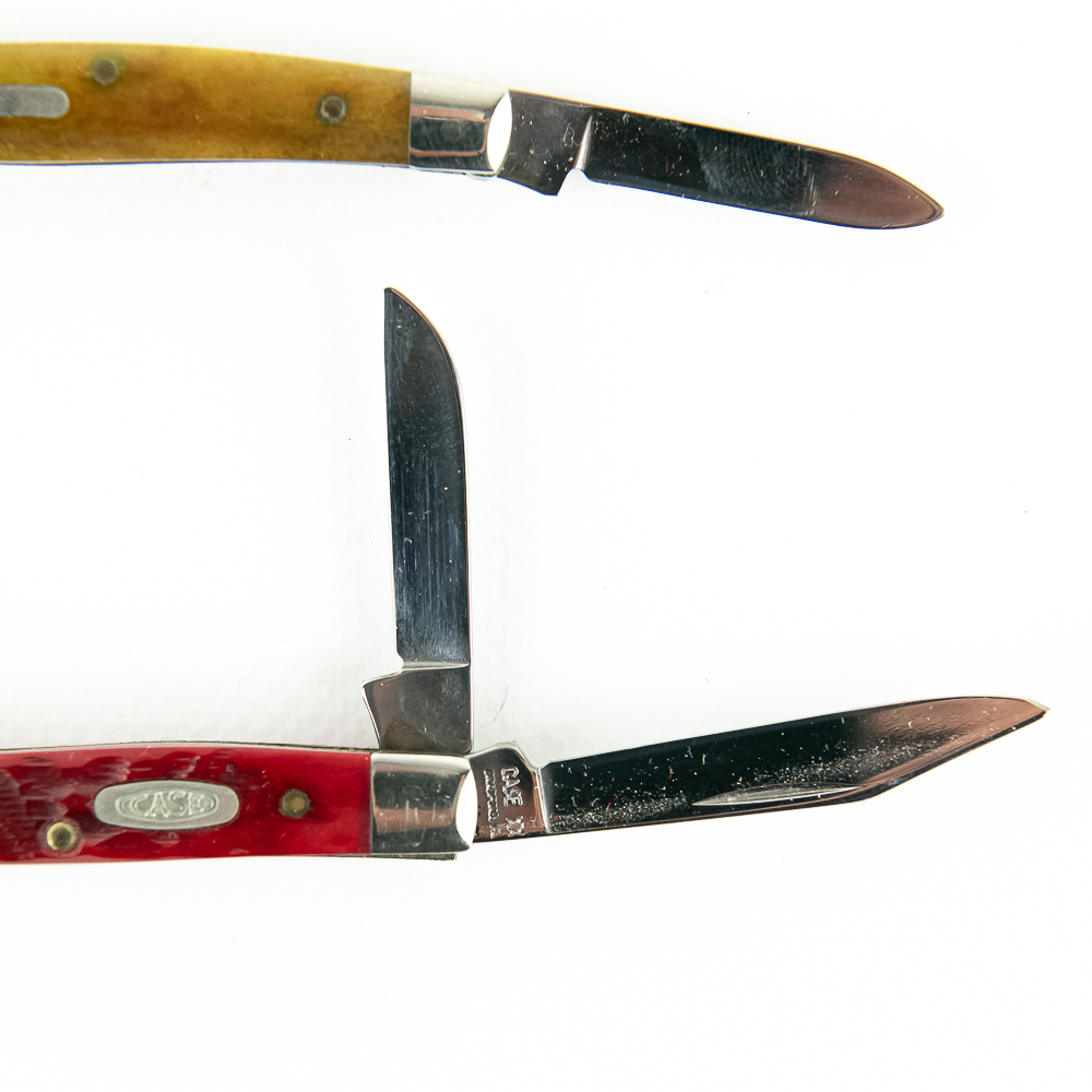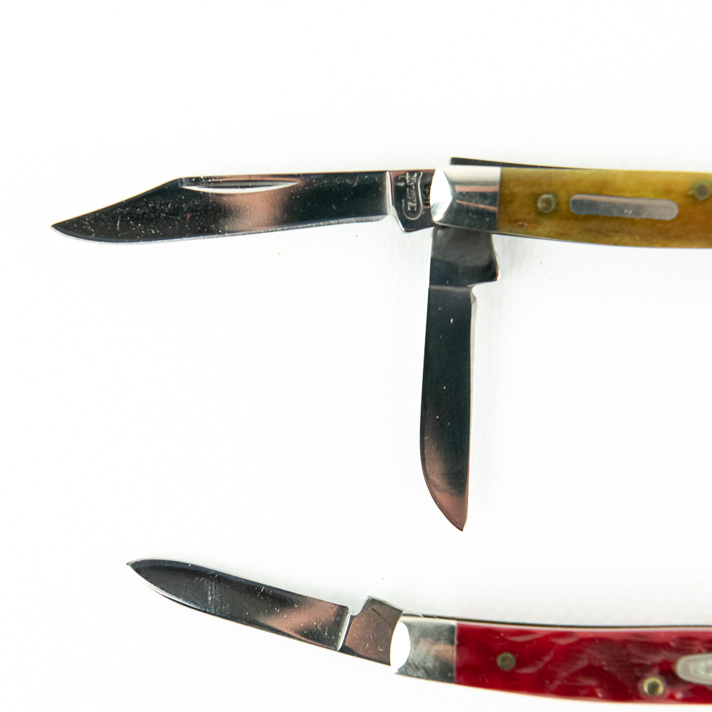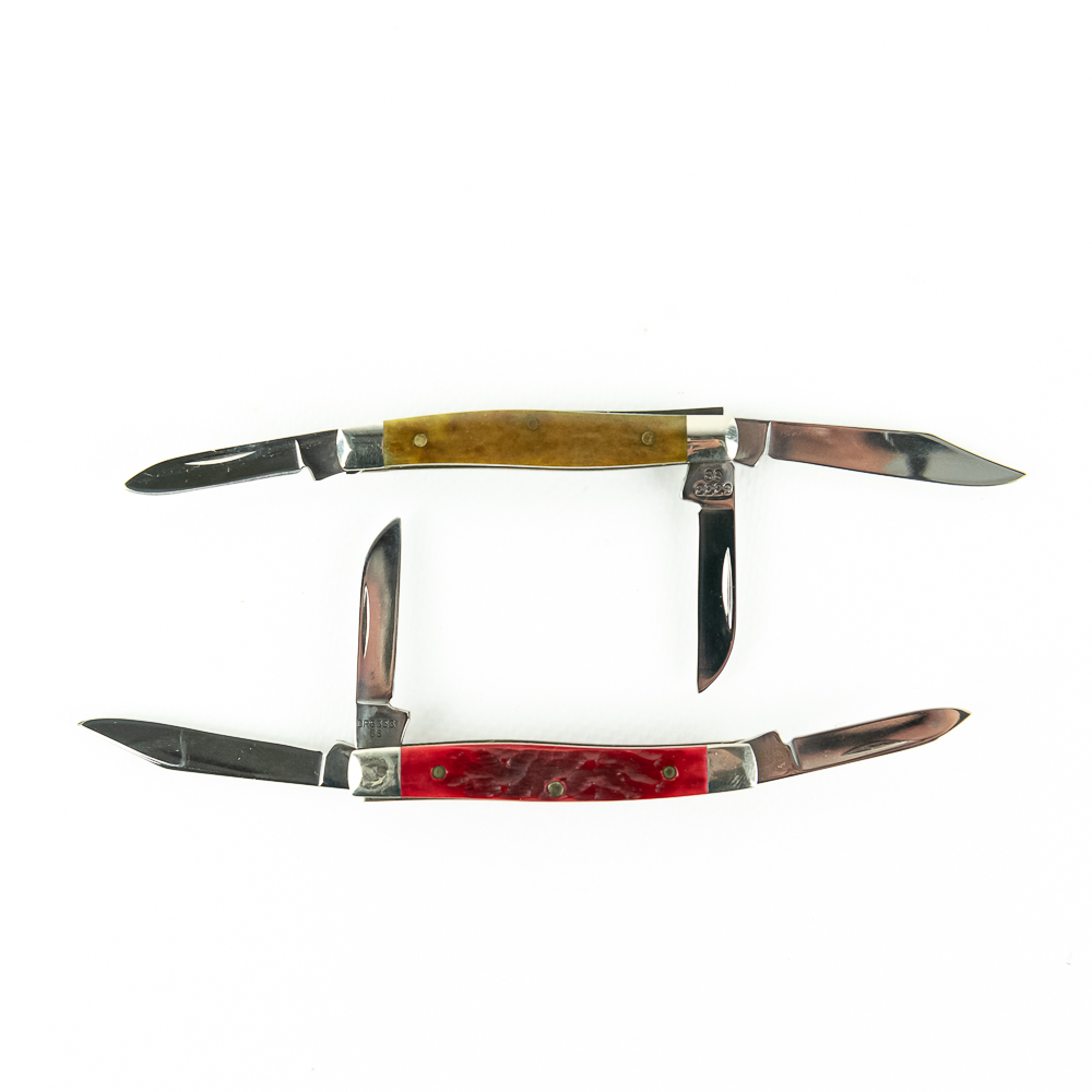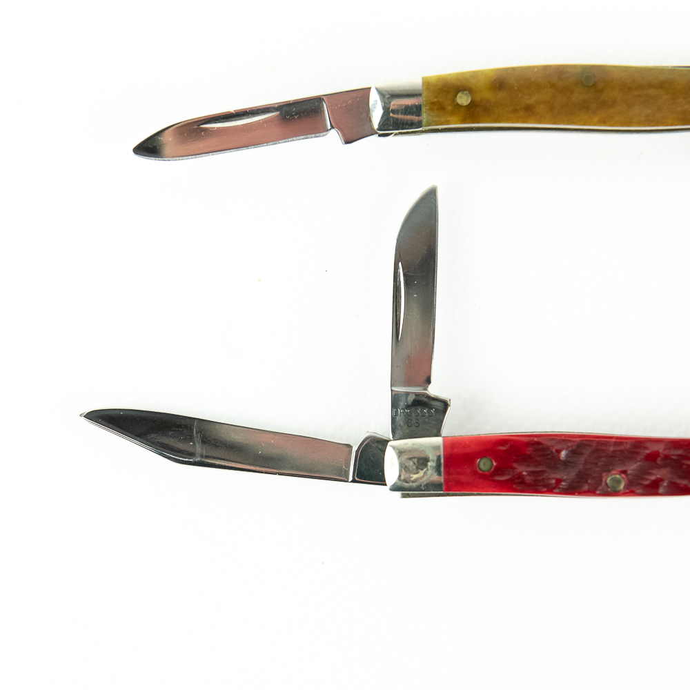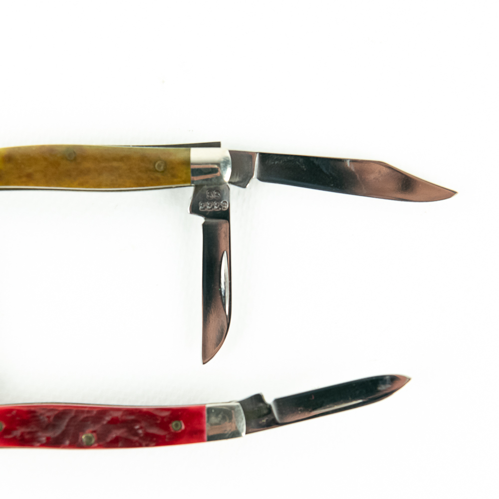 Here’s a couple of small CASE 3-blade jack knives from the 90’s. Beautiful red bone #DR6333 SS and a #6333 SS with smooth honey bone scales. Both in excellent condition overall with blades that appear unused and having good snap. These knives are 2-11/16″ closed.