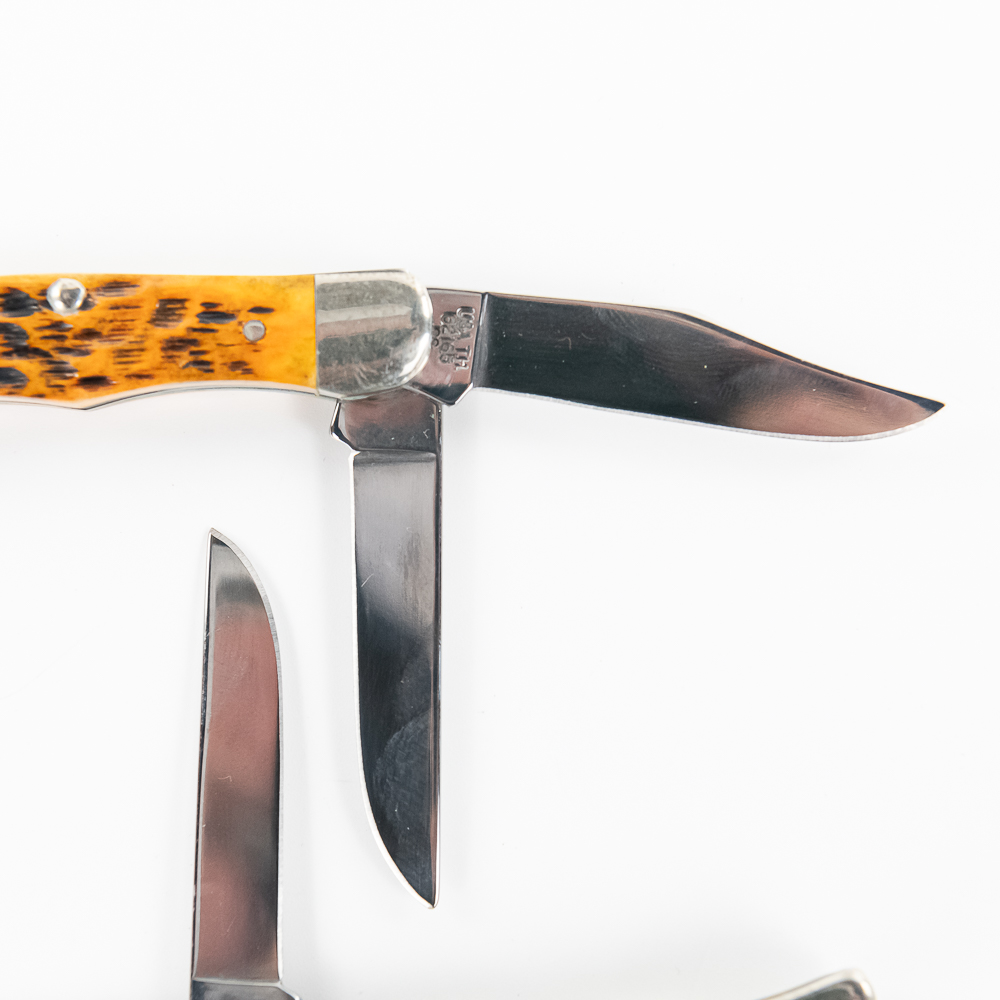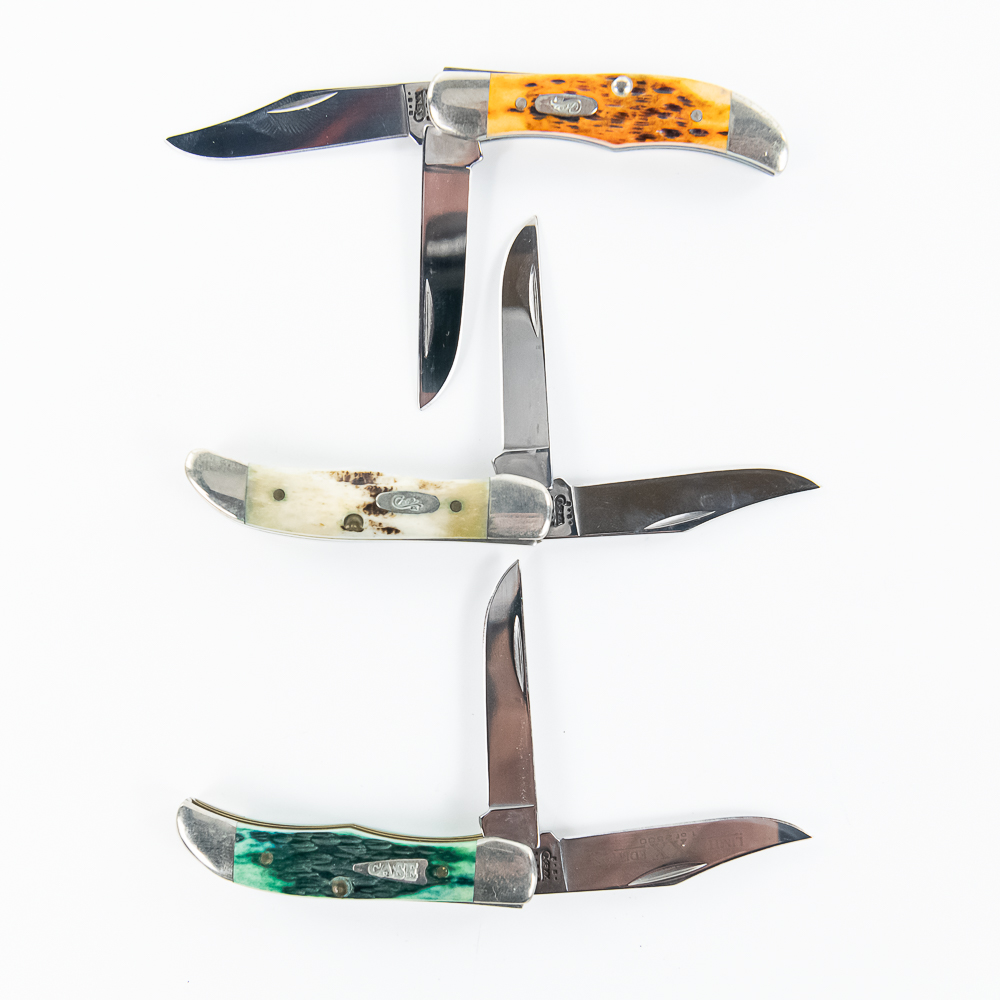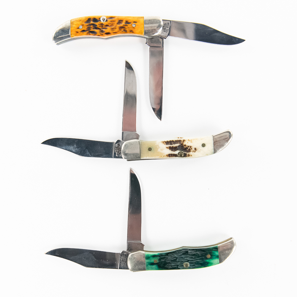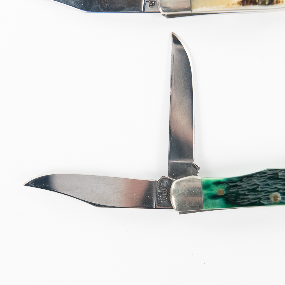 3 Case XX Model 62165 SS TH Tiny Hunter Pocket Knives. All are brand new with only minor storage marks on bolsters. 3 different handle styles, green, orange and white bone. 2.75″ closed length. Excellent collector lot or great gifts. See photos.
