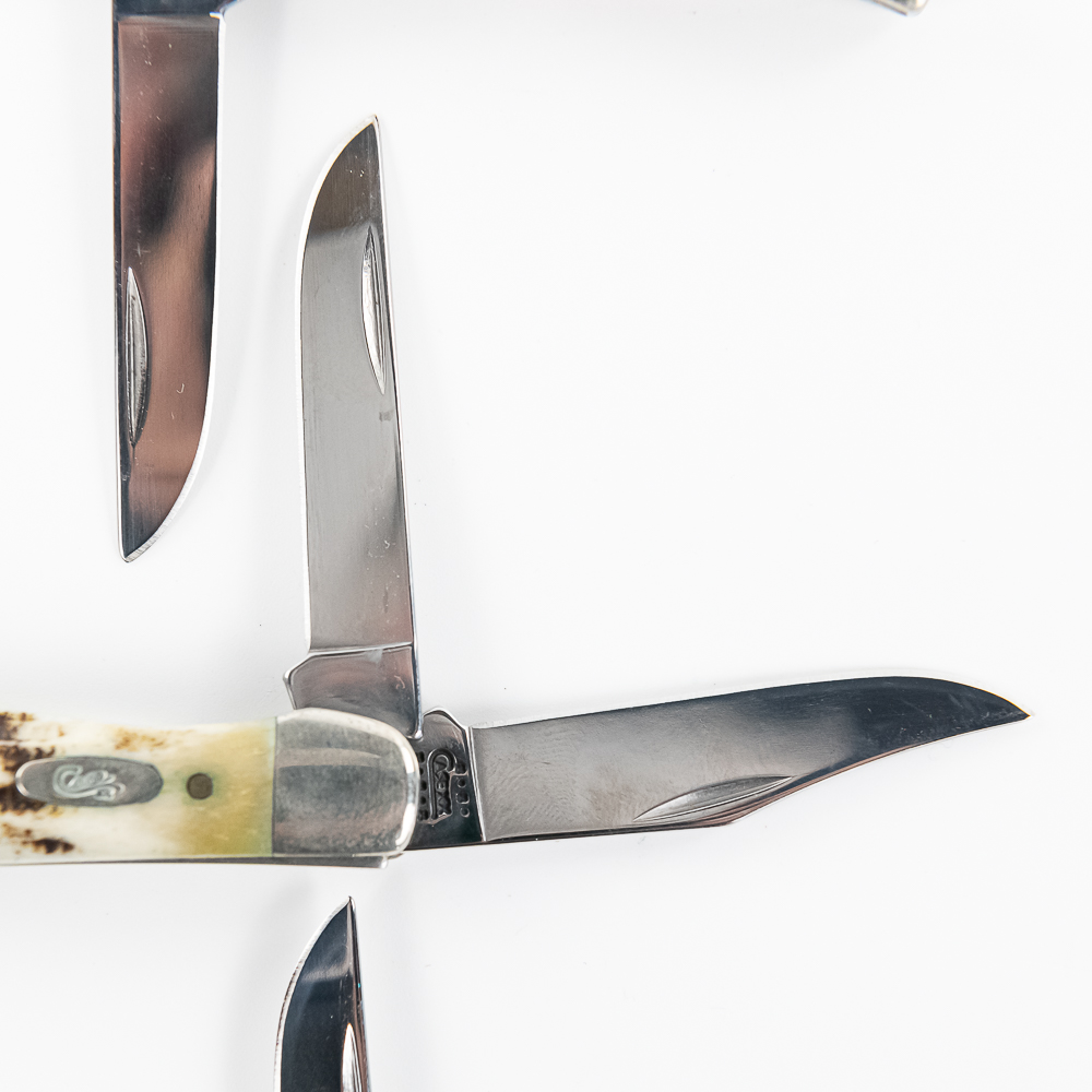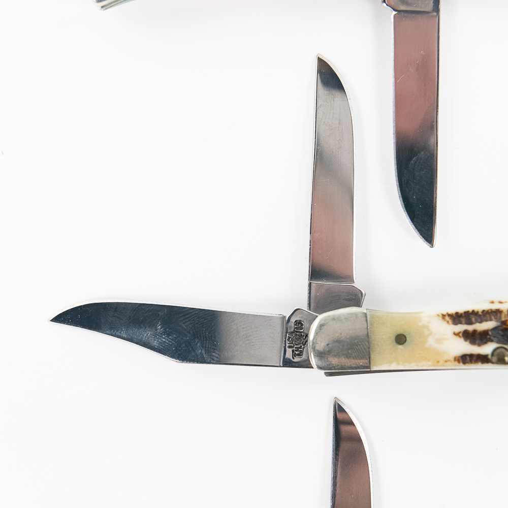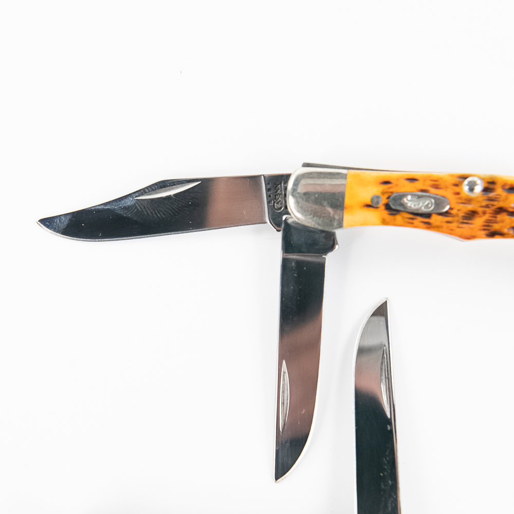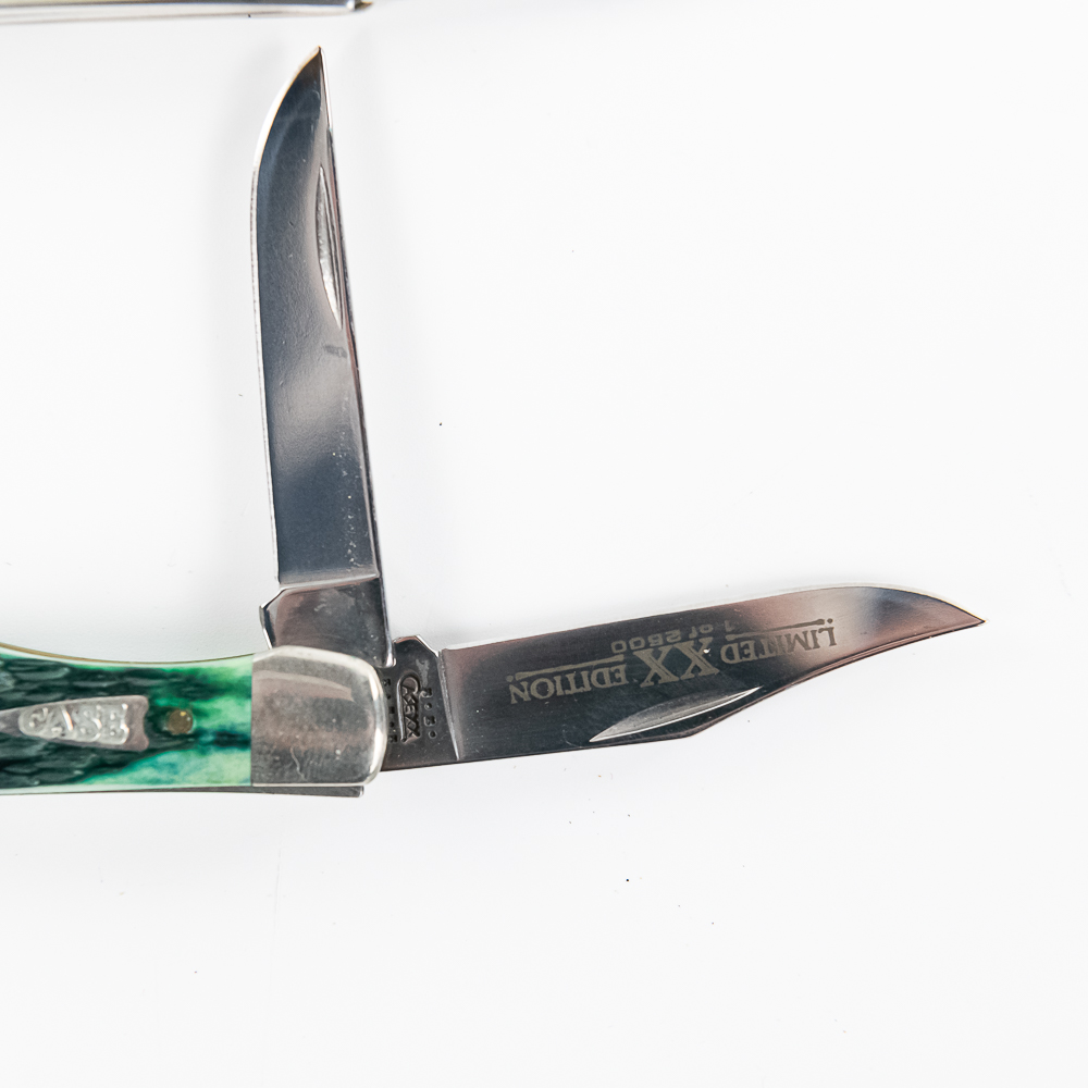 3 Case XX Model 62165 SS TH Tiny Hunter Pocket Knives. All are brand new with only minor storage marks on bolsters. 3 different handle styles, green, orange and white bone. 2.75″ closed length. Excellent collector lot or great gifts. See photos.