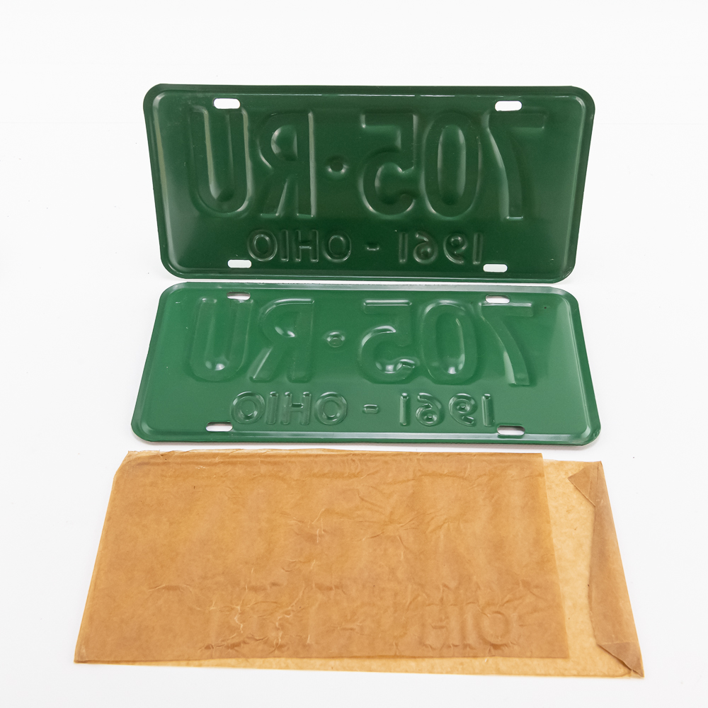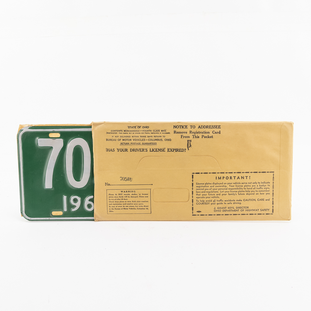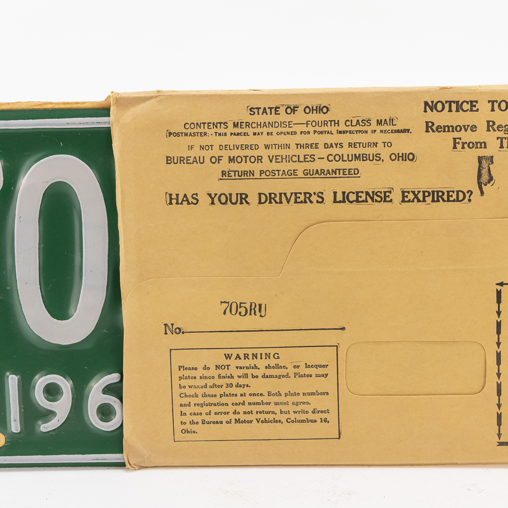 # 705-RU approximately 12″ x 6″ pressed metal. Both are in very good to excellent overall condition, exhibiting minor blemishes. Original Ohio DMV envelope with paper insert is included. Please see photos.