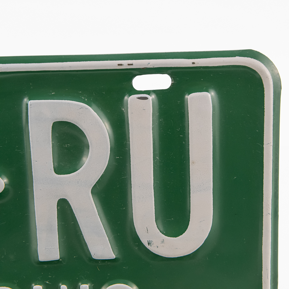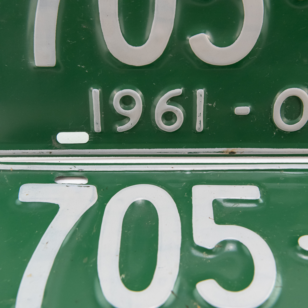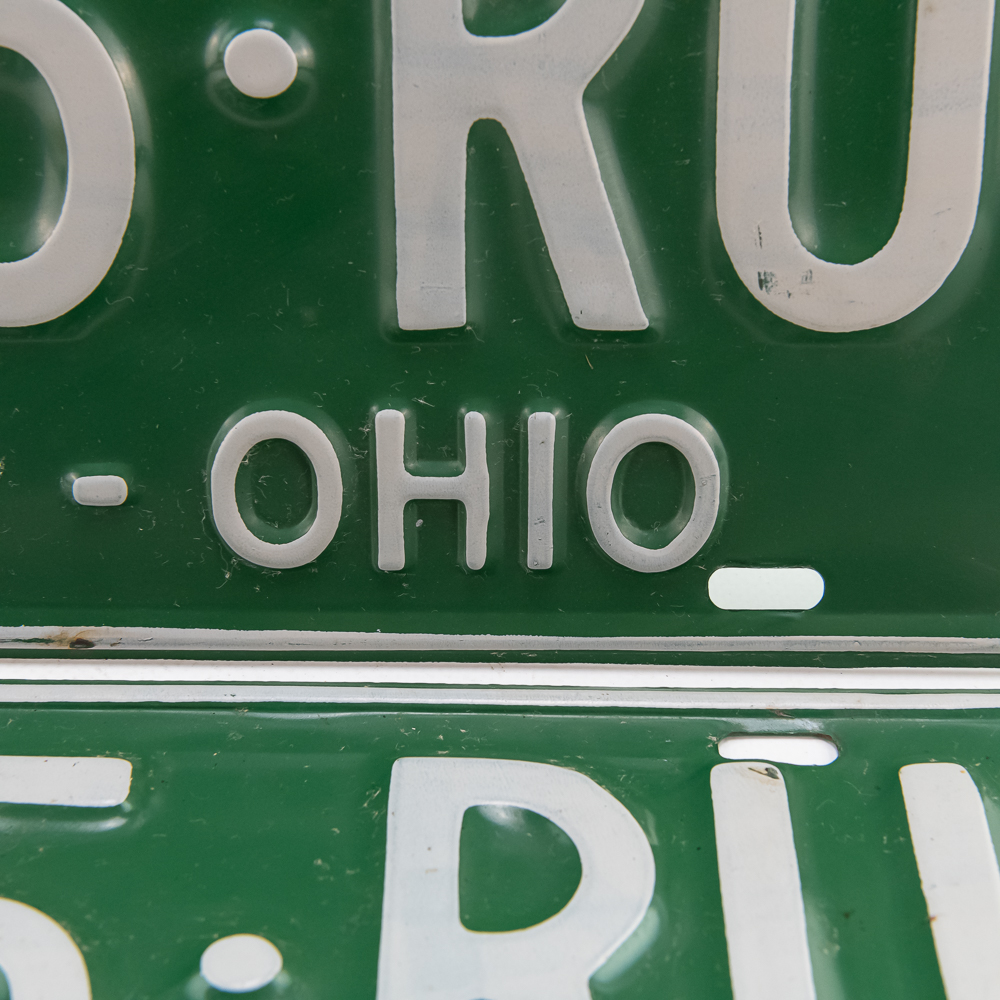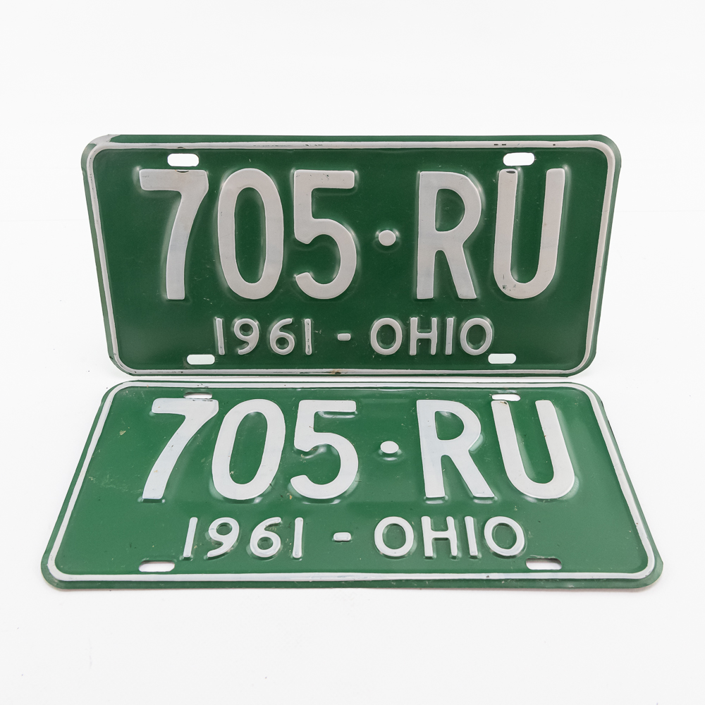 # 705-RU approximately 12″ x 6″ pressed metal. Both are in very good to excellent overall condition, exhibiting minor blemishes. Original Ohio DMV envelope with paper insert is included. Please see photos.