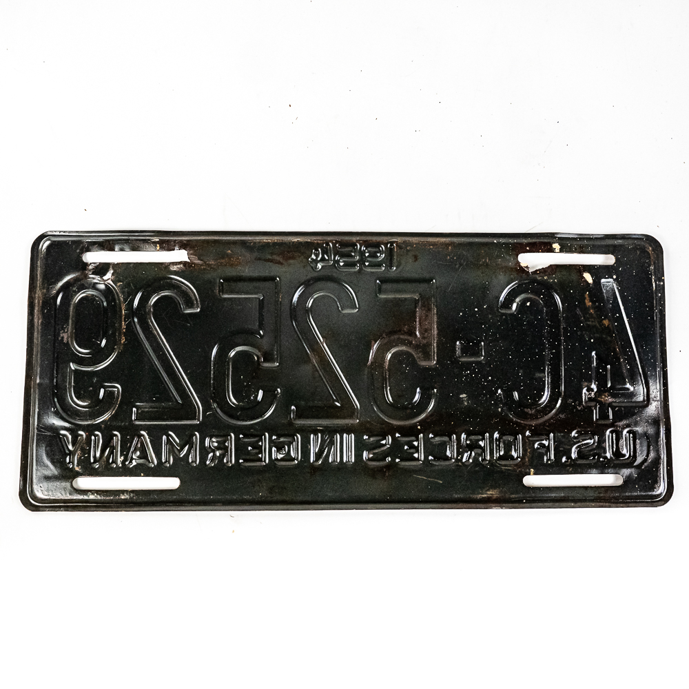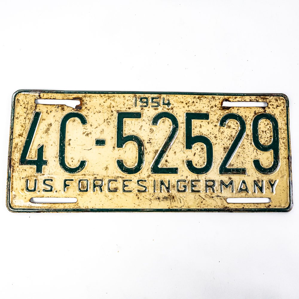 1954 US Forces in Germany license plate #4C-52529. Good overall condition with some surface rust, bolt wear, scuffs scratches and discoloration. Perfect addition to your collection, please use photos to judge condition and bid accordingly.