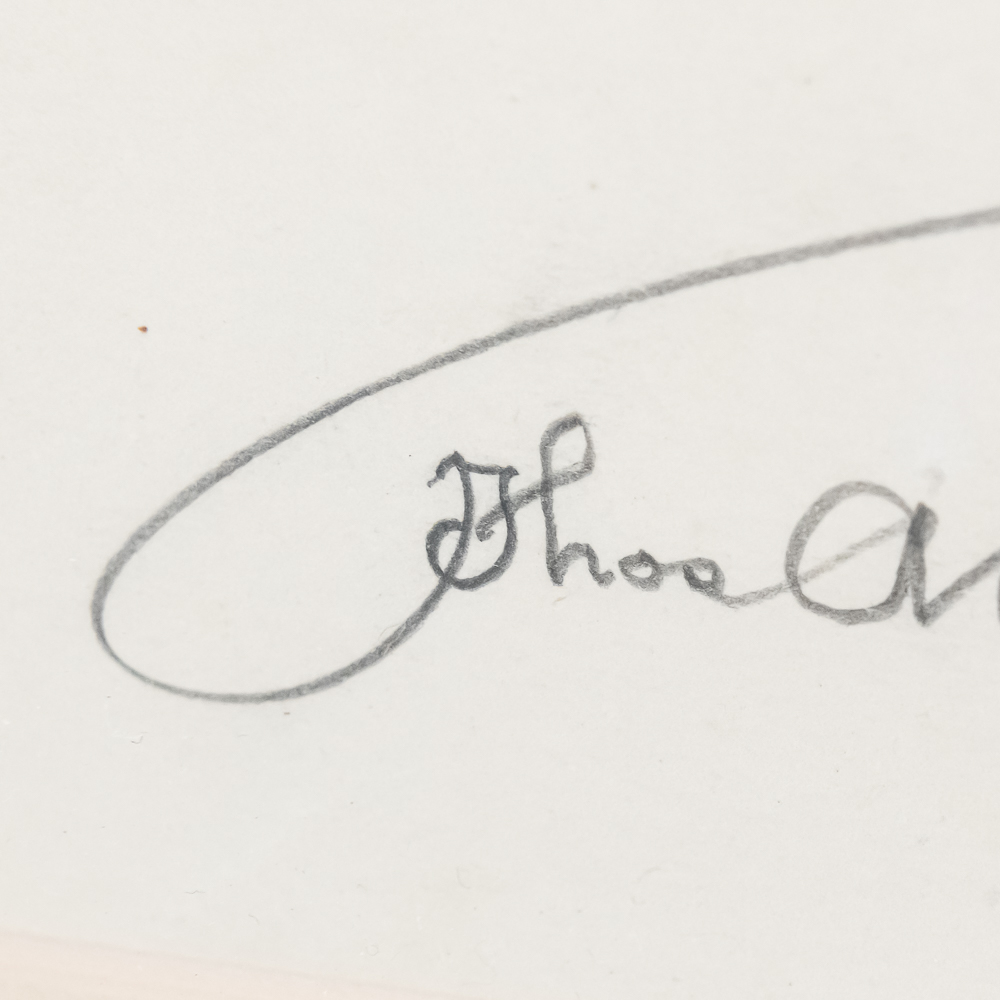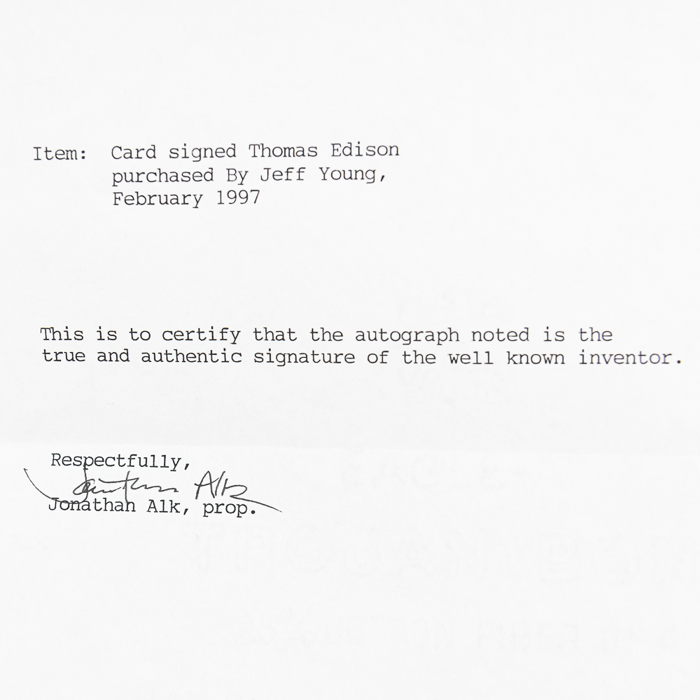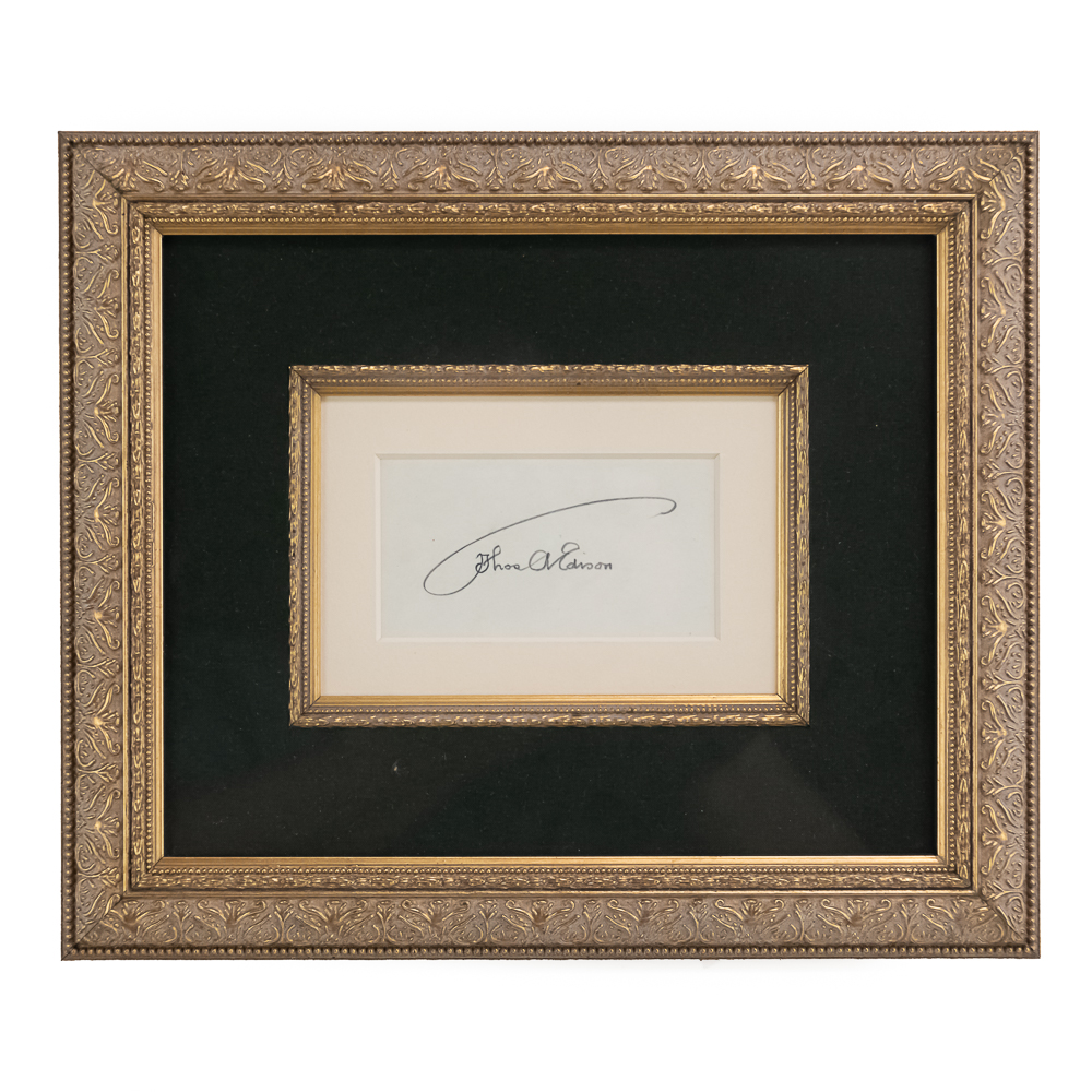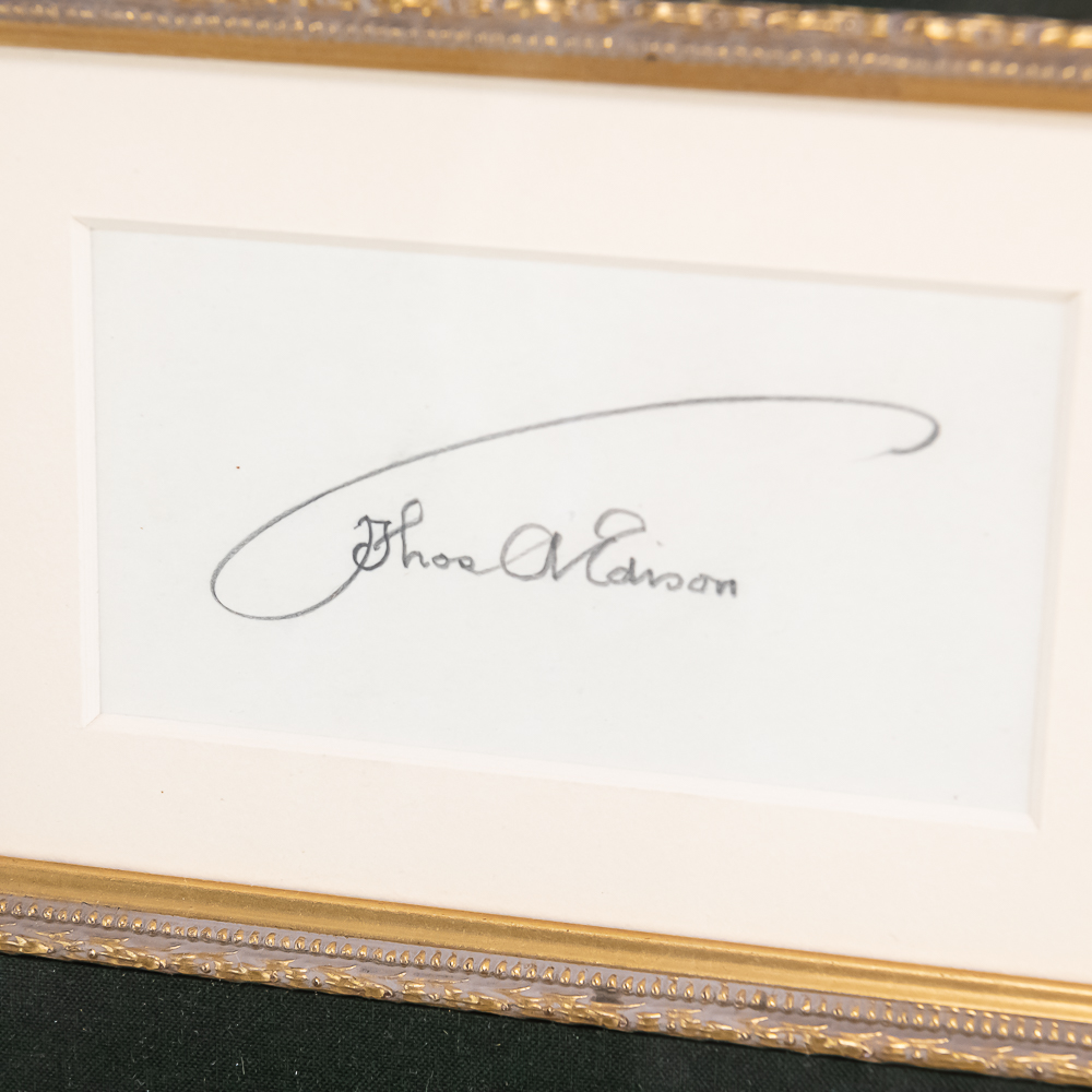 Beautiful full umbrella signature in pencil on a white card signed Thos A Edison. Card measures approx 4.25″ wide, 2.25″ tall. Professionally framed and matted. Comes with a letter of authenticity. Frame measures 12.5″ wide, 10.5″ tall. From the Jeff Young collection.