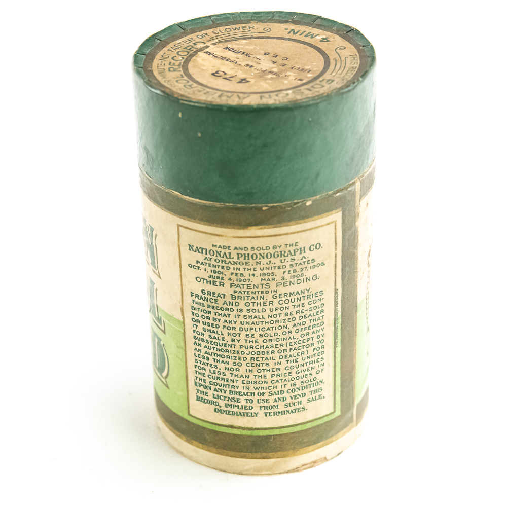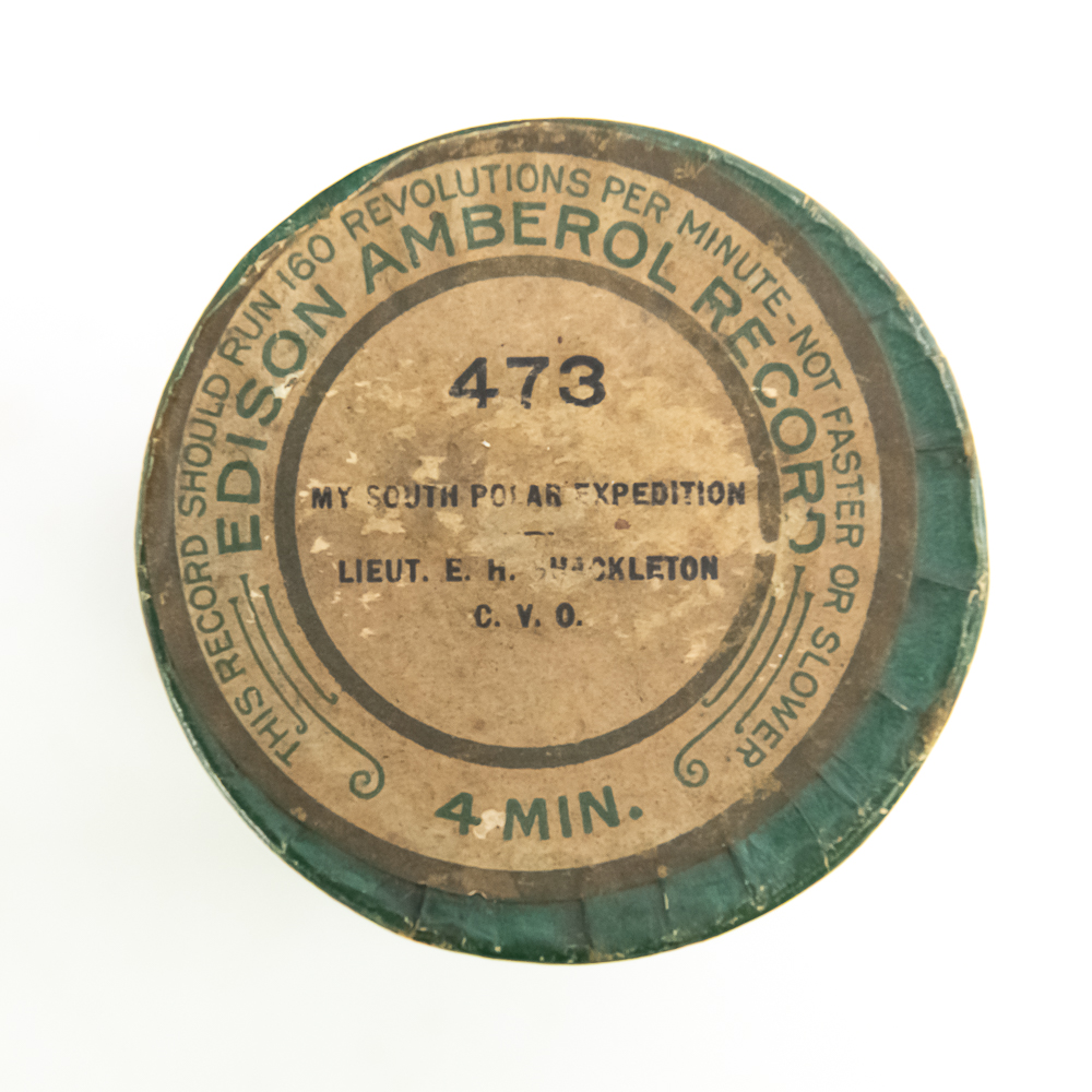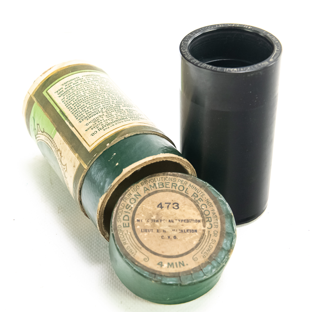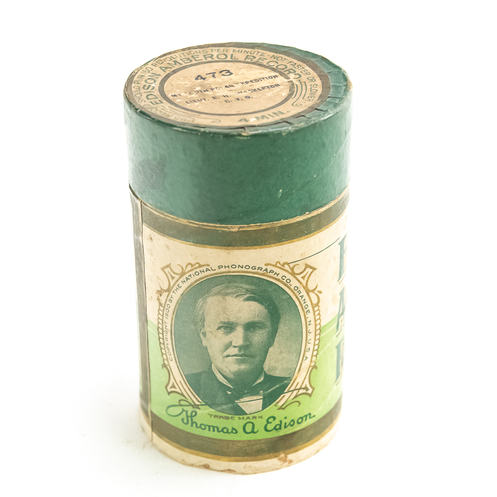 This black wax Amberol cylinder #473 is a historical accounting of Lieutenant Shackleton’s South Pole Expedition. The cylinder appears to be in good condition. Nice and clean in appearance. A few minor edge chips on the inside diameter near the title but nowhere near the playing surface, in otherwise good condition. Has its original box with the lid and correct title in average condition with the usual wear. A rare find of historical importance.