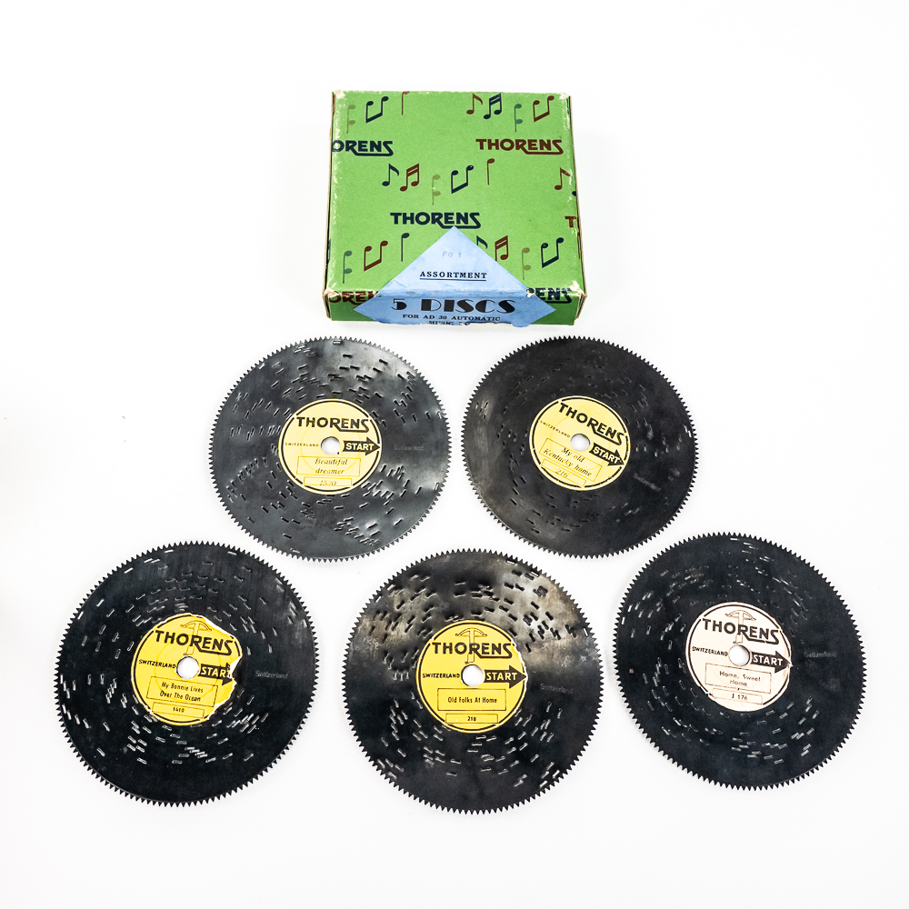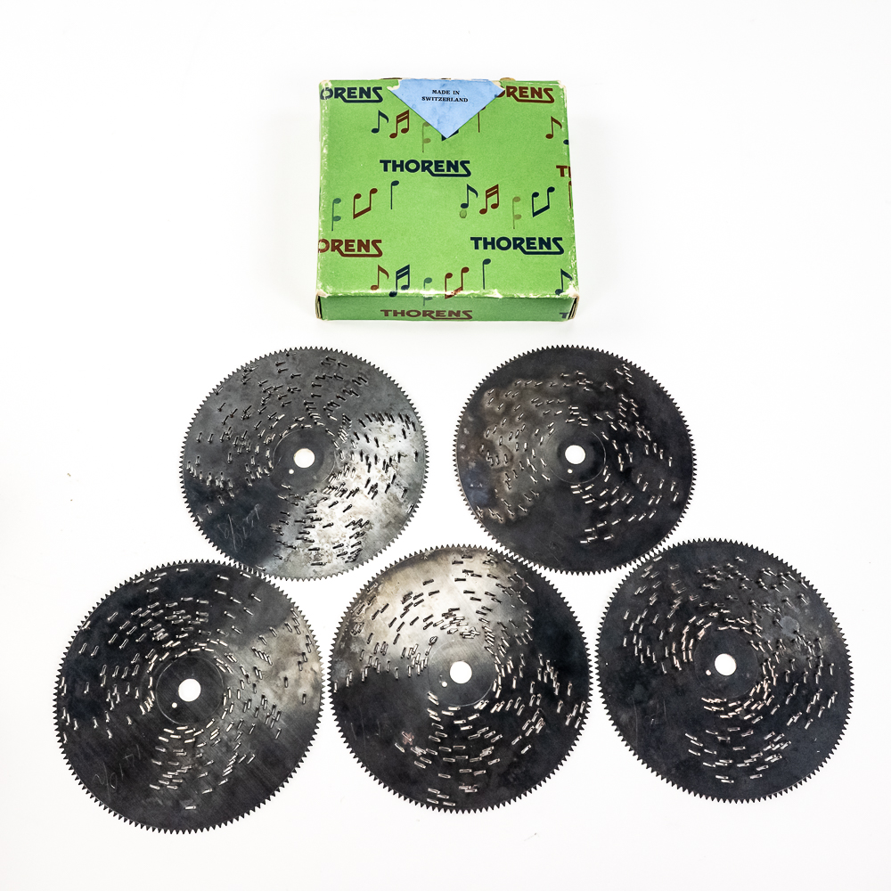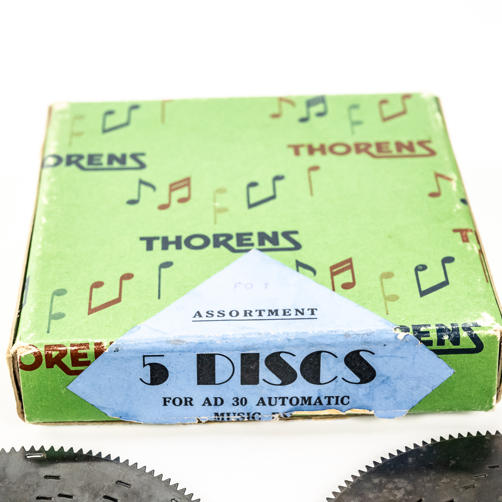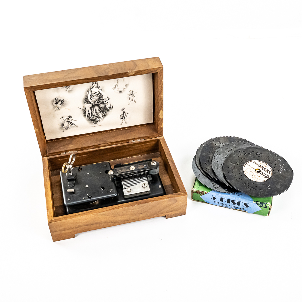 Collection includes vintage Thorens wooden music box along with Thorens 5 Disc for 30 Automatic music box still showcased inside original opened packaging. Music box is in very good overall physical condition, winds and mechanics move however no sound. Perfect addition to your collection, please use photos to judge condition and bid accordingly. From the Jeff Young Collection.