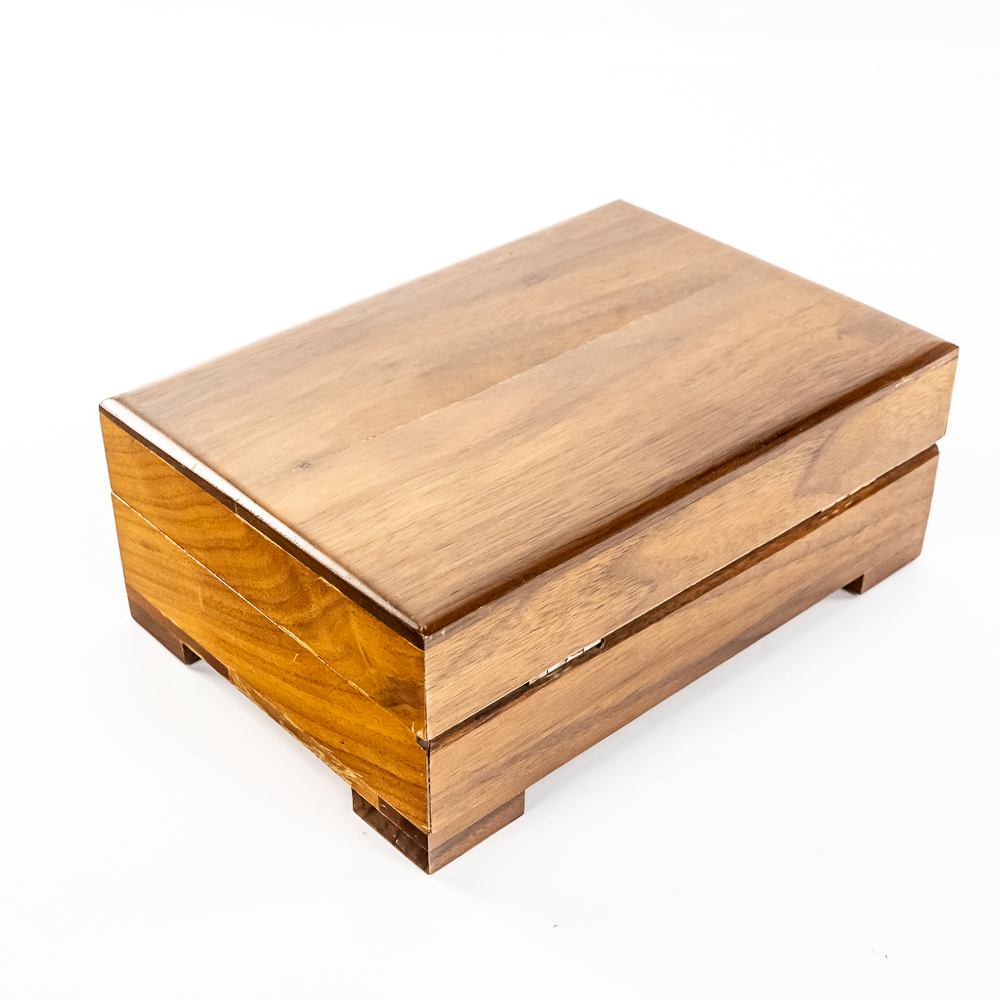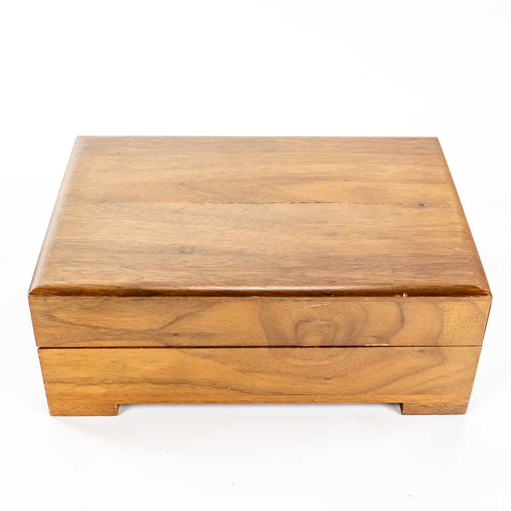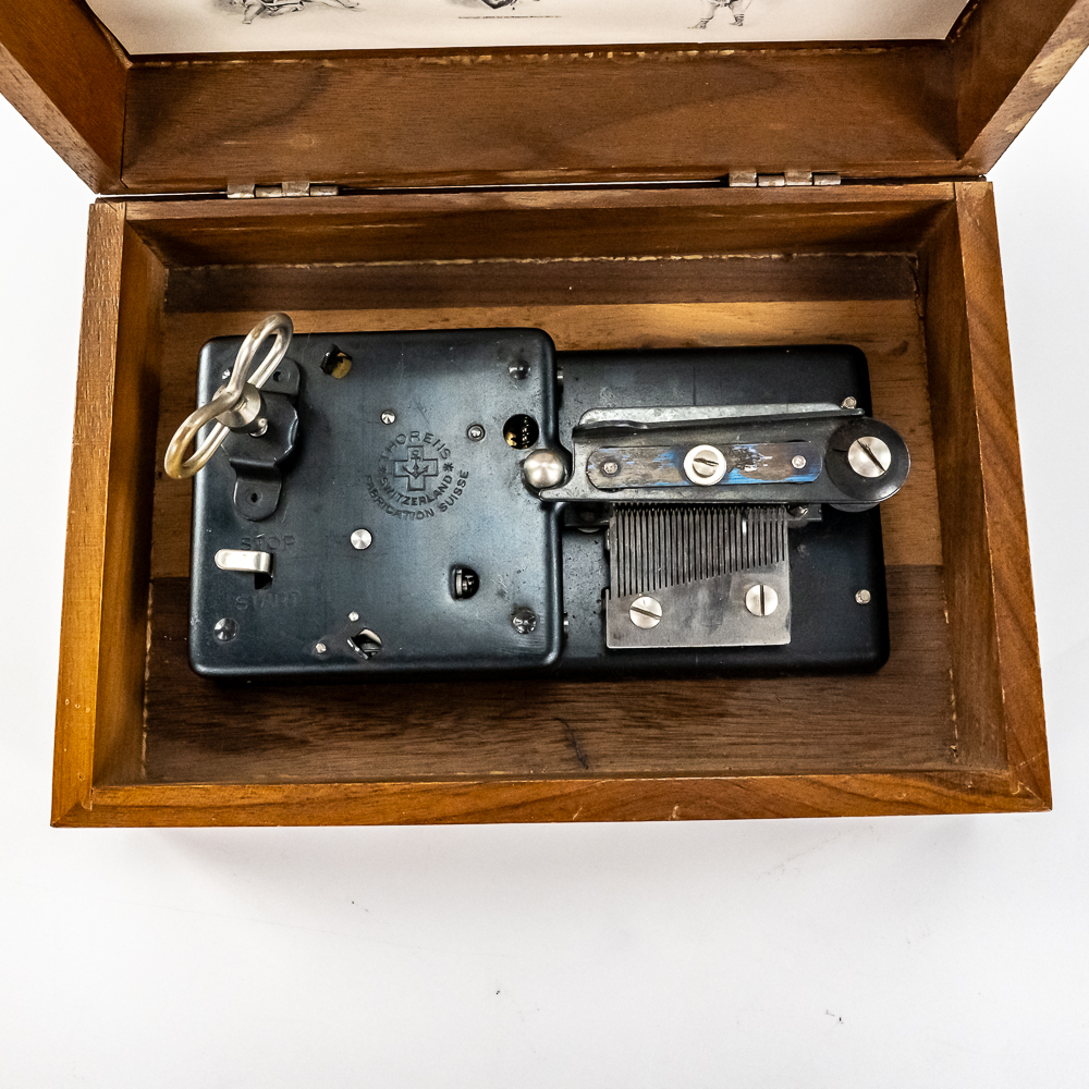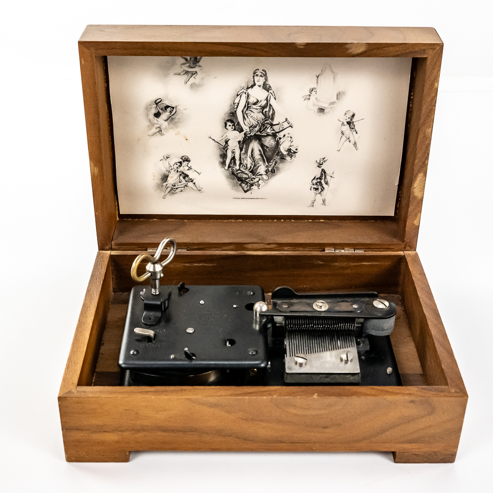 Collection includes vintage Thorens wooden music box along with Thorens 5 Disc for 30 Automatic music box still showcased inside original opened packaging. Music box is in very good overall physical condition, winds and mechanics move however no sound. Perfect addition to your collection, please use photos to judge condition and bid accordingly. From the Jeff Young Collection.