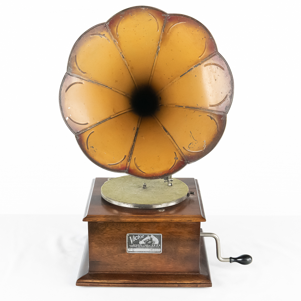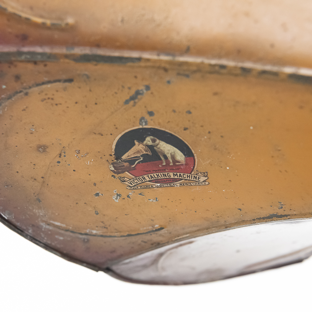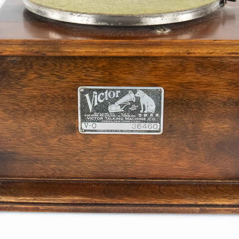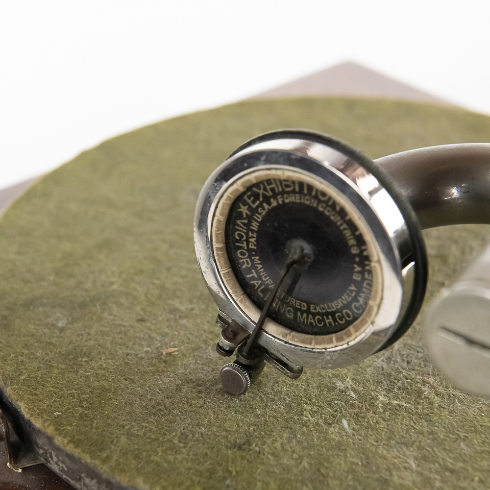 This machine in its brown mahogany finished birch cabinet has its original finish is in overall good condition. Has a Victor Exhibition reproducer, tone arm, and horn elbow all have their original nickel plating in good condition with some minor wear mainly on the elbow. Back bracket has its original black paint and pinstripes in average condition with some minor wear. Has it original winding crank and the motor winds and runs. Has its original 15″ long 8 panel embossed painted steel horn. The horn has its original light orange paint with brown shading near the edges in fair condition with nicks and scrapes here and there as well some paint loss on the outside of the horn. See photos. Also has its original Victor decal in average condition. Cabinet measures 11-1/2″ X 11-1/2″ X 6-1/2″ H. From the Jeff Young Collection.