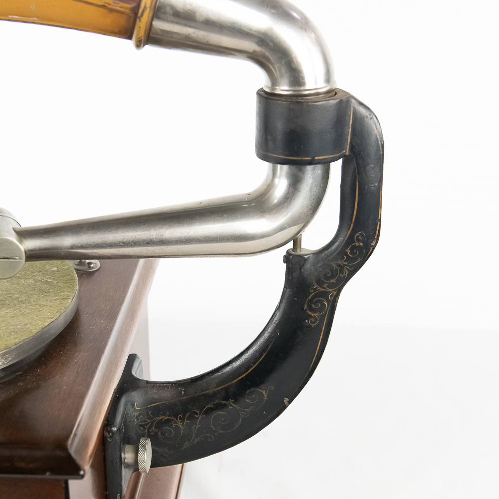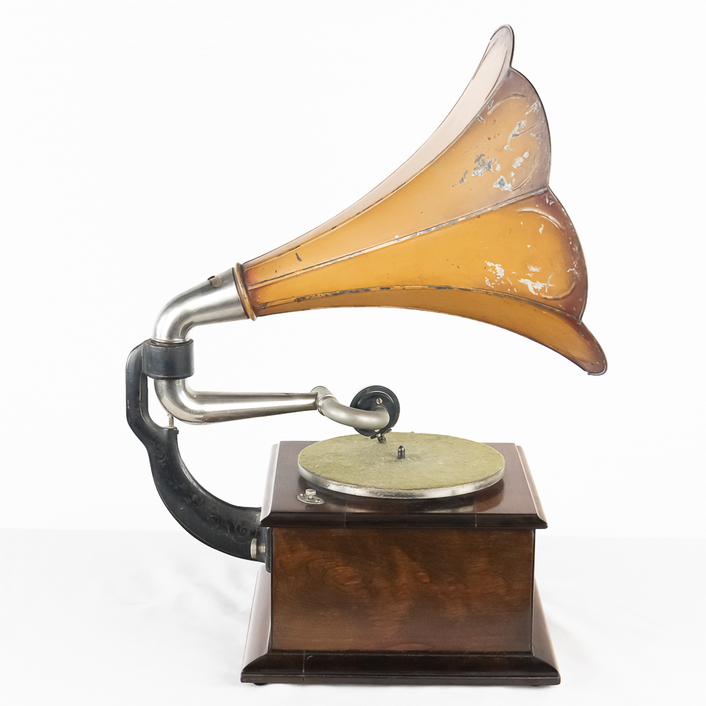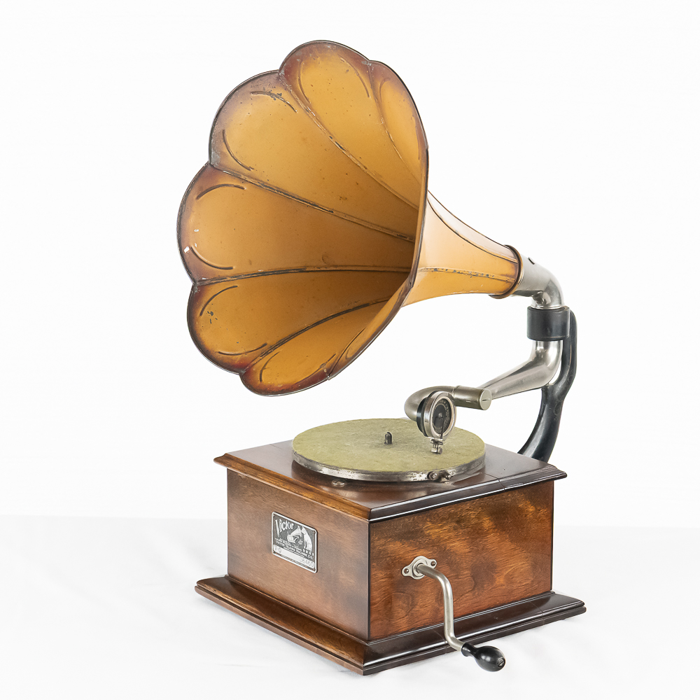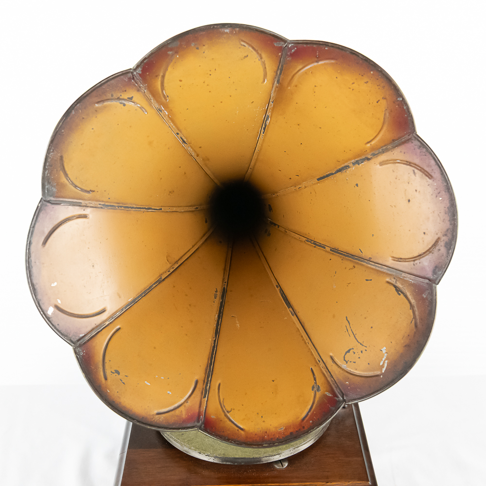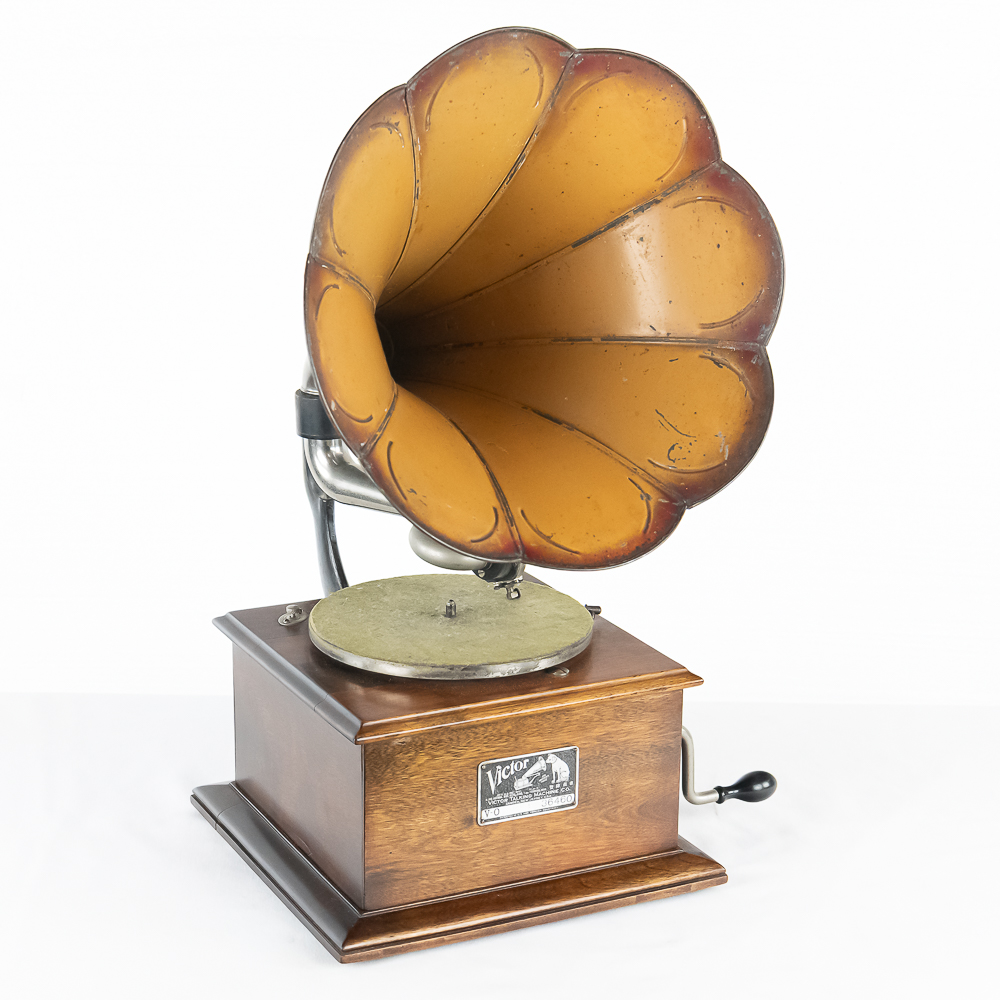This machine in its brown mahogany finished birch cabinet has its original finish is in overall good condition. Has a Victor Exhibition reproducer, tone arm, and horn elbow all have their original nickel plating in good condition with some minor wear mainly on the elbow. Back bracket has its original black paint and pinstripes in average condition with some minor wear. Has it original winding crank and the motor winds and runs. Has its original 15″ long 8 panel embossed painted steel horn. The horn has its original light orange paint with brown shading near the edges in fair condition with nicks and scrapes here and there as well some paint loss on the outside of the horn. See photos. Also has its original Victor decal in average condition. Cabinet measures 11-1/2″ X 11-1/2″ X 6-1/2″ H. From the Jeff Young Collection.