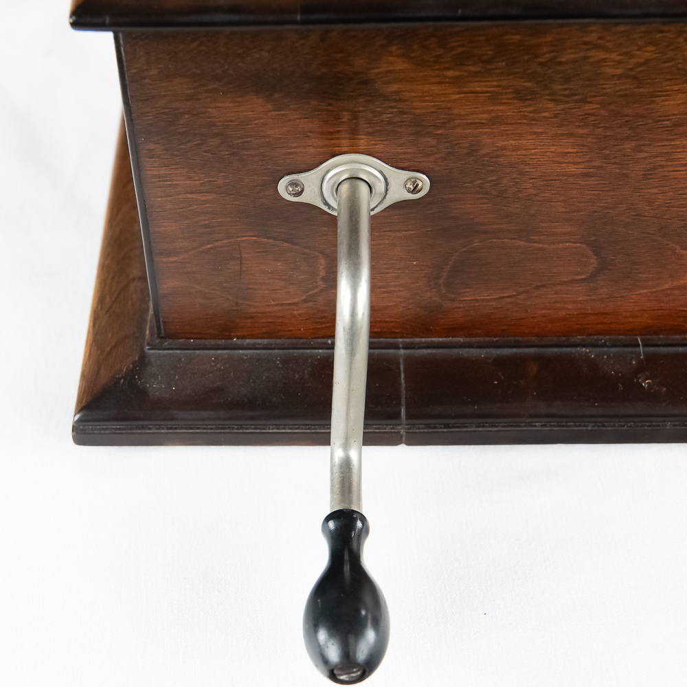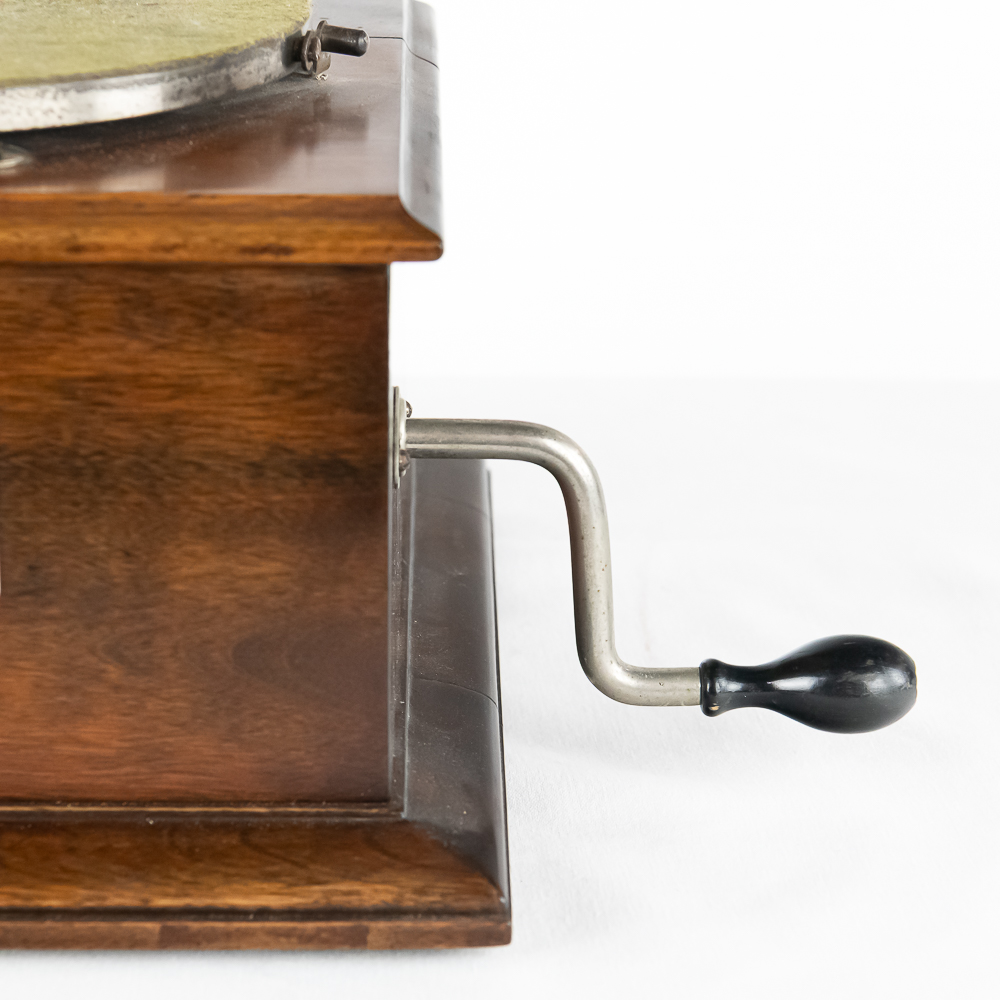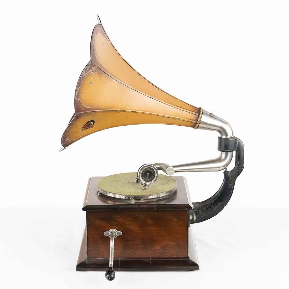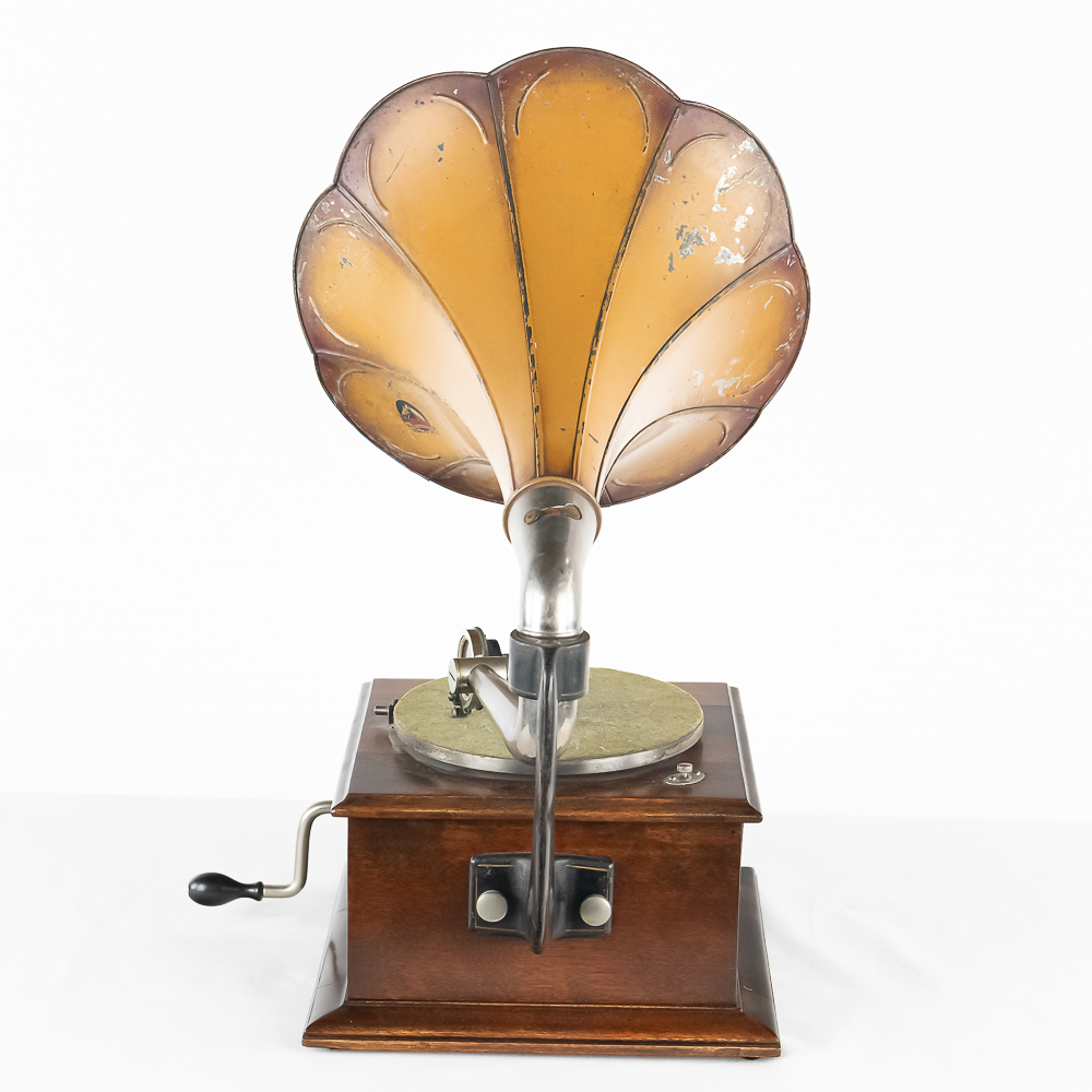 This machine in its brown mahogany finished birch cabinet has its original finish is in overall good condition. Has a Victor Exhibition reproducer, tone arm, and horn elbow all have their original nickel plating in good condition with some minor wear mainly on the elbow. Back bracket has its original black paint and pinstripes in average condition with some minor wear. Has it original winding crank and the motor winds and runs. Has its original 15″ long 8 panel embossed painted steel horn. The horn has its original light orange paint with brown shading near the edges in fair condition with nicks and scrapes here and there as well some paint loss on the outside of the horn. See photos. Also has its original Victor decal in average condition. Cabinet measures 11-1/2″ X 11-1/2″ X 6-1/2″ H. From the Jeff Young Collection.