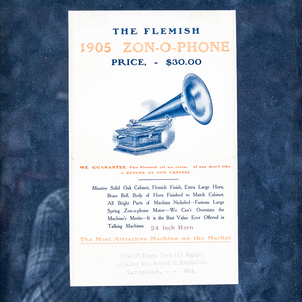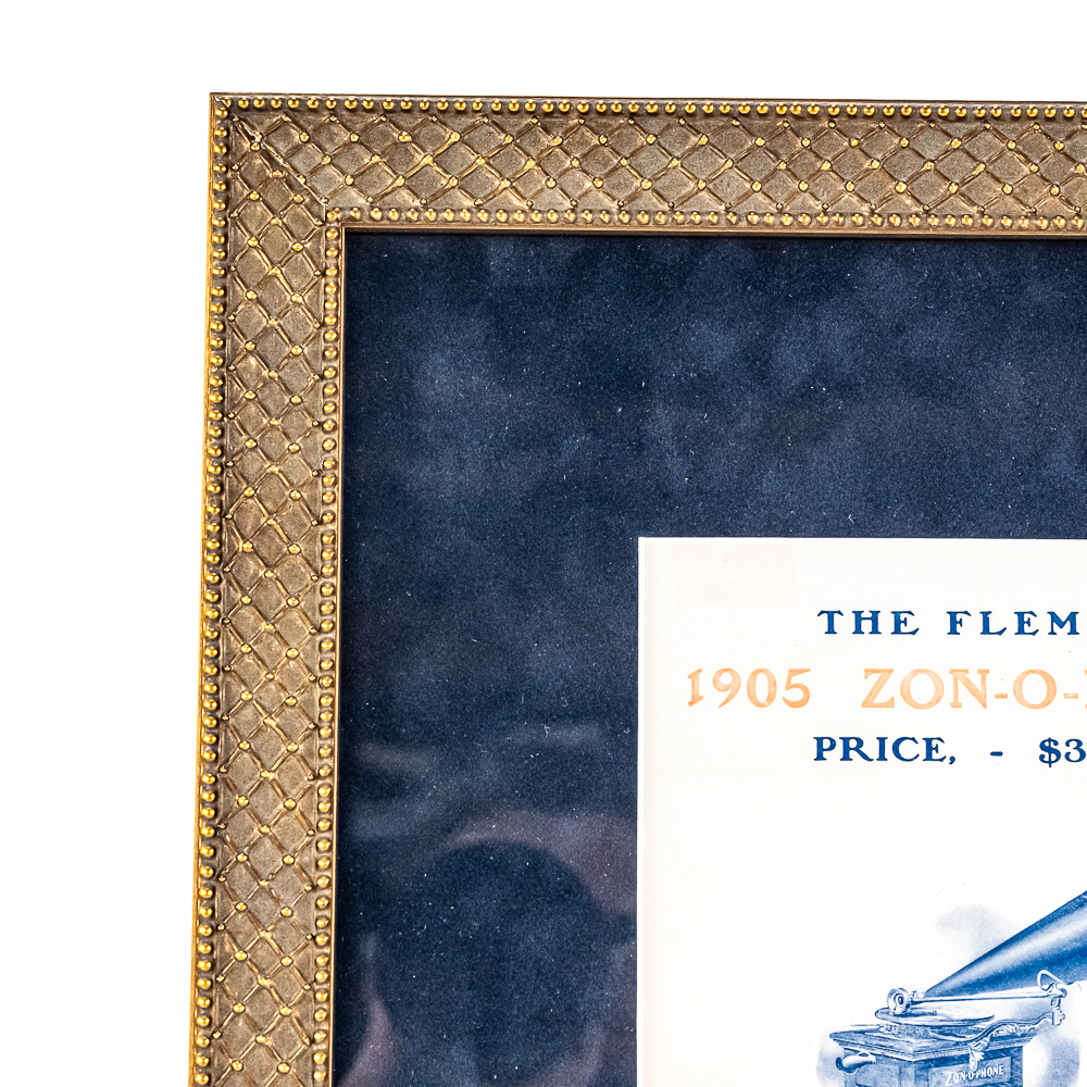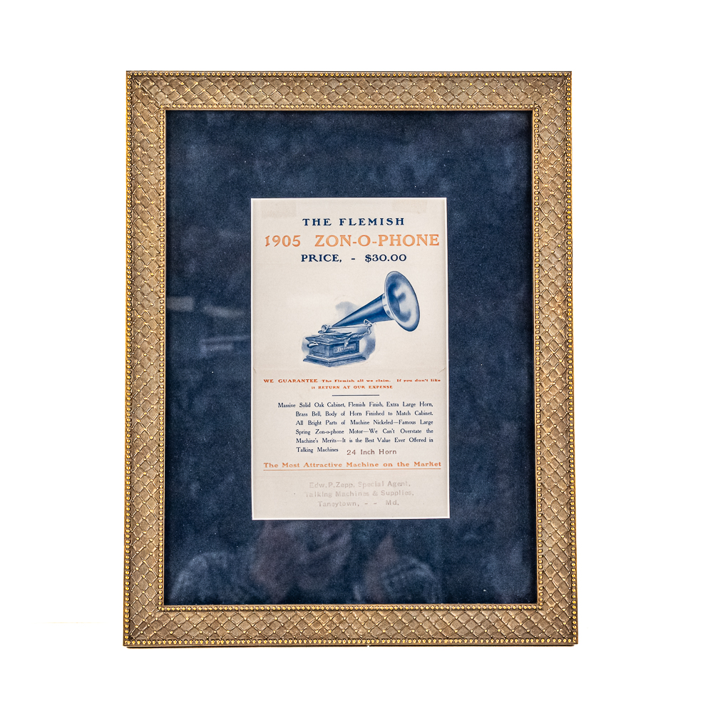 This original 1905 Zonophone advertising pamphlet for The Flemish has been professionally framed and matted. The original pamphlet is slightly yellowed and has three folds. At the very bottom of the pamphlet there is dealer information from Taneytown, MD. See photos. Framed piece measures 12-1/2″ X 16″ .