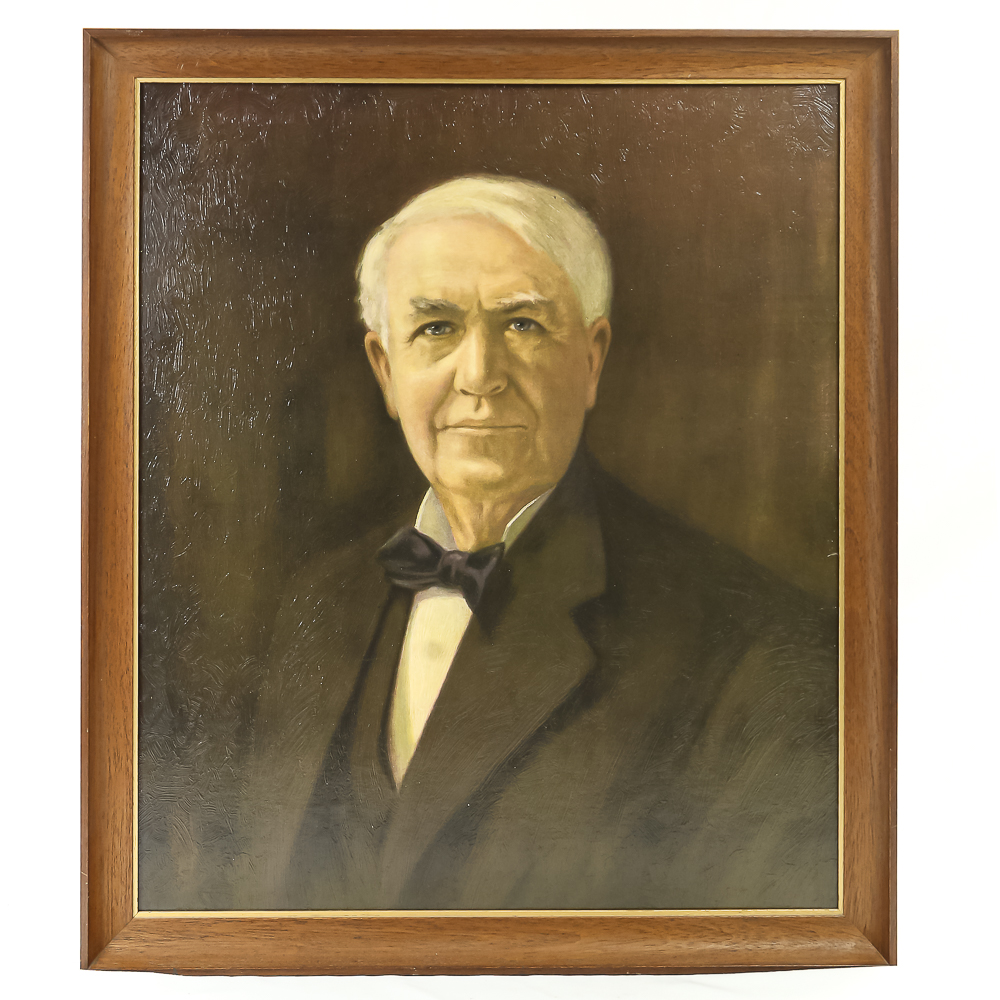 Thomas A. Edison Faux Oil Painting, texture print on cardboard, large portrait presented to Larry Donley by Commonwealth Edison Company, 1968, framed 25” x 29”, see photos.