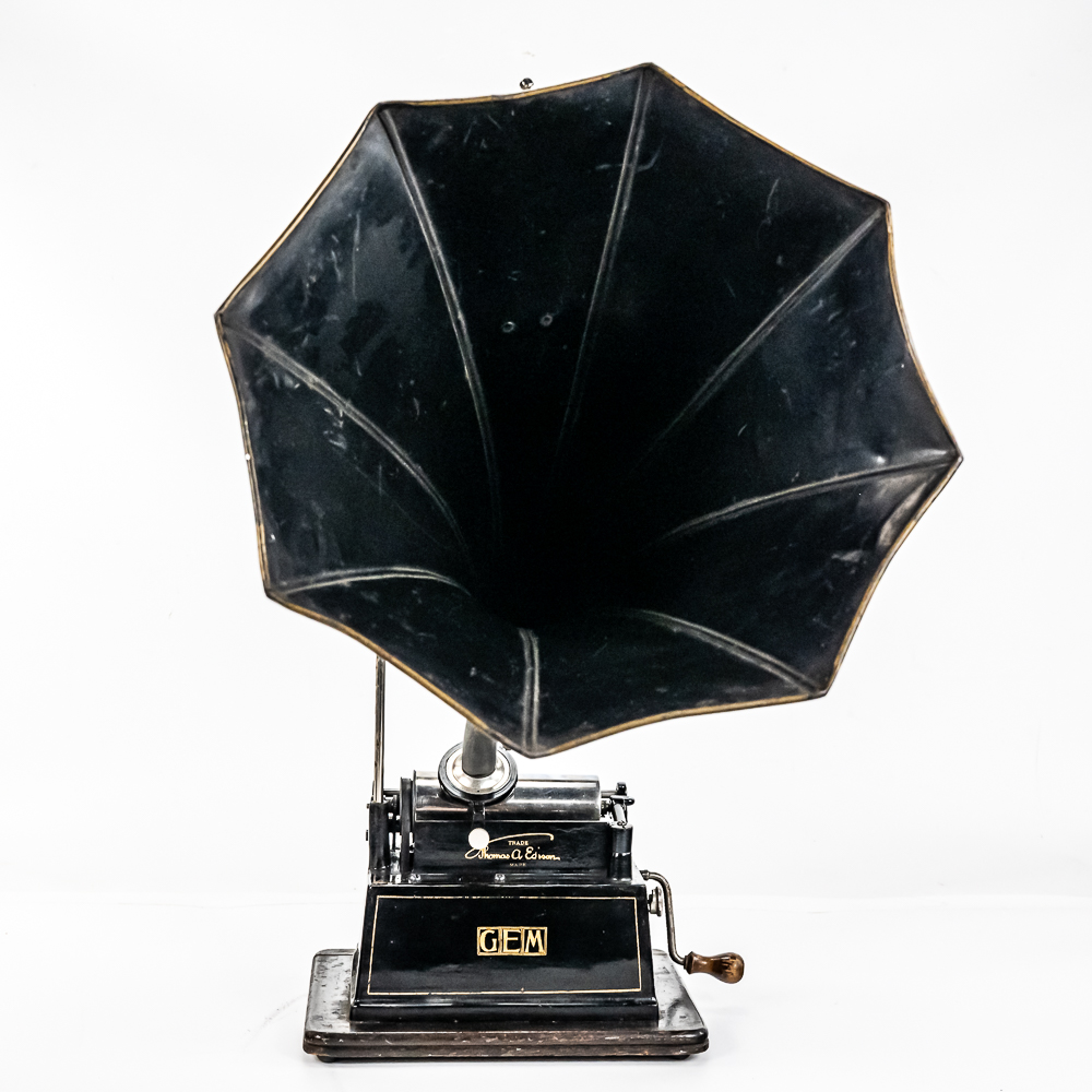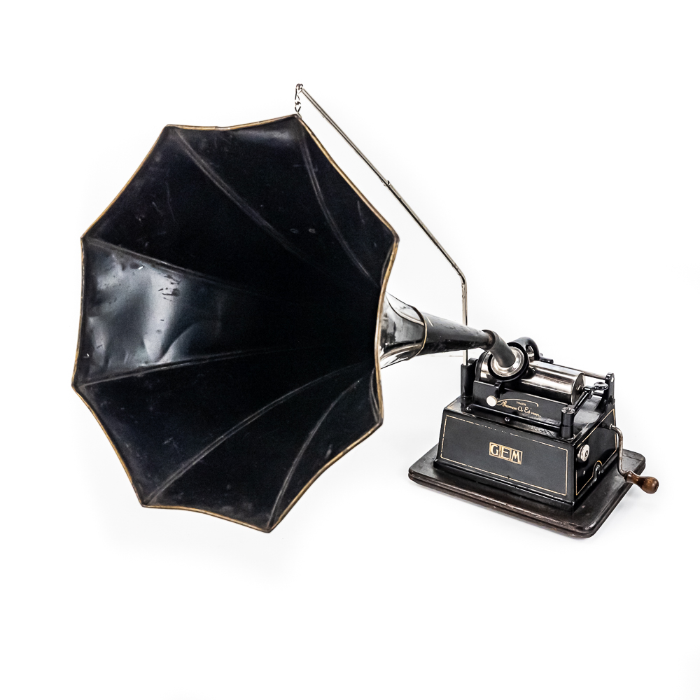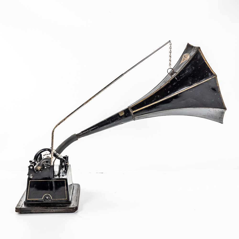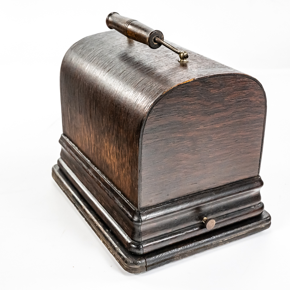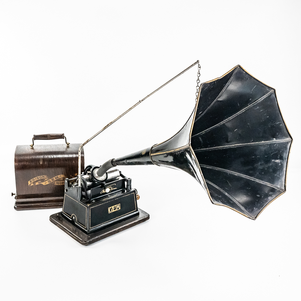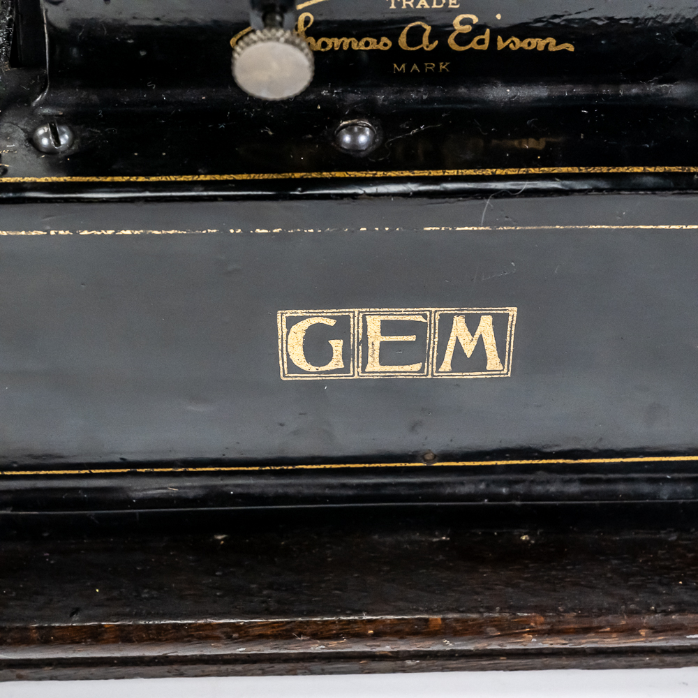 This machine with its oak cover and base board has its original finish and banner decal and appears to have been lightly recoated and has a shrinkage crack on the base board but in otherwise overall good condition. This machine has a 2/4 minute with a C reproducer with a good stylus. Carriage and mandrill move freely. Motor housing has its original black paint, pinstripes and decals all of which are in good condition with the usual minor wear.. Has its original winding crank and the motor winds and runs. Has a two piece reproduction horn support.. Also included is a 20″ L eight panel one piece Gem marked black steel horn which has its original black paint, pinstripes and decals in average condition with a few minor abrasions and dings. Cover measures 9-1/2′ X 7″ X 8″ T.