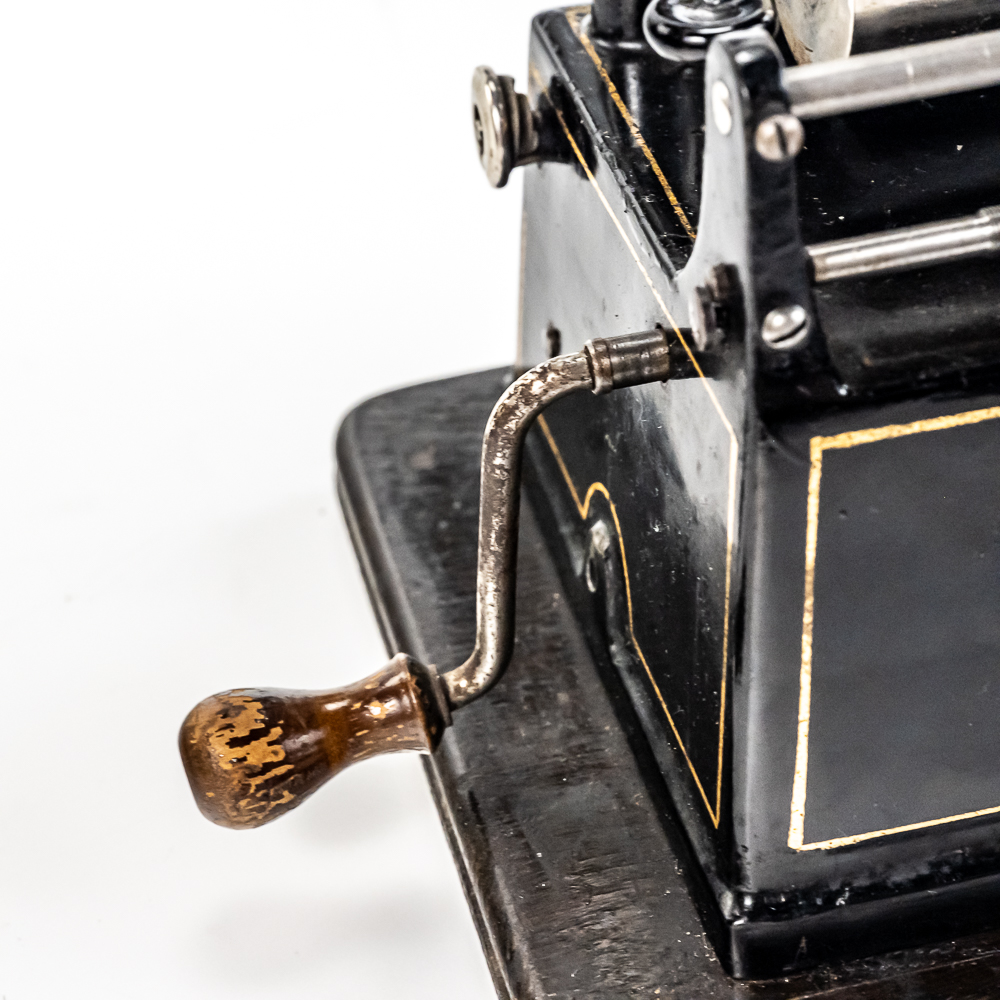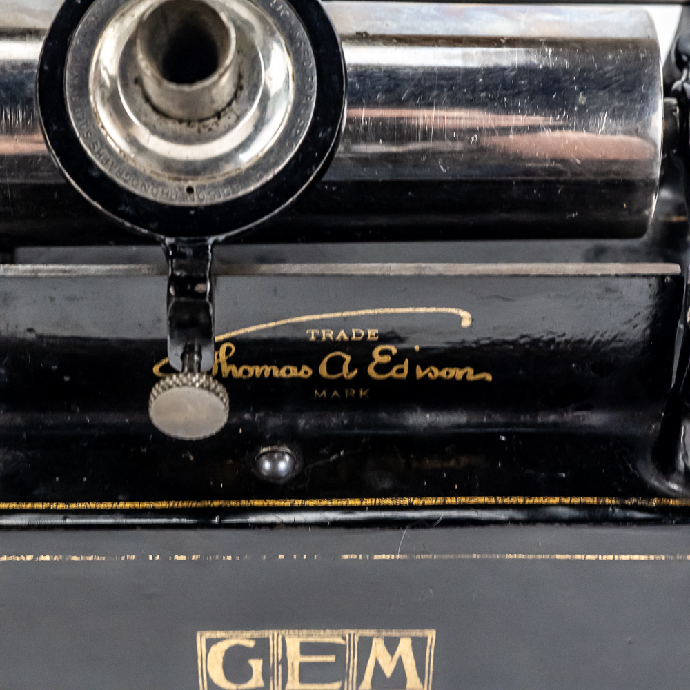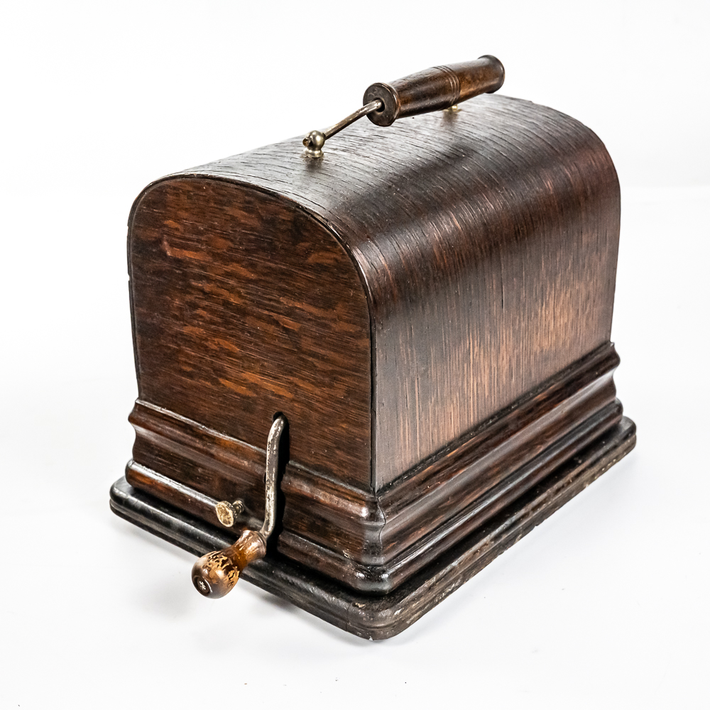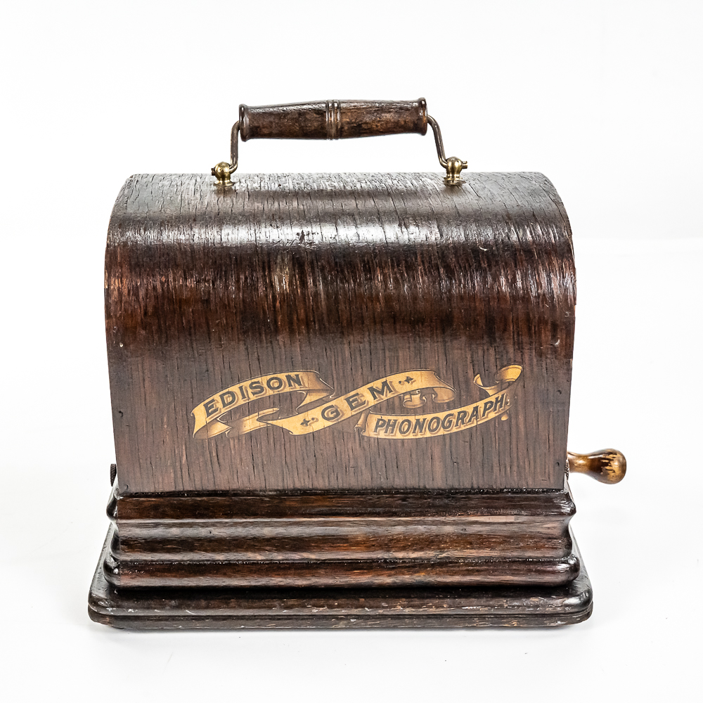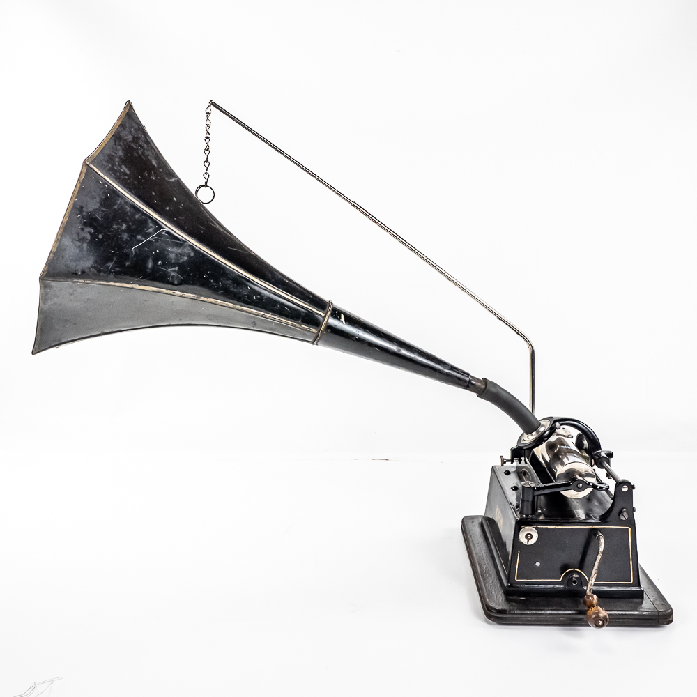 This machine with its oak cover and base board has its original finish and banner decal and appears to have been lightly recoated and has a shrinkage crack on the base board but in otherwise overall good condition. This machine has a 2/4 minute with a C reproducer with a good stylus. Carriage and mandrill move freely. Motor housing has its original black paint, pinstripes and decals all of which are in good condition with the usual minor wear.. Has its original winding crank and the motor winds and runs. Has a two piece reproduction horn support.. Also included is a 20″ L eight panel one piece Gem marked black steel horn which has its original black paint, pinstripes and decals in average condition with a few minor abrasions and dings. Cover measures 9-1/2′ X 7″ X 8″ T.