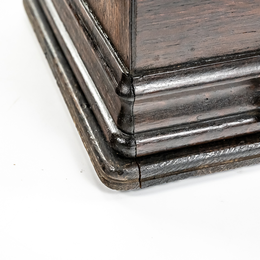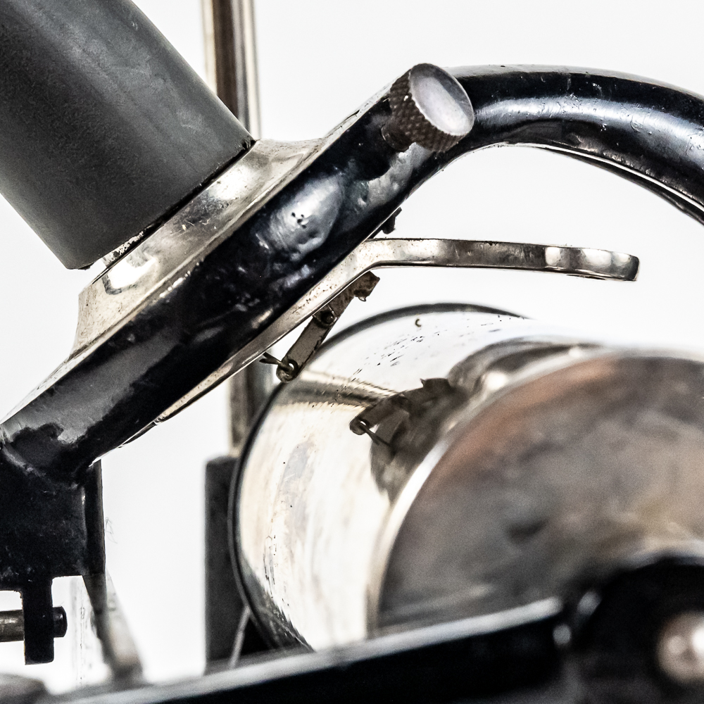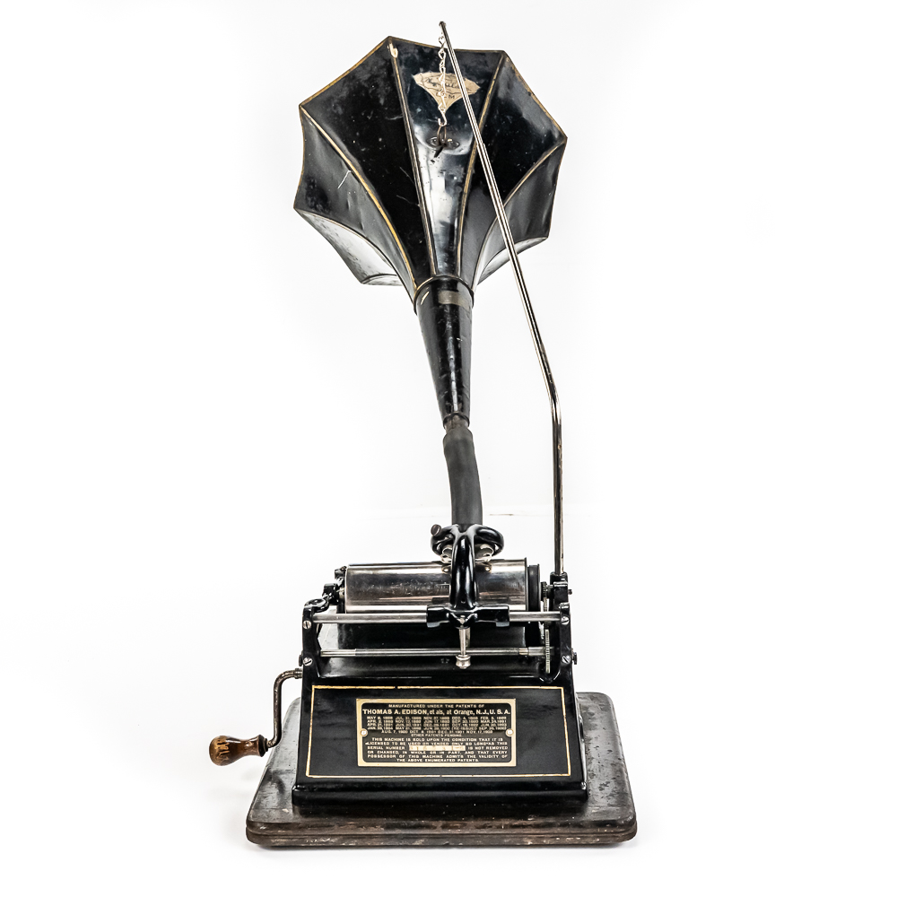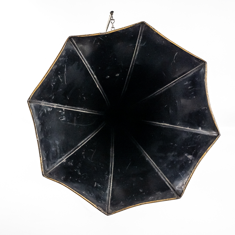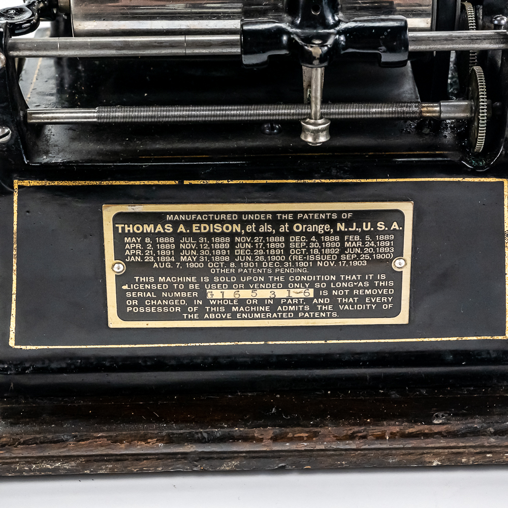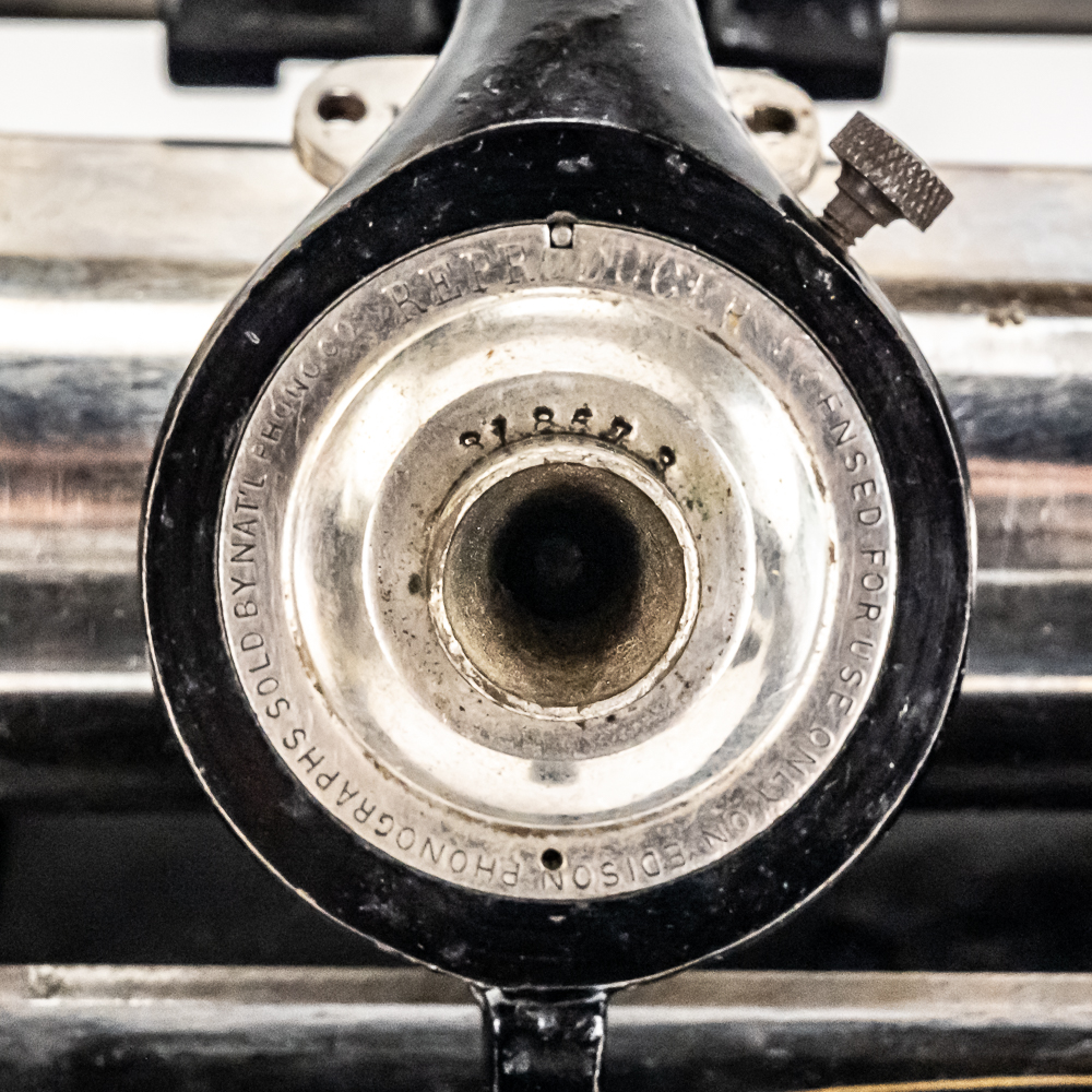 This machine with its oak cover and base board has its original finish and banner decal and appears to have been lightly recoated and has a shrinkage crack on the base board but in otherwise overall good condition. This machine has a 2/4 minute with a C reproducer with a good stylus. Carriage and mandrill move freely. Motor housing has its original black paint, pinstripes and decals all of which are in good condition with the usual minor wear.. Has its original winding crank and the motor winds and runs. Has a two piece reproduction horn support.. Also included is a 20″ L eight panel one piece Gem marked black steel horn which has its original black paint, pinstripes and decals in average condition with a few minor abrasions and dings. Cover measures 9-1/2′ X 7″ X 8″ T.