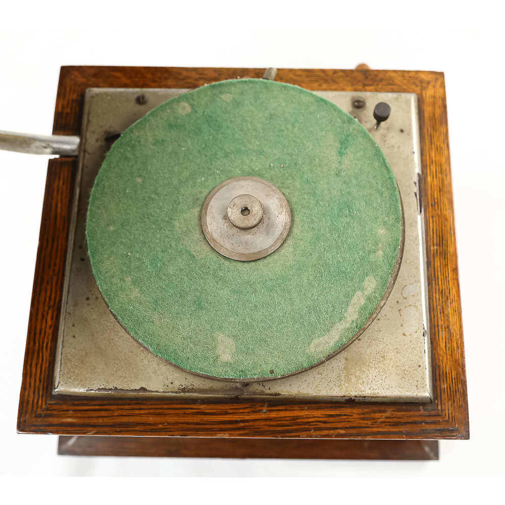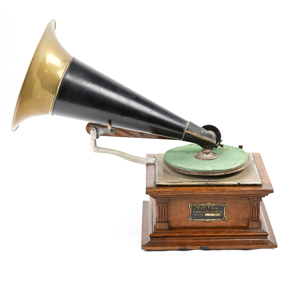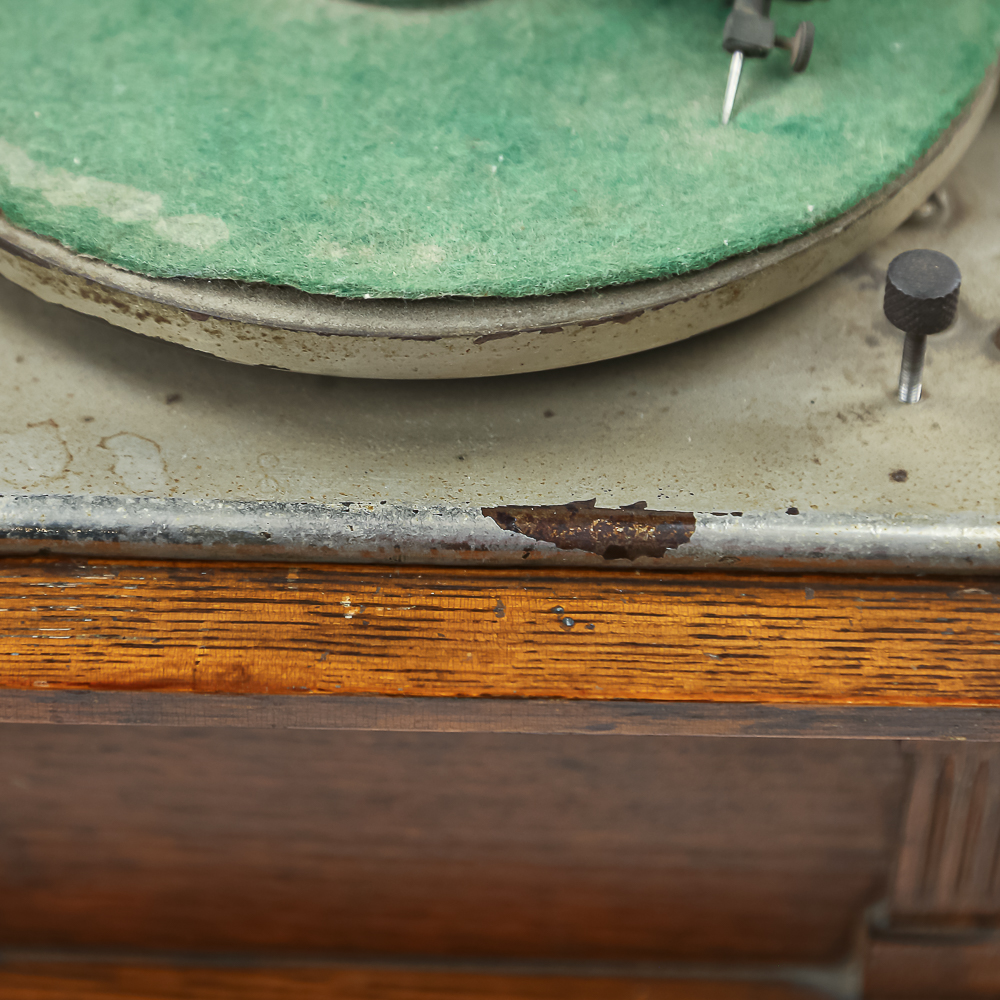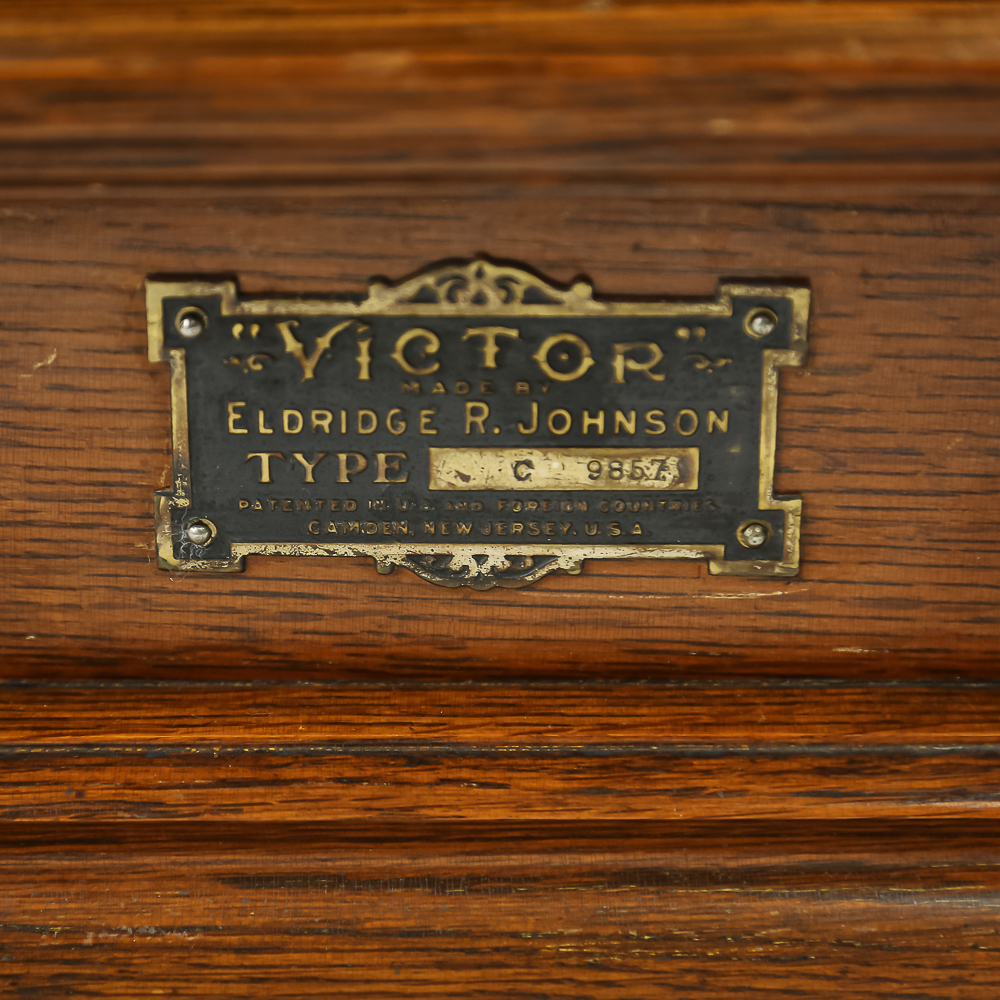 Nice example of an early Victor machine. Original finish oak cabinet. Retains original Victor/Eldridge Johnson brass ID tag on side of cabinet. Original plating on bed plate. Original side brake. Machine winds up and runs but motor needs servicing. Replacement tone arm support and record hold down. Original finish 15″ black with brass bell horn. Exhibition reproducer needs rebuild.