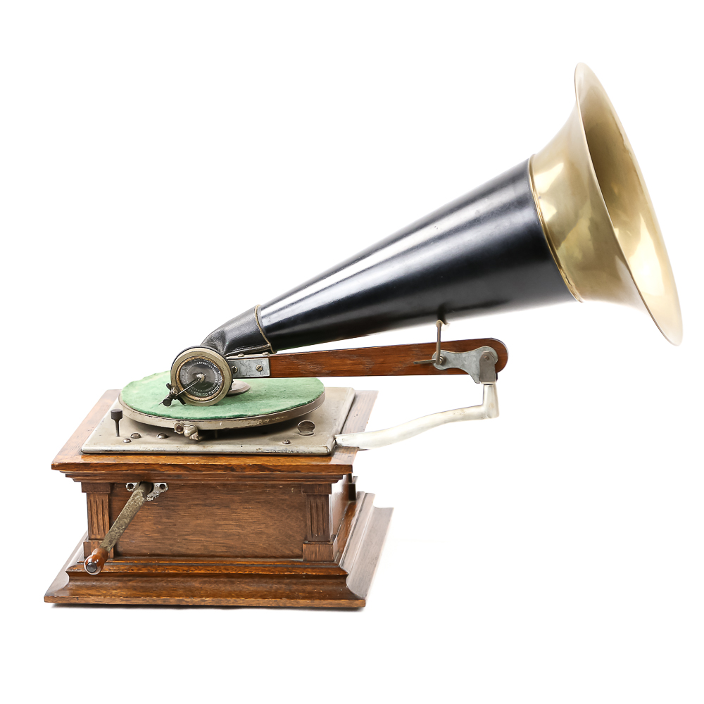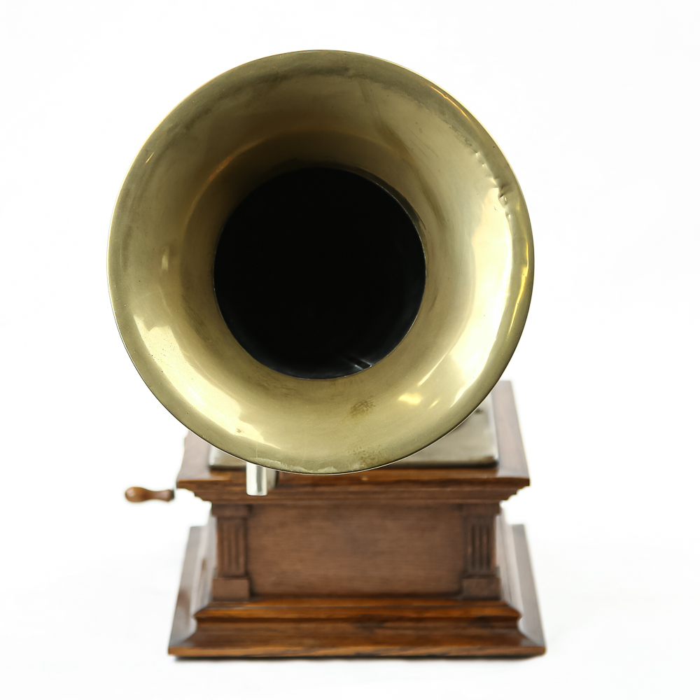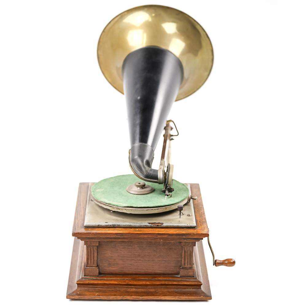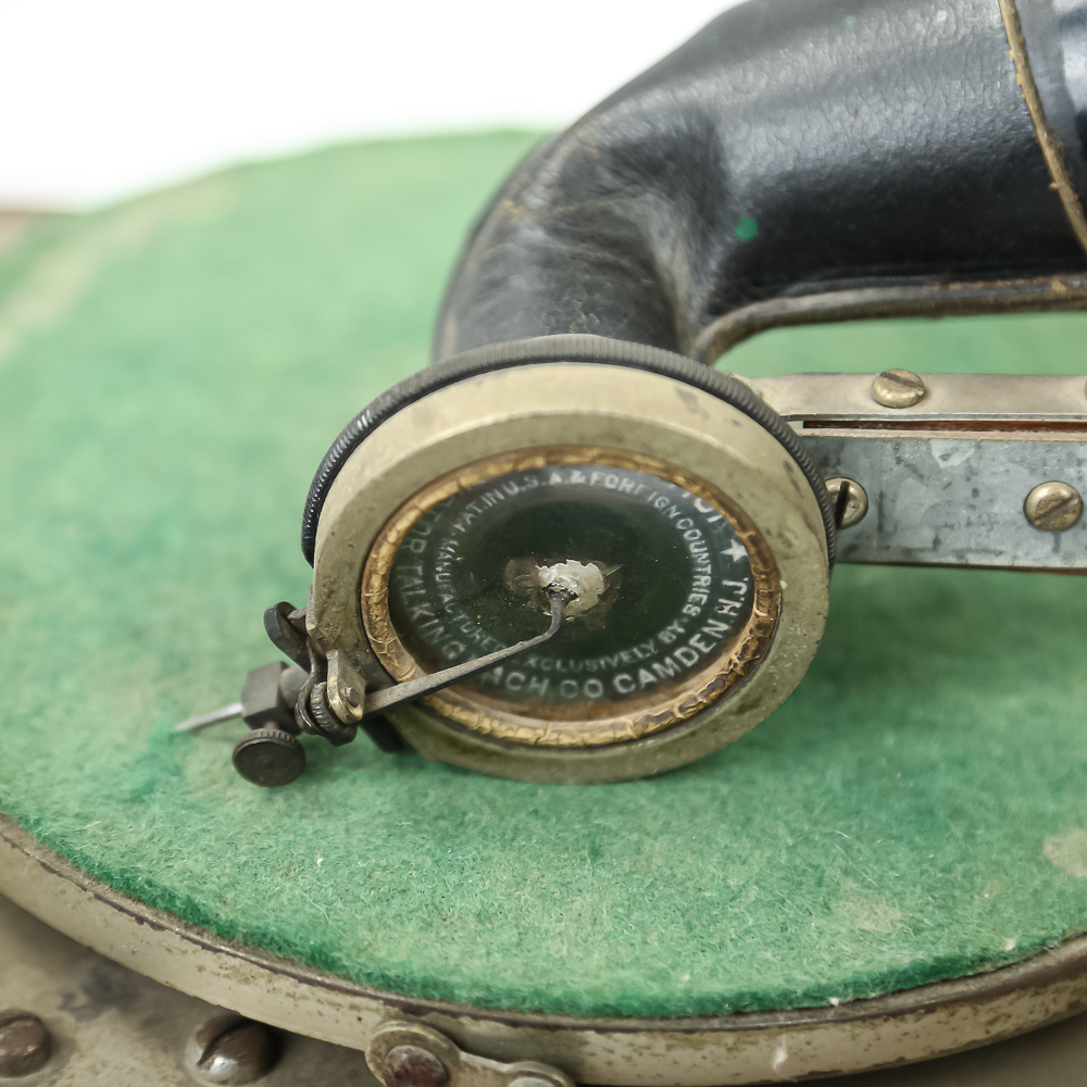 Nice example of an early Victor machine. Original finish oak cabinet. Retains original Victor/Eldridge Johnson brass ID tag on side of cabinet. Original plating on bed plate. Original side brake. Machine winds up and runs but motor needs servicing. Replacement tone arm support and record hold down. Original finish 15″ black with brass bell horn. Exhibition reproducer needs rebuild.