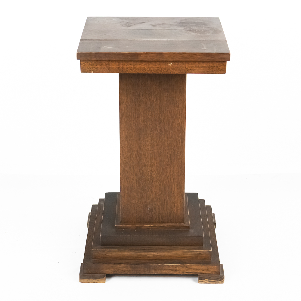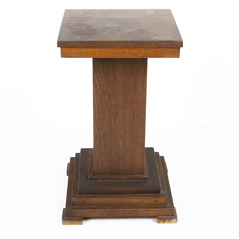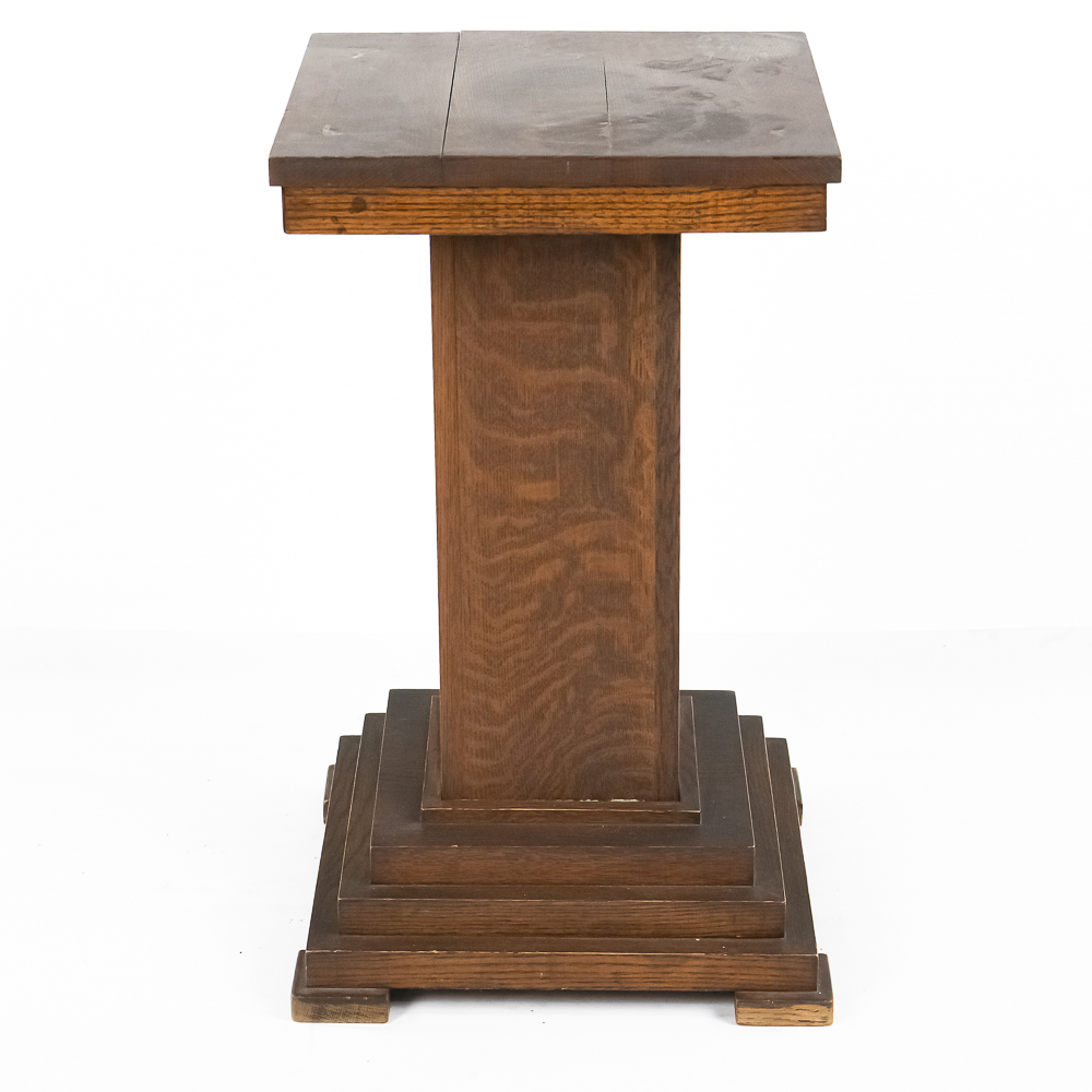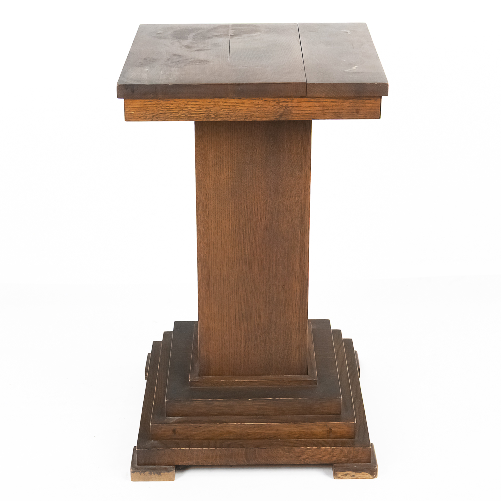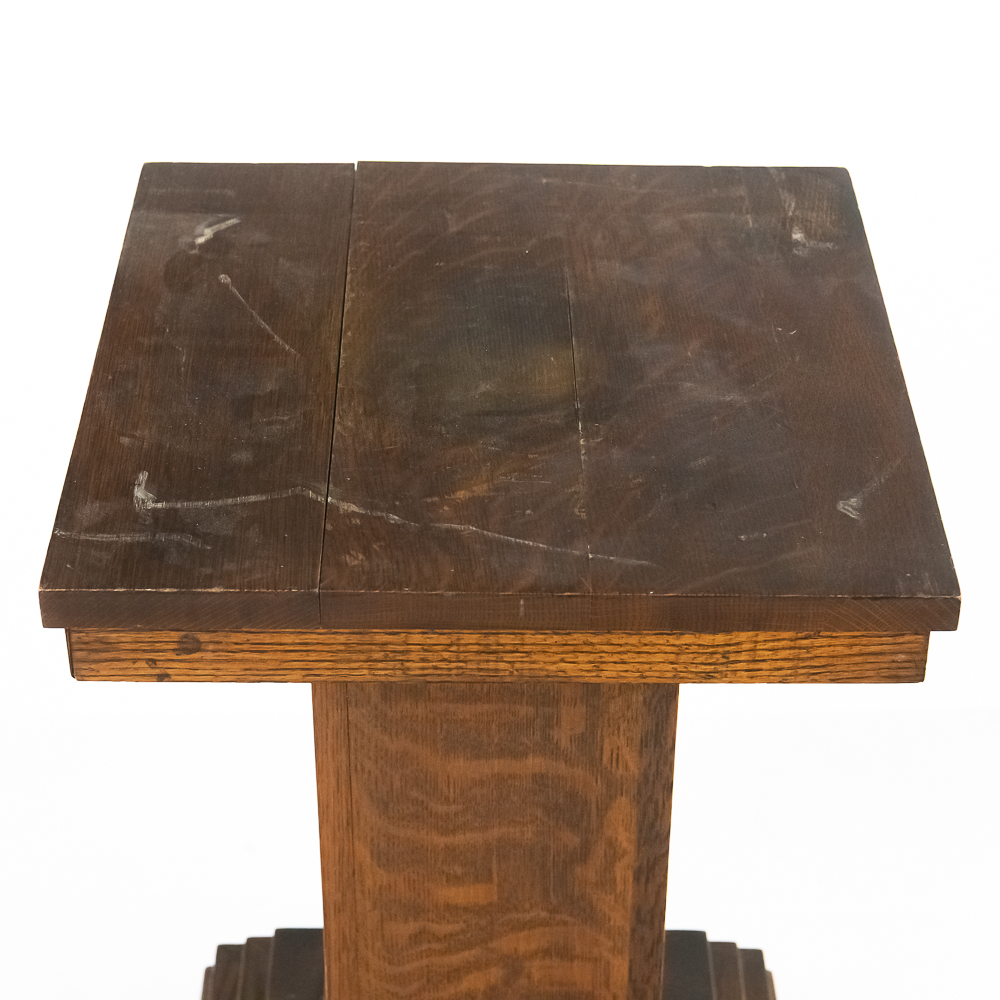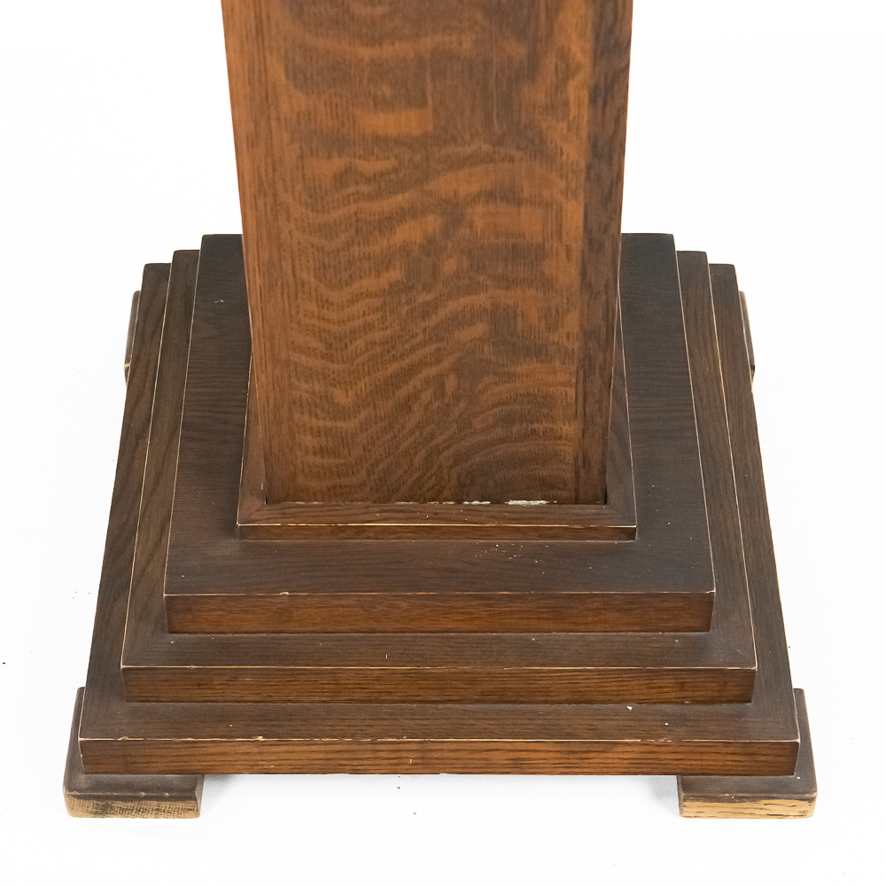 This substantial oak pedestal has its original finish and is quite attractive with its highly figured quarter sawn oak graining is in overall original good condition. Cabinet measures 16″ X 16″ X 28 ” H. It is the right size and height for the Zonophone Grand Opera phonograph (Lot #1035) with the auditorium horn. From the Jeff Young Collection.