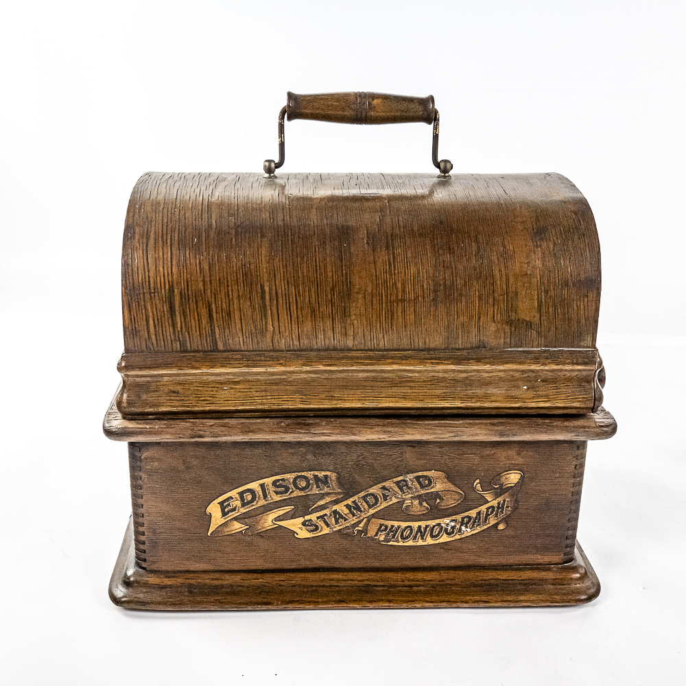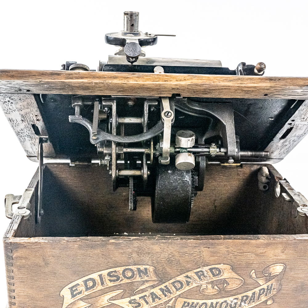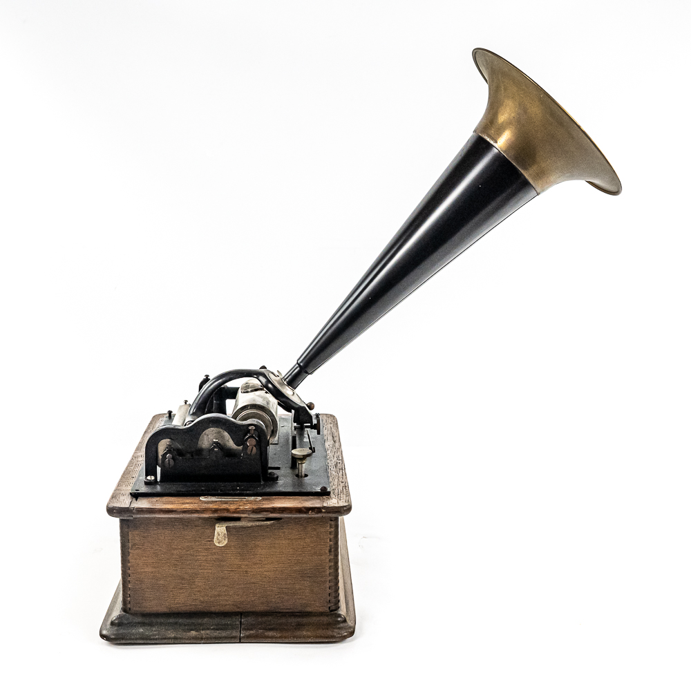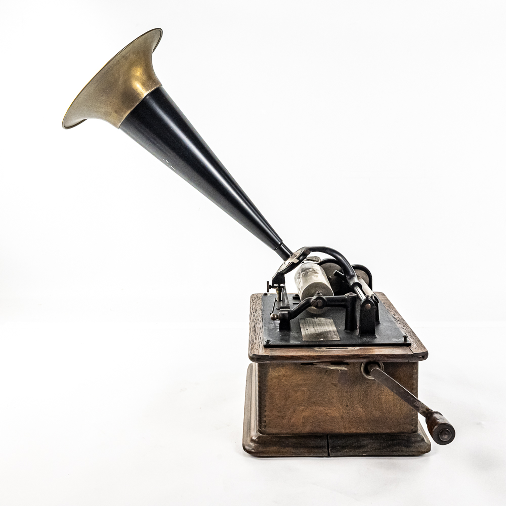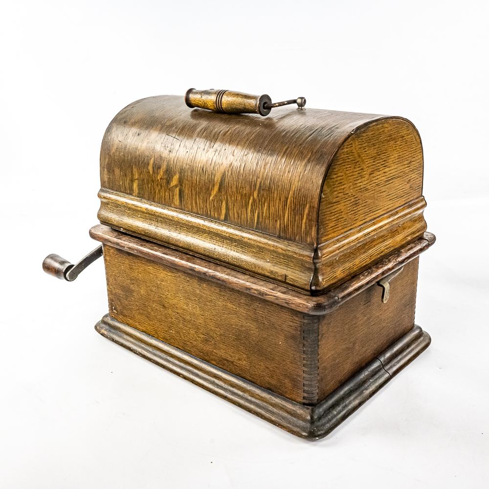 This Model A machine in its oak cabinet has its original finish and decal in average condition with the usual wear with some minor damage to the top motor board. One side of the top cover is loose and could use some glue as well as a shrinkage crack on the bottom board. Has an original Model C reproducer with a good stylus. Mandrill and carriage move freely however the mandrill has a small bent. The upper mech and bed plate have their original black paint and pinstripes however both are quite worn and dirty and could use a good cleaning. Has its original cast iron winding crank with a clumsy wooden knob but comes with a correct reproduction wooden knob. Also included is a 14″ L black and brass reproduction horn with a 7-1/2″ brass bell which is in good condition. Cabinet measures 12-1/2″ L X 9″ W X 11″ T.