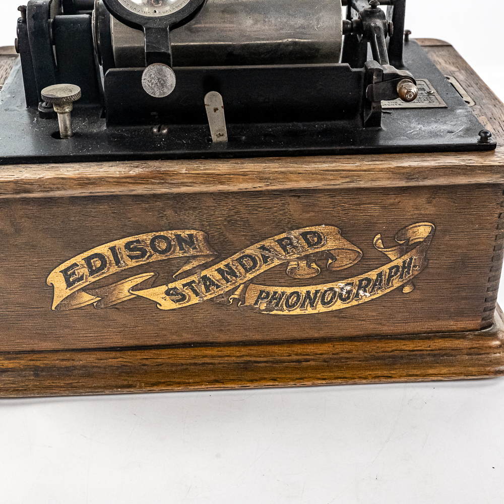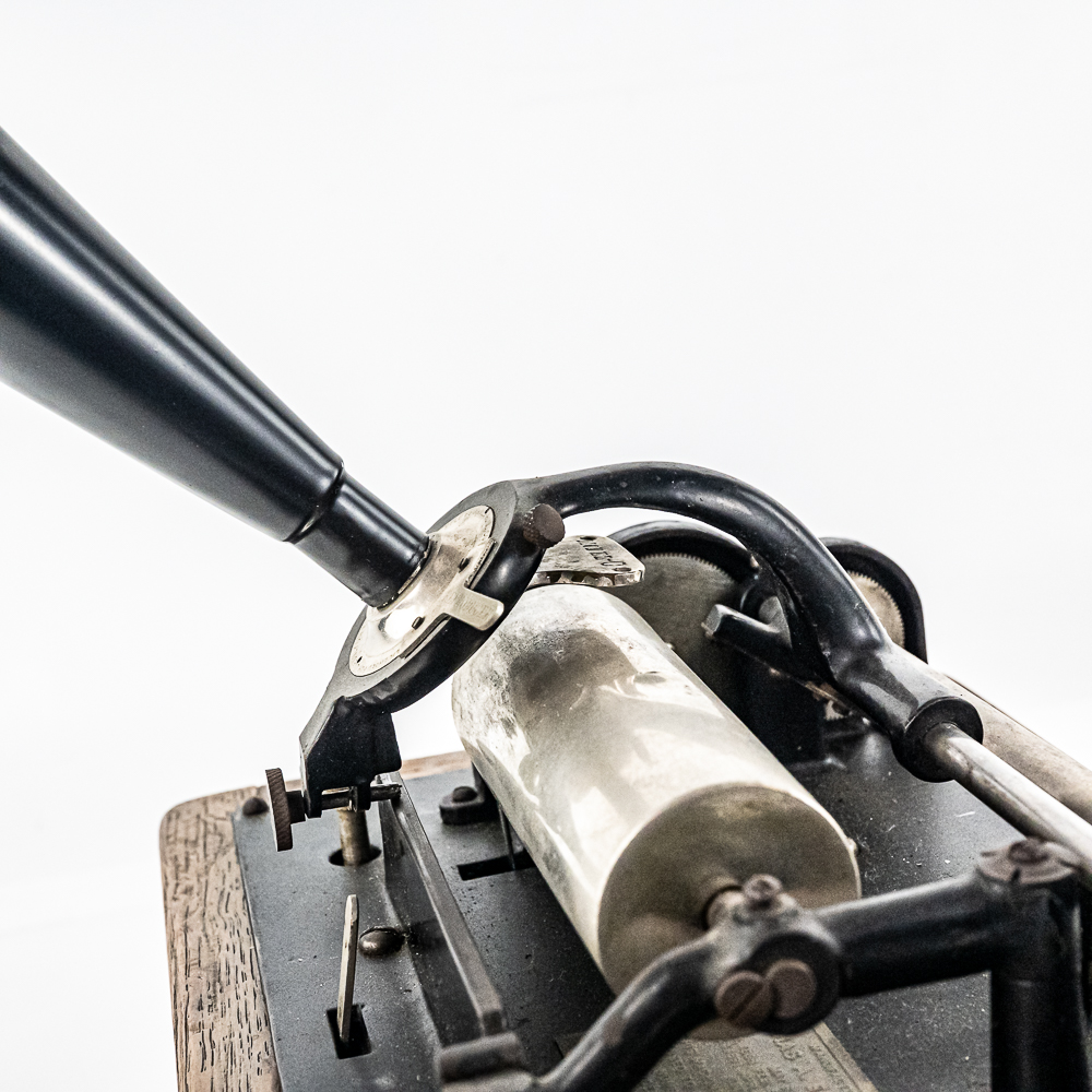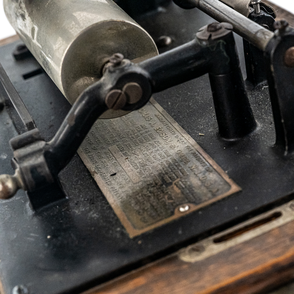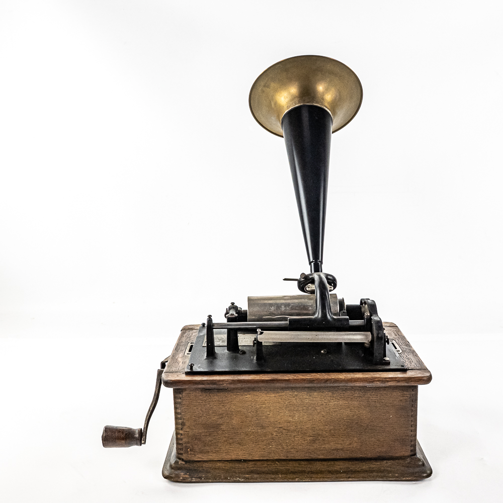 This Model A machine in its oak cabinet has its original finish and decal in average condition with the usual wear with some minor damage to the top motor board. One side of the top cover is loose and could use some glue as well as a shrinkage crack on the bottom board. Has an original Model C reproducer with a good stylus. Mandrill and carriage move freely however the mandrill has a small bent. The upper mech and bed plate have their original black paint and pinstripes however both are quite worn and dirty and could use a good cleaning. Has its original cast iron winding crank with a clumsy wooden knob but comes with a correct reproduction wooden knob. Also included is a 14″ L black and brass reproduction horn with a 7-1/2″ brass bell which is in good condition. Cabinet measures 12-1/2″ L X 9″ W X 11″ T.
