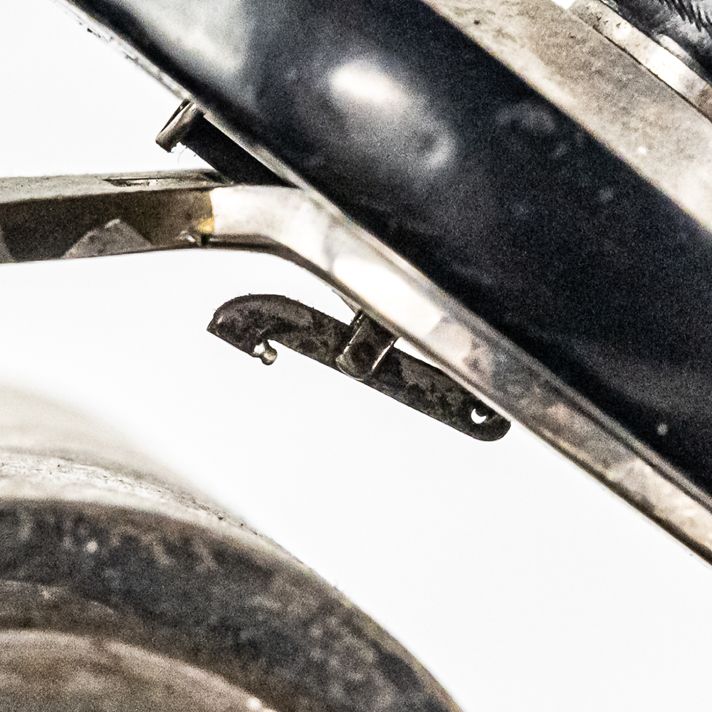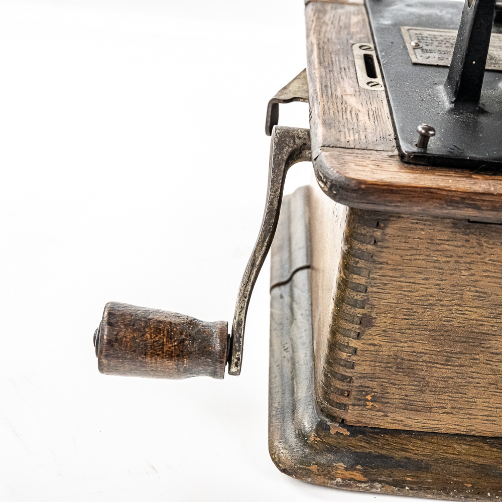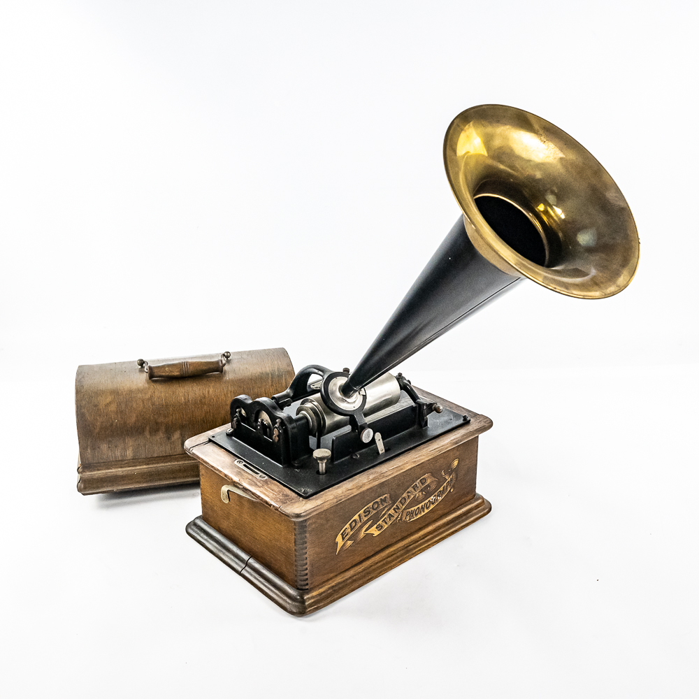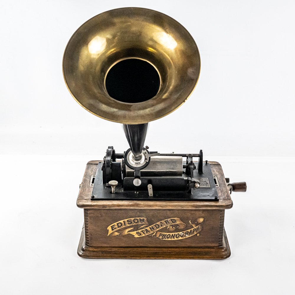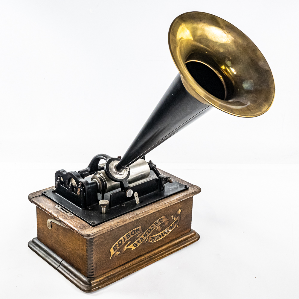 This Model A machine in its oak cabinet has its original finish and decal in average condition with the usual wear with some minor damage to the top motor board. One side of the top cover is loose and could use some glue as well as a shrinkage crack on the bottom board. Has an original Model C reproducer with a good stylus. Mandrill and carriage move freely however the mandrill has a small bent. The upper mech and bed plate have their original black paint and pinstripes however both are quite worn and dirty and could use a good cleaning. Has its original cast iron winding crank with a clumsy wooden knob but comes with a correct reproduction wooden knob. Also included is a 14″ L black and brass reproduction horn with a 7-1/2″ brass bell which is in good condition. Cabinet measures 12-1/2″ L X 9″ W X 11″ T.