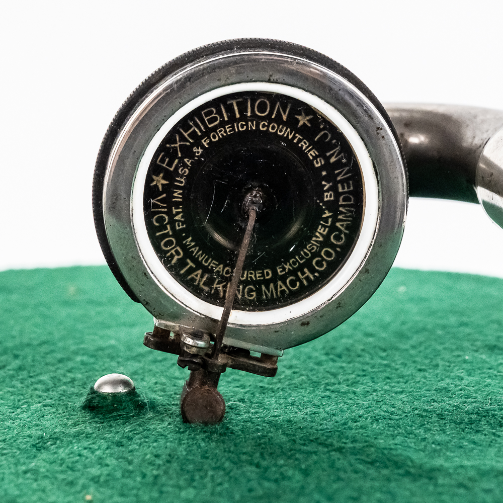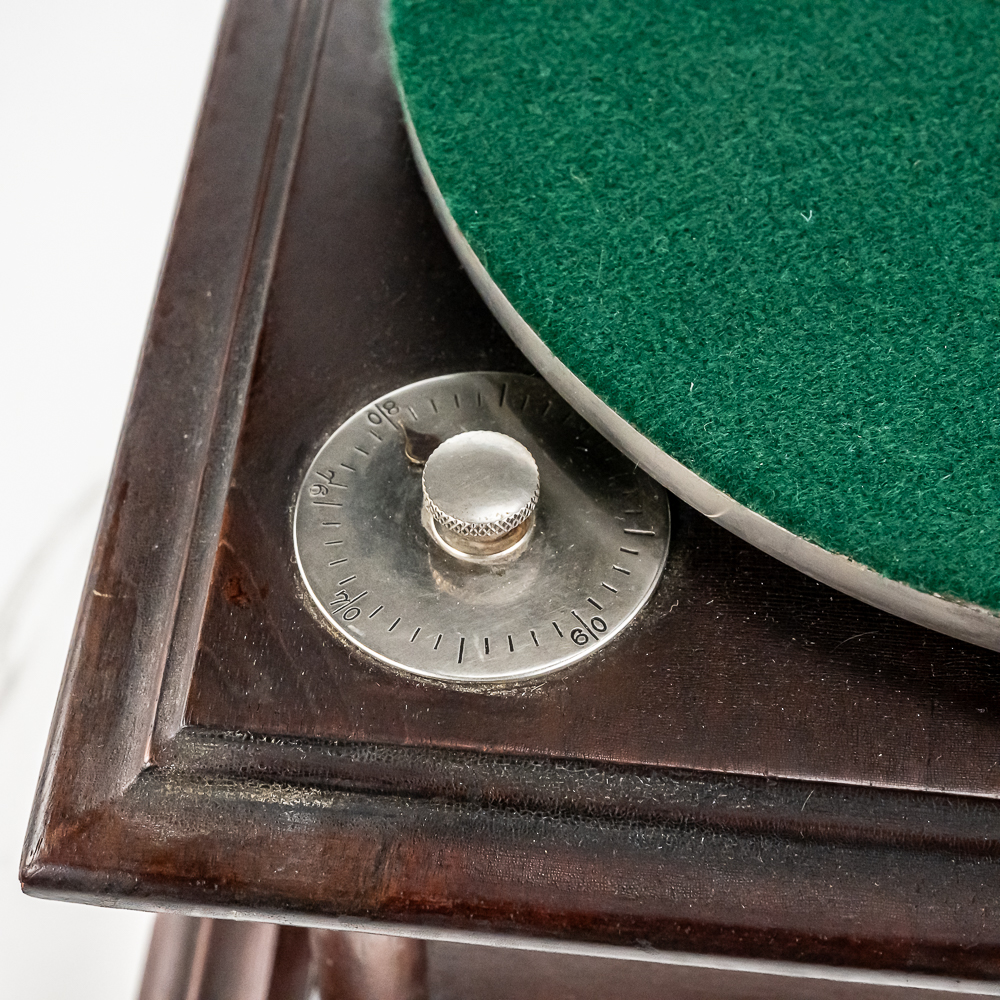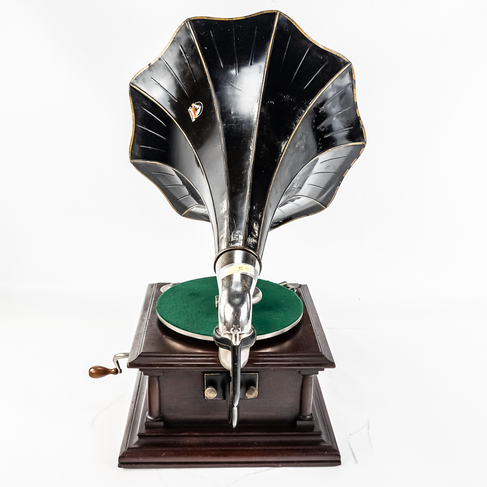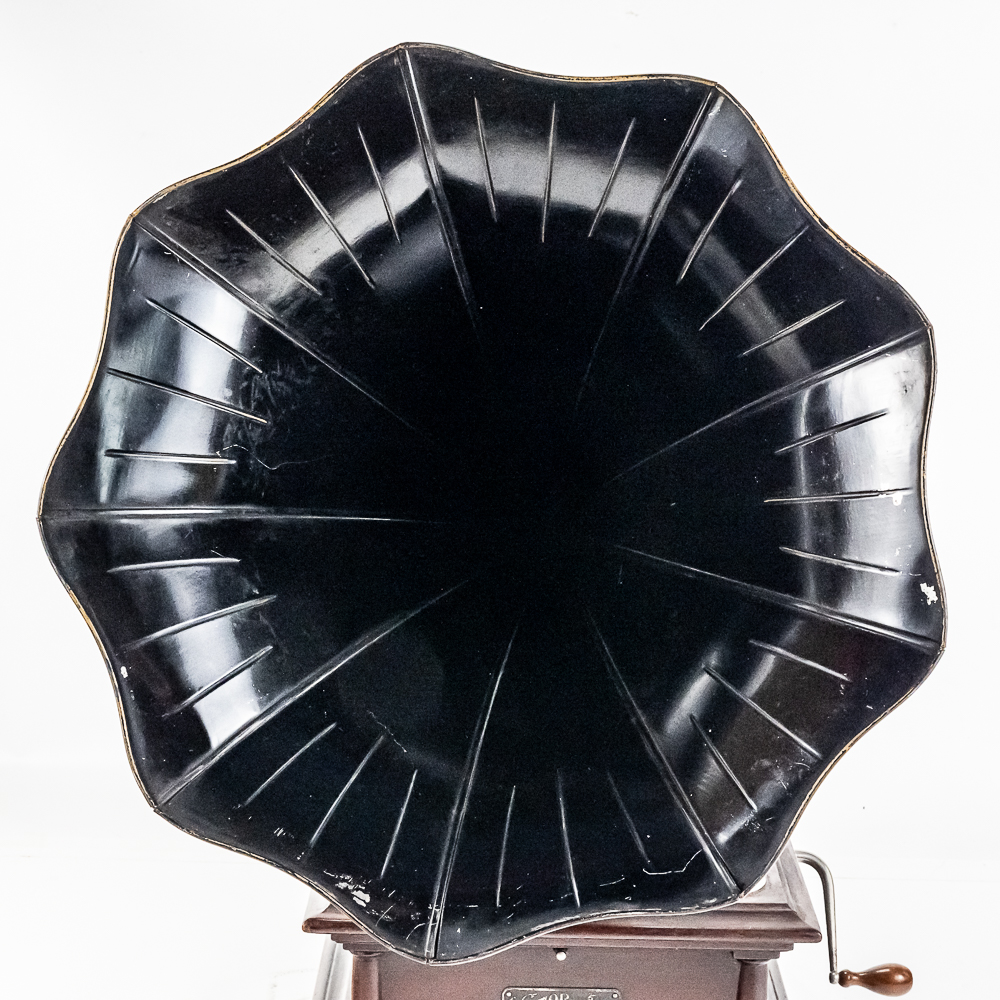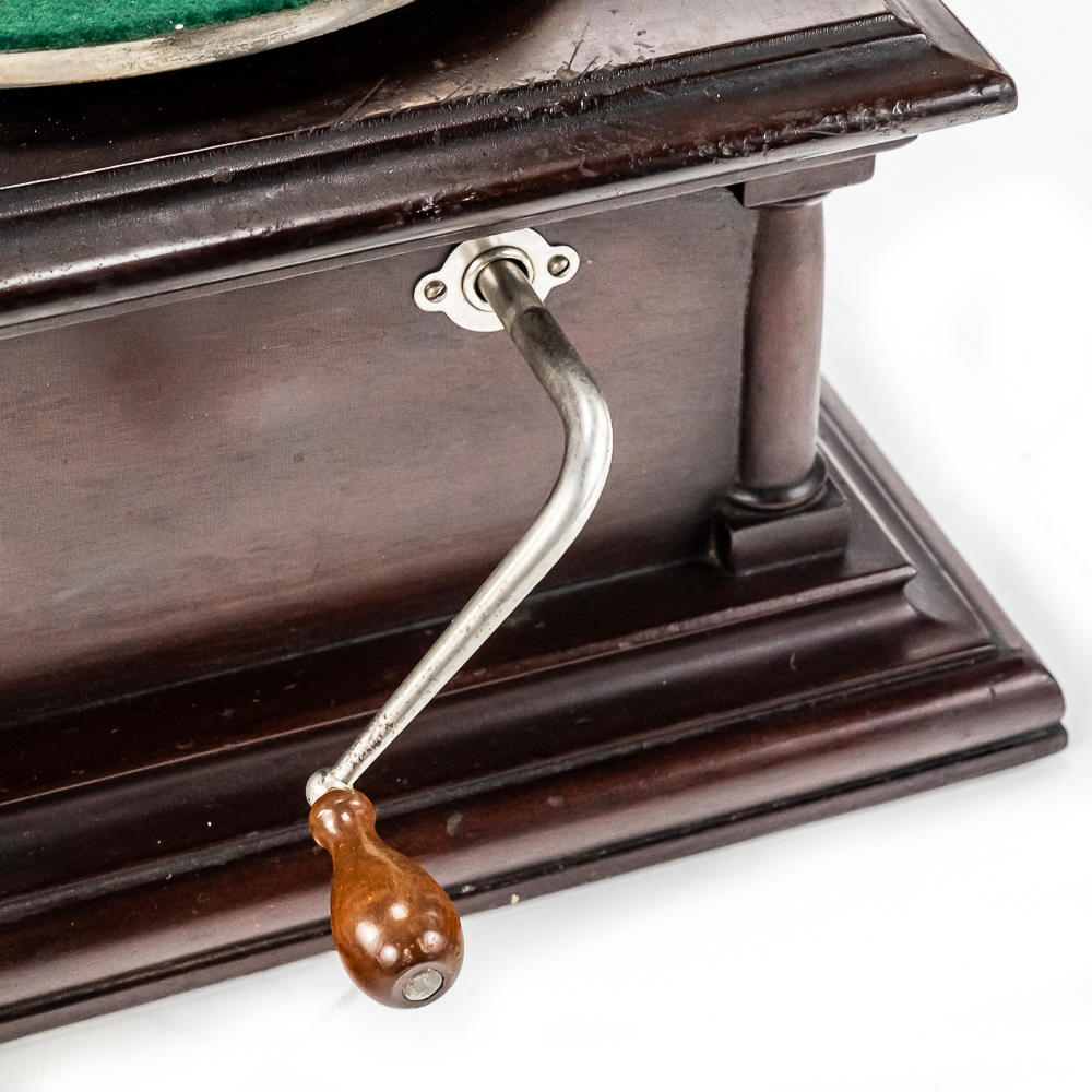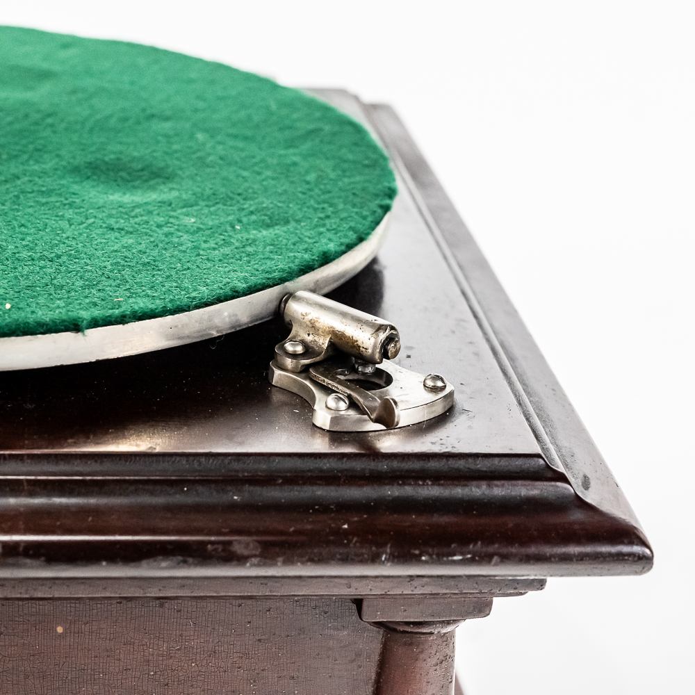 This machine in its mahogany cabinet has its original finish which is lightly crazed throughout with a few minor scratches and dings as well as the usual wear and is in overall good as found condition. Has all of its original corner columns that are nicely in tact as well as nice and tight corners. The exhibition reproducer has been rebuilt and has a new rubber back flange. The tone arm has its original nickel plating in average condition with two dents near the rear of the tone arm. The back bracket has its original black paint and decals in average condition. Has its original mounting thumb screws. Has reproduction horn elbow hold down and thumb screw. Has its original horn elbow with average nickel plating as well as some dents. See photos. Has its original bullet break and cast iron turntable. The turntable has a replacement felt. Has its original winding crank and the motor winds and runs. Has an original 22″ L black embossed steel horn which is 19″ in diameter. Horn has its original black paint, pinstripes and decal in average condition with some paint loss and a few minor dents and wrinkles. Cabinet measures 14″ X 14″ X 7-1/2″ T A decent survivor.