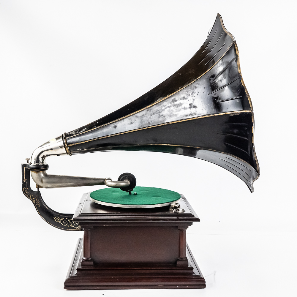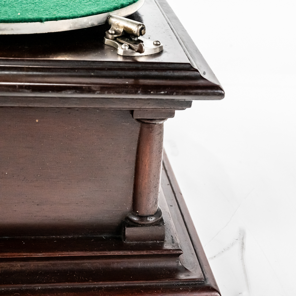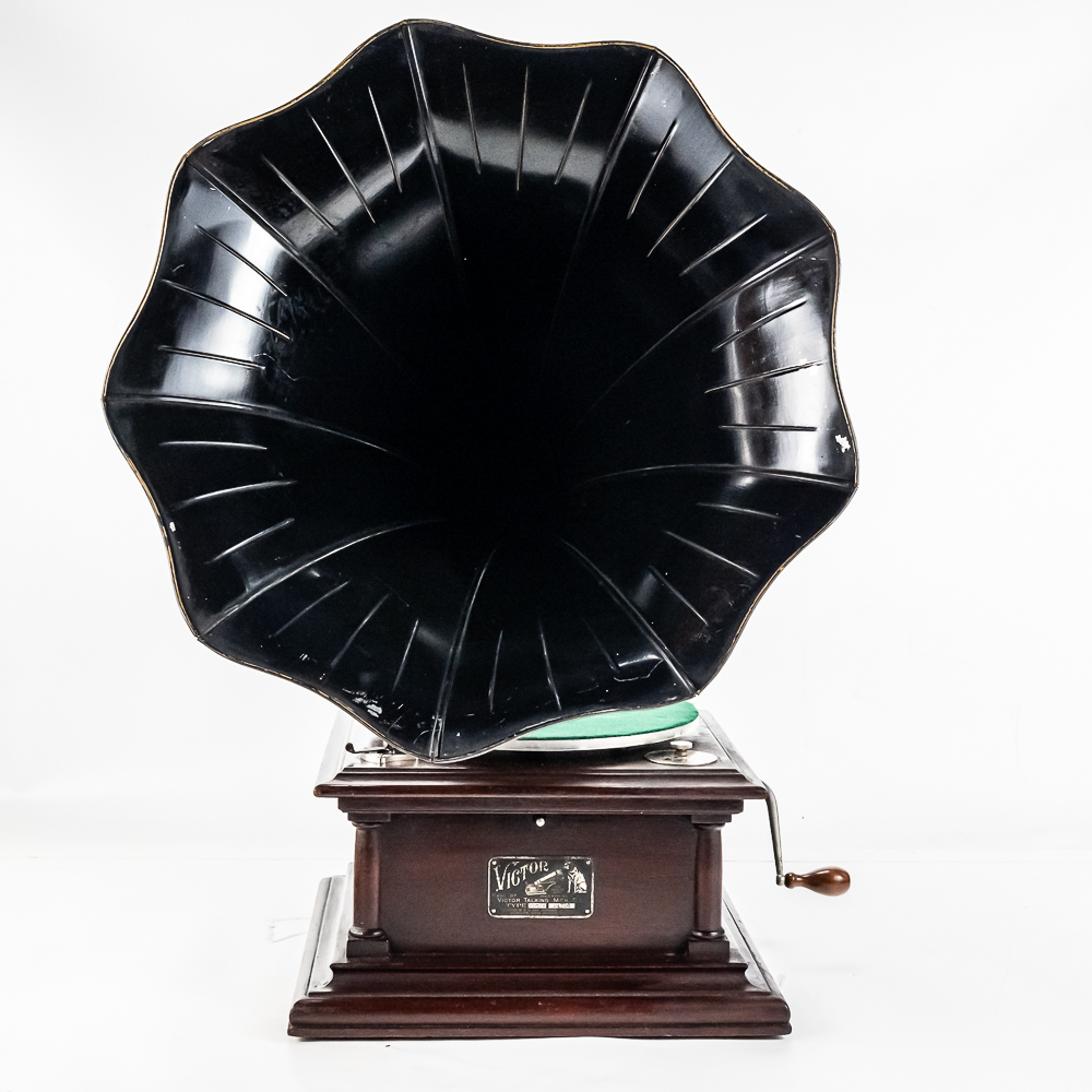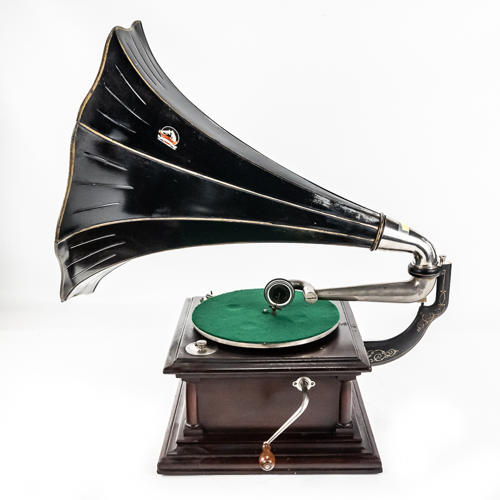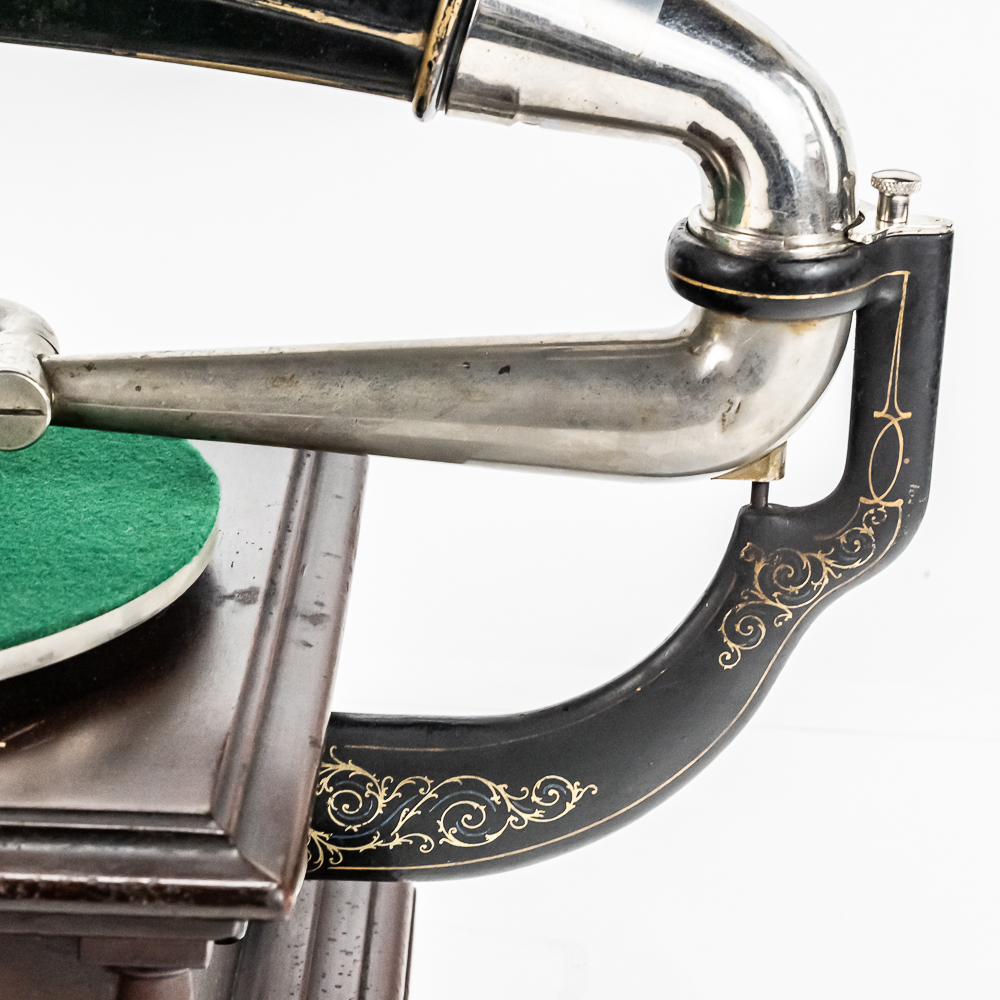 This machine in its mahogany cabinet has its original finish which is lightly crazed throughout with a few minor scratches and dings as well as the usual wear and is in overall good as found condition. Has all of its original corner columns that are nicely in tact as well as nice and tight corners. The exhibition reproducer has been rebuilt and has a new rubber back flange. The tone arm has its original nickel plating in average condition with two dents near the rear of the tone arm. The back bracket has its original black paint and decals in average condition. Has its original mounting thumb screws. Has reproduction horn elbow hold down and thumb screw. Has its original horn elbow with average nickel plating as well as some dents. See photos. Has its original bullet break and cast iron turntable. The turntable has a replacement felt. Has its original winding crank and the motor winds and runs. Has an original 22″ L black embossed steel horn which is 19″ in diameter. Horn has its original black paint, pinstripes and decal in average condition with some paint loss and a few minor dents and wrinkles. Cabinet measures 14″ X 14″ X 7-1/2″ T A decent survivor.