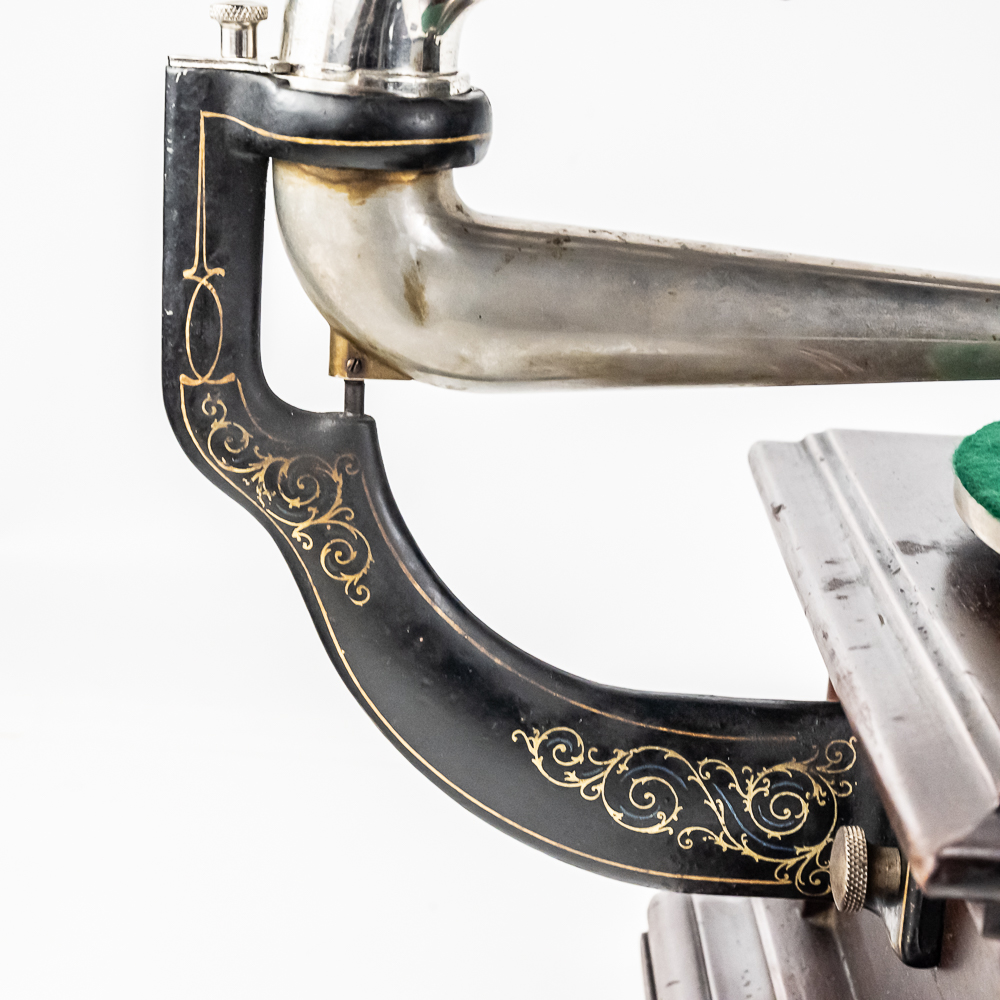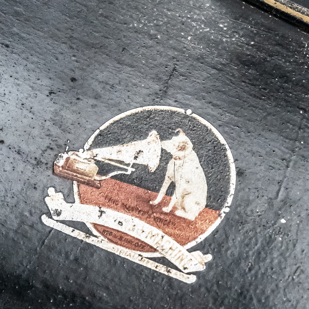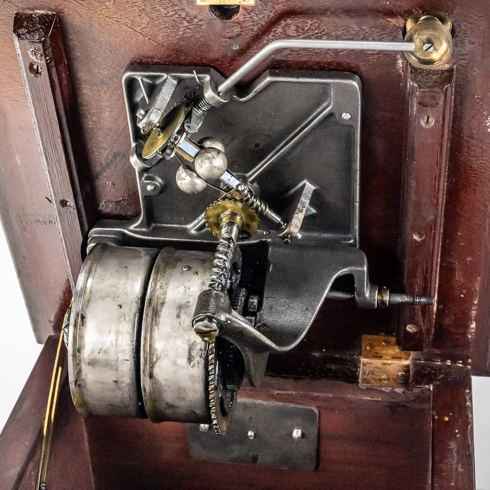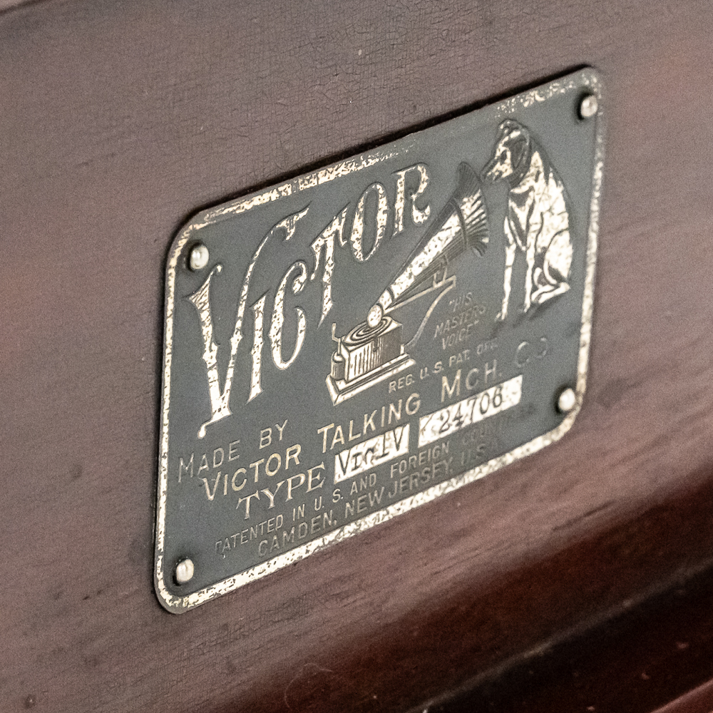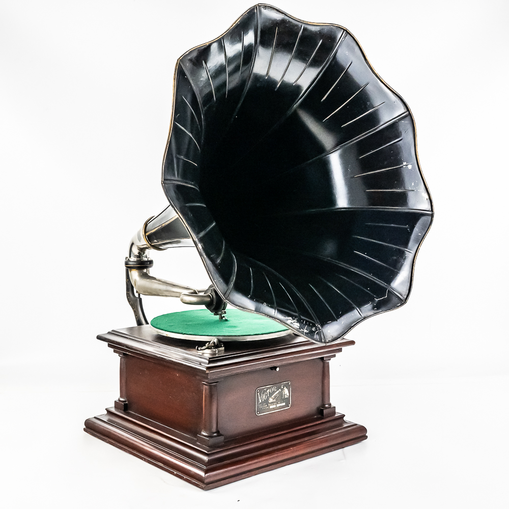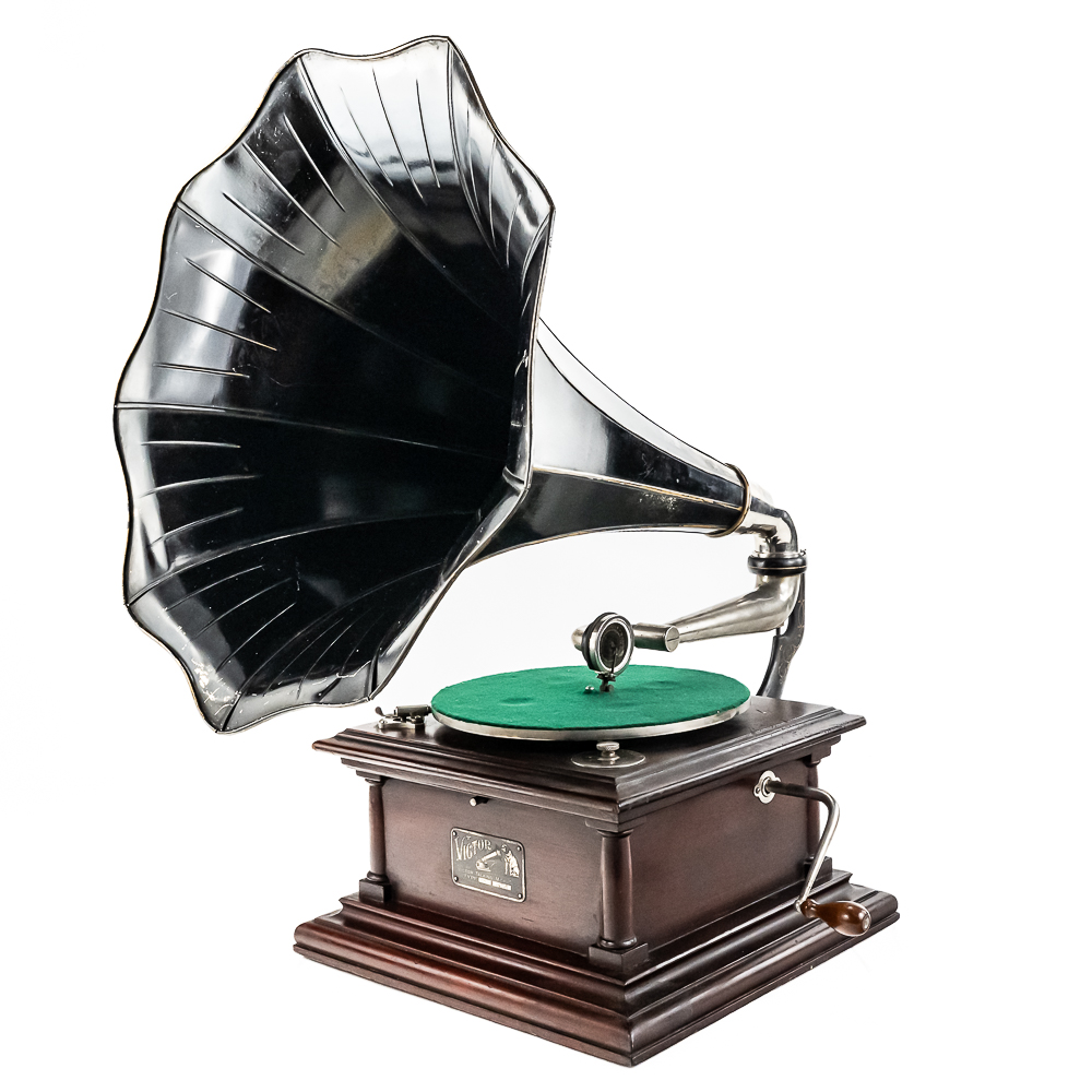 This machine in its mahogany cabinet has its original finish which is lightly crazed throughout with a few minor scratches and dings as well as the usual wear and is in overall good as found condition. Has all of its original corner columns that are nicely in tact as well as nice and tight corners. The exhibition reproducer has been rebuilt and has a new rubber back flange. The tone arm has its original nickel plating in average condition with two dents near the rear of the tone arm. The back bracket has its original black paint and decals in average condition. Has its original mounting thumb screws. Has reproduction horn elbow hold down and thumb screw. Has its original horn elbow with average nickel plating as well as some dents. See photos. Has its original bullet break and cast iron turntable. The turntable has a replacement felt. Has its original winding crank and the motor winds and runs. Has an original 22″ L black embossed steel horn which is 19″ in diameter. Horn has its original black paint, pinstripes and decal in average condition with some paint loss and a few minor dents and wrinkles. Cabinet measures 14″ X 14″ X 7-1/2″ T A decent survivor.