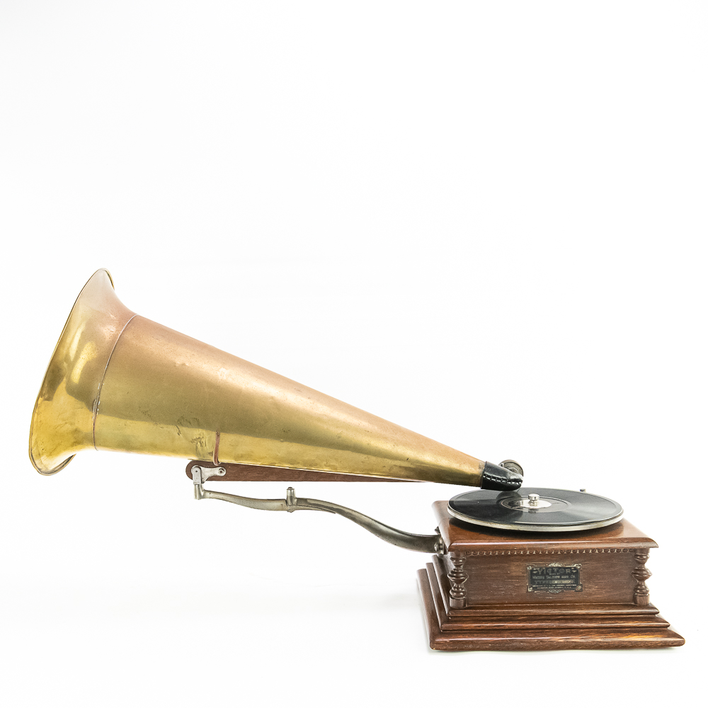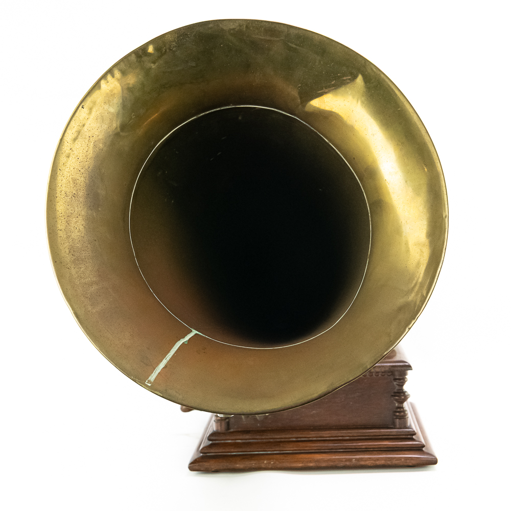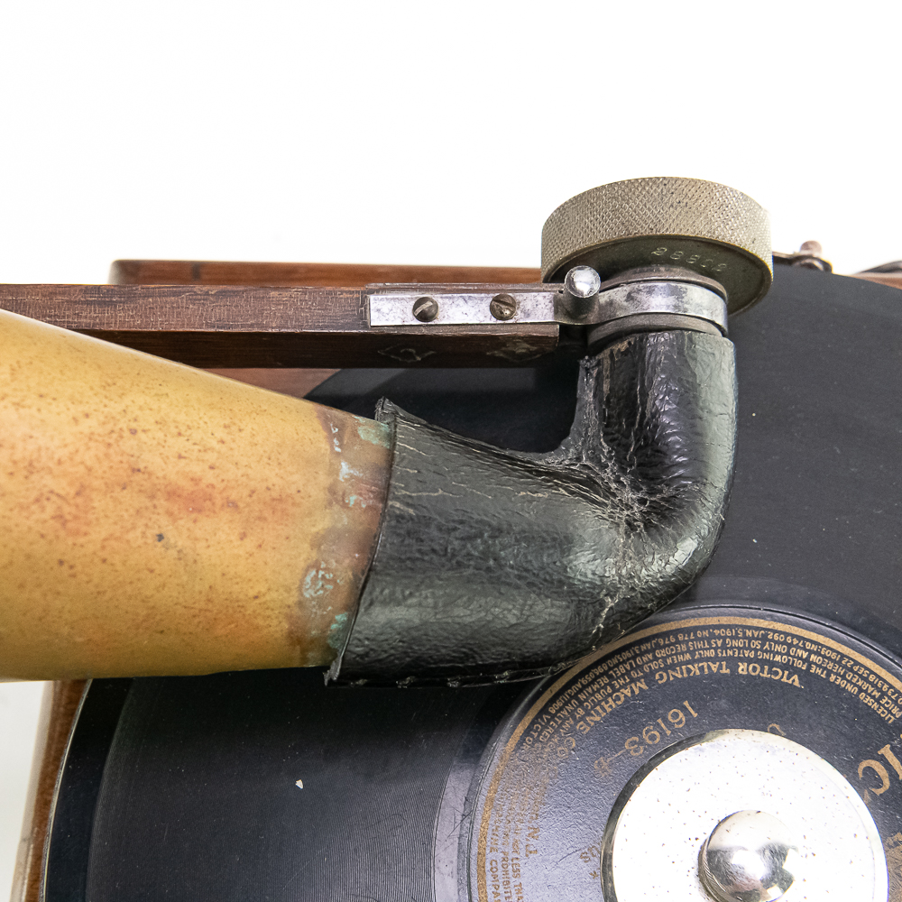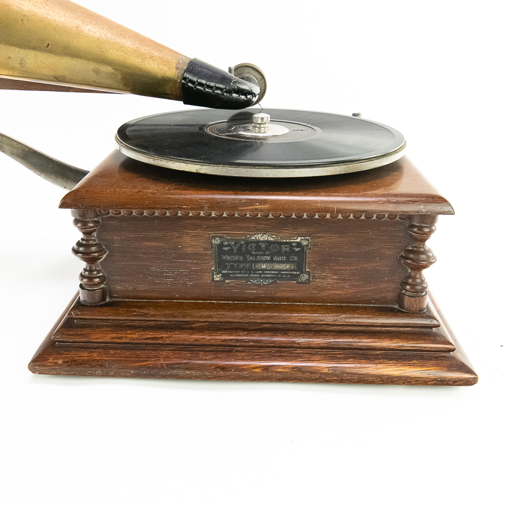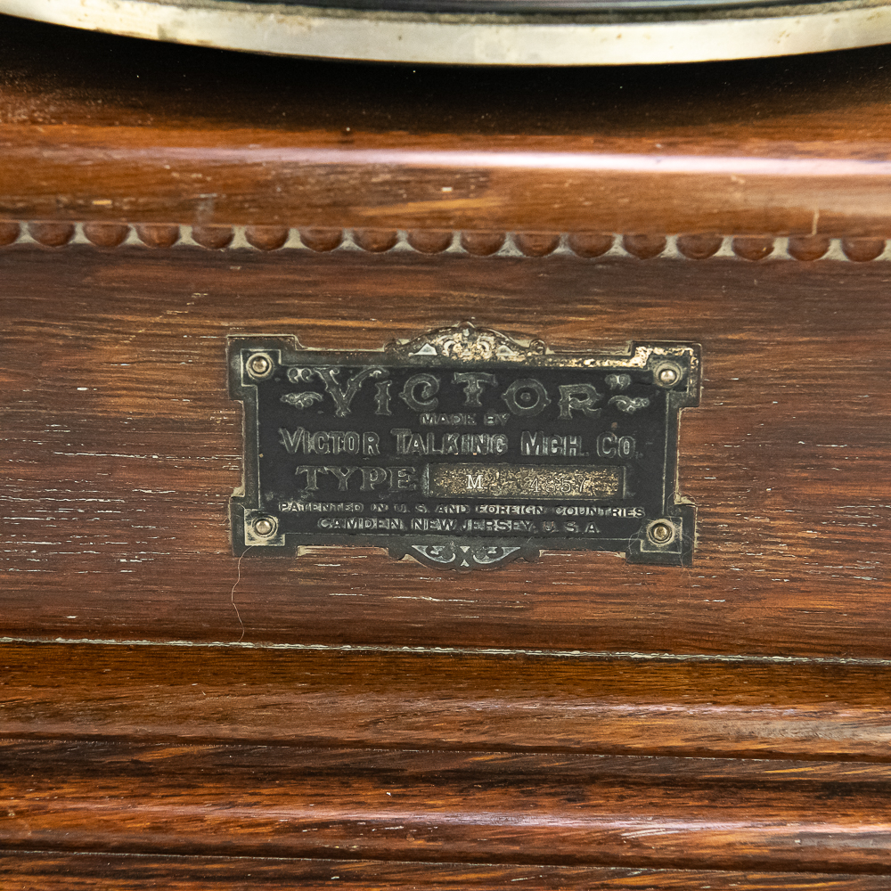 This attractive first style machine in its oak cabinet has its original finish in overall good condition with some minor wear here and there. Has all of its corner columns which are nicely in tact as well as the cabinet corners are nice and tight. As appropriate with a first style machine it has a pre-dog Victor ID tag. Has a Victor marked long throat concert reproducer in average condition with some minor wear. This machine is fitted with a desirable Victor oversized horn ensemble which consists of an original 20″ L wooden tone arm which has its original finish and hardware all of which are in good condition. Has its original cast iron lower support bracket with the addition of the oversized cast iron extension bracket both of which have their original nickel plating in average condition with the usual wear. Has its original winding crank and the motor winds and runs. Also included is one 10″ grand prize record and a reproduction record hold down. Has 27″ all brass long horn with 13″ diameter bell in average condition and lightly tarnished with a few dents and wrinkles here and there. See photos. The small end of the horn is fitted with a reproduction leather elbow. Cabinet measures 13′ X 13″ X 6″ T. A first style machine such as this with an oversized horn ensemble is not often seen and a welcome addition to any collection.