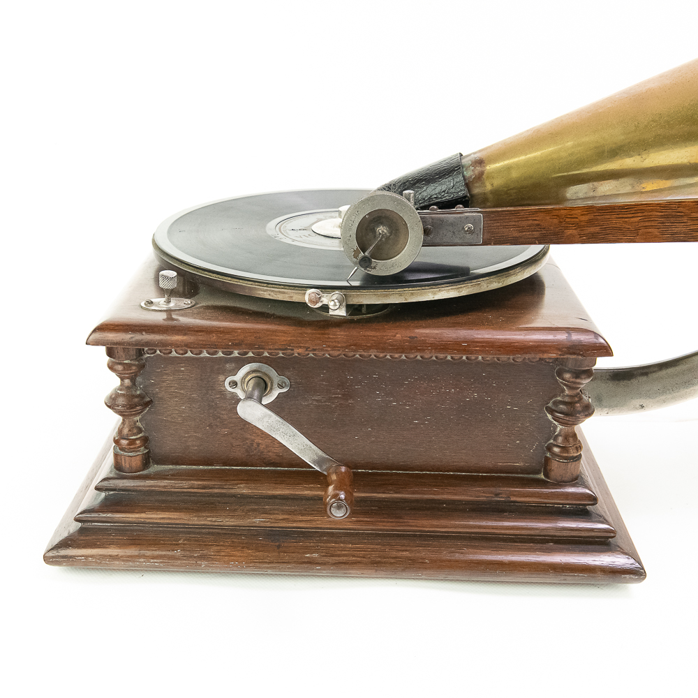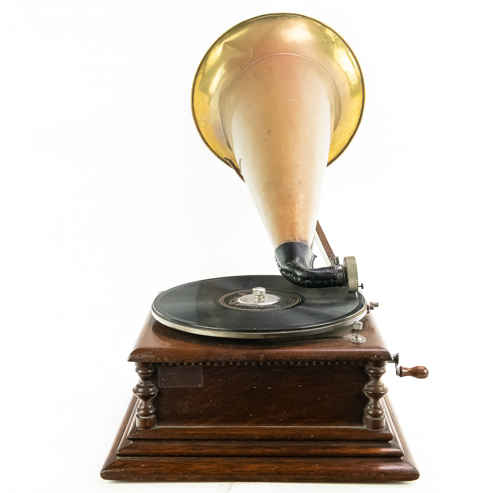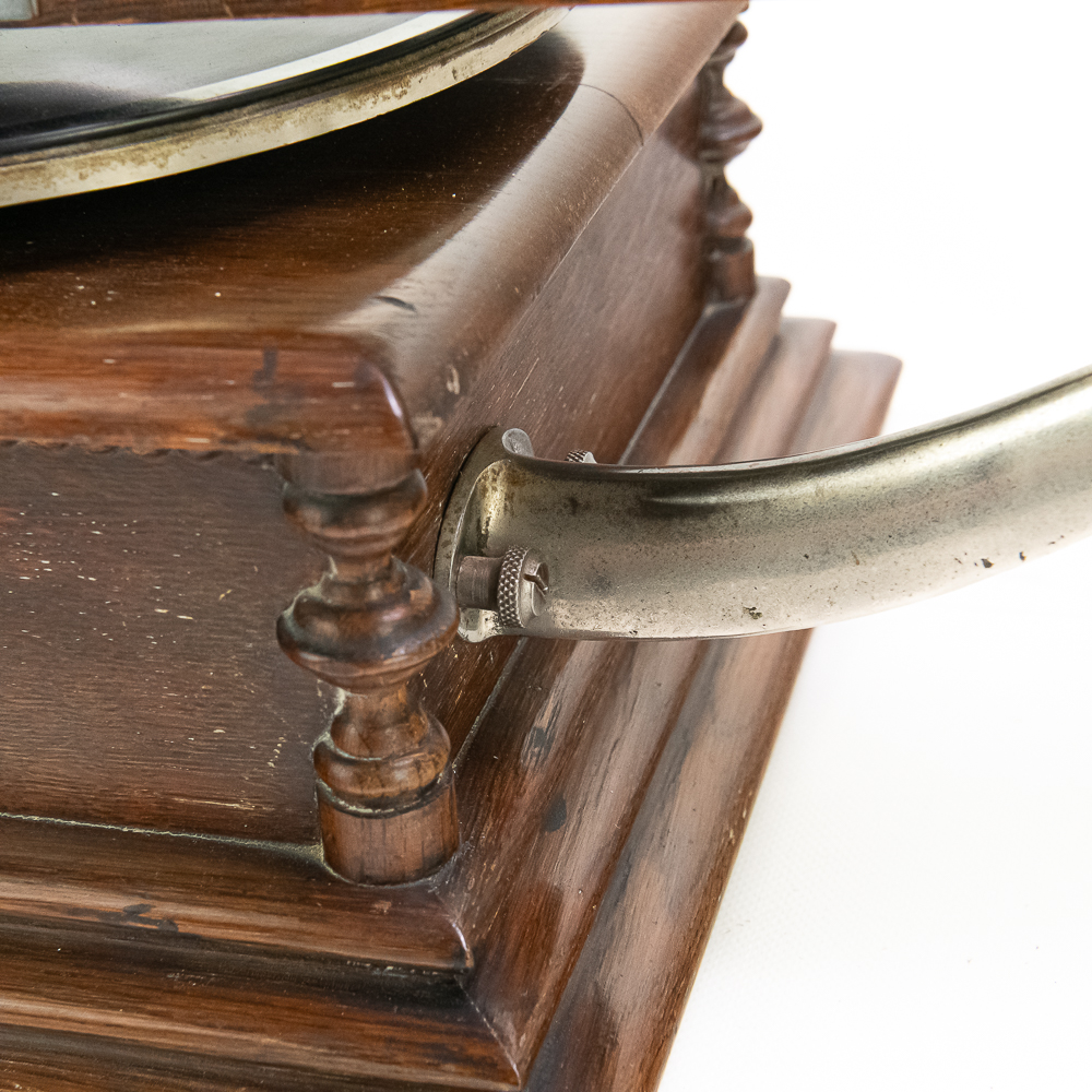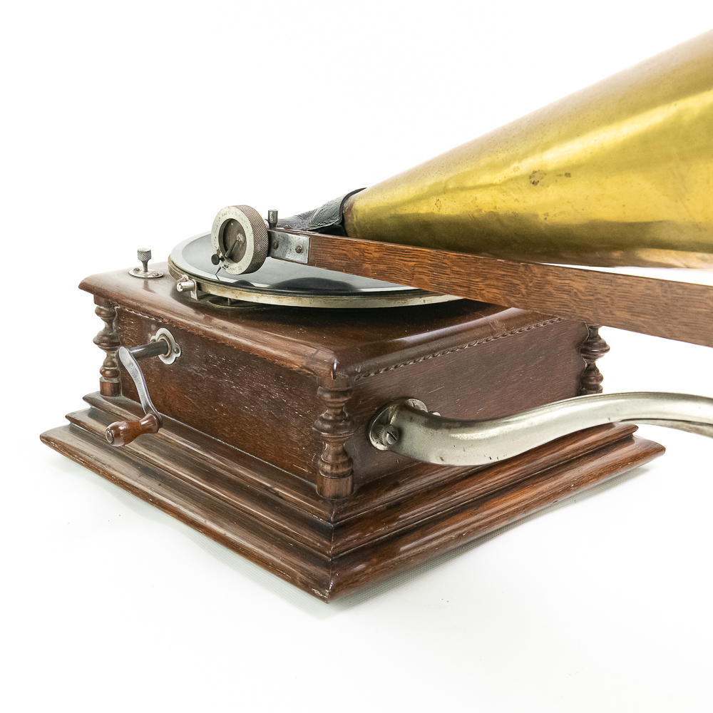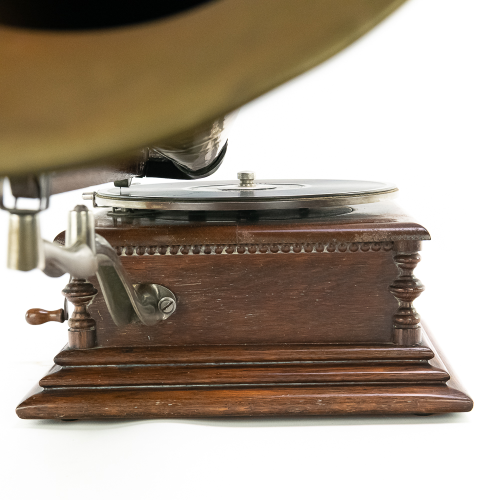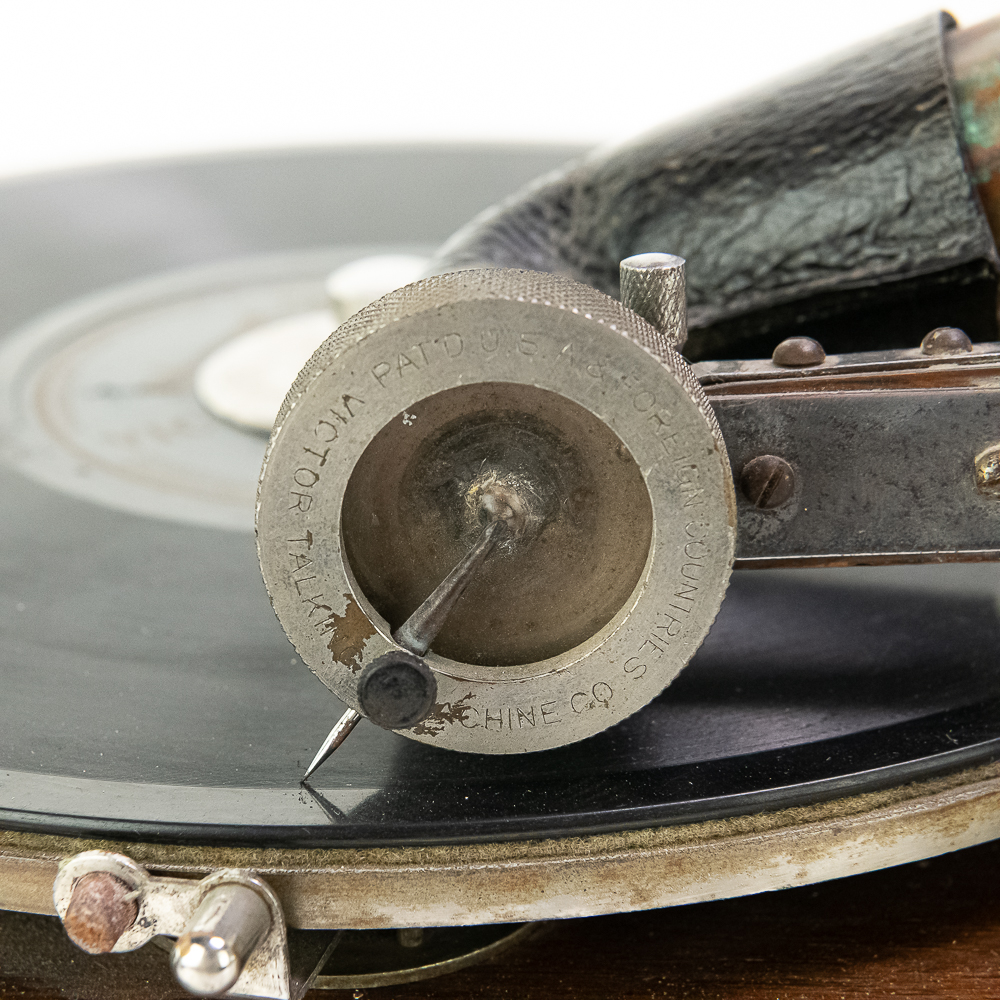 This attractive first style machine in its oak cabinet has its original finish in overall good condition with some minor wear here and there. Has all of its corner columns which are nicely in tact as well as the cabinet corners are nice and tight. As appropriate with a first style machine it has a pre-dog Victor ID tag. Has a Victor marked long throat concert reproducer in average condition with some minor wear. This machine is fitted with a desirable Victor oversized horn ensemble which consists of an original 20″ L wooden tone arm which has its original finish and hardware all of which are in good condition. Has its original cast iron lower support bracket with the addition of the oversized cast iron extension bracket both of which have their original nickel plating in average condition with the usual wear. Has its original winding crank and the motor winds and runs. Also included is one 10″ grand prize record and a reproduction record hold down. Has 27″ all brass long horn with 13″ diameter bell in average condition and lightly tarnished with a few dents and wrinkles here and there. See photos. The small end of the horn is fitted with a reproduction leather elbow. Cabinet measures 13′ X 13″ X 6″ T. A first style machine such as this with an oversized horn ensemble is not often seen and a welcome addition to any collection.