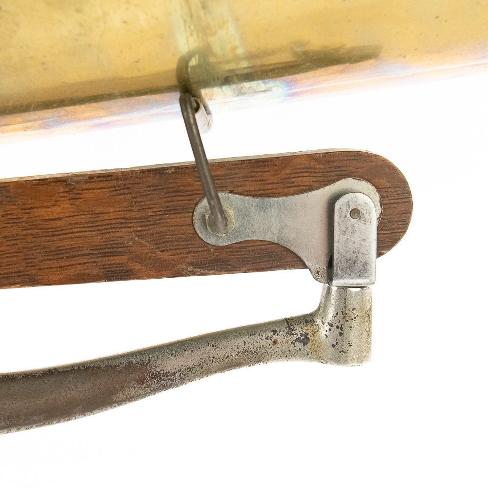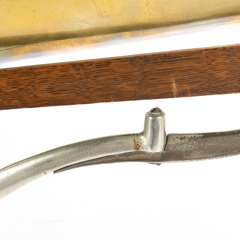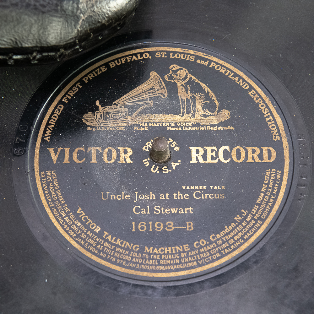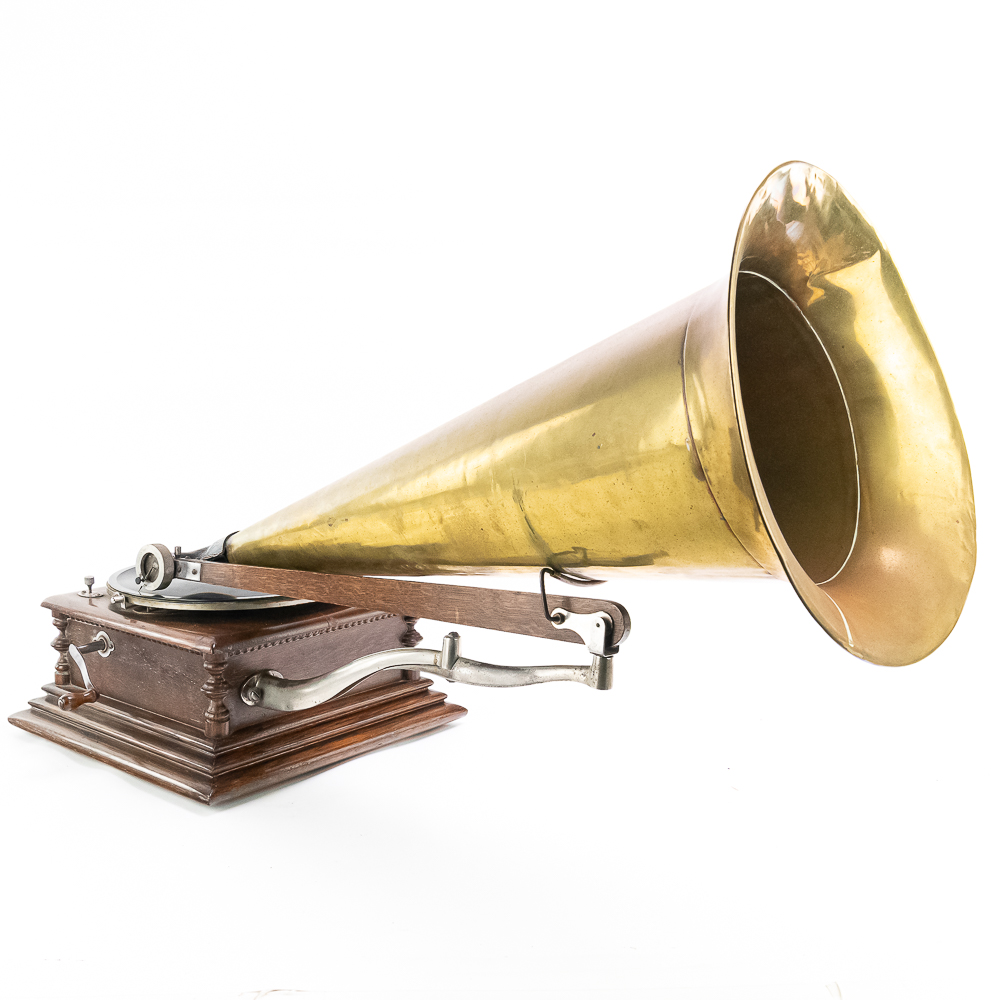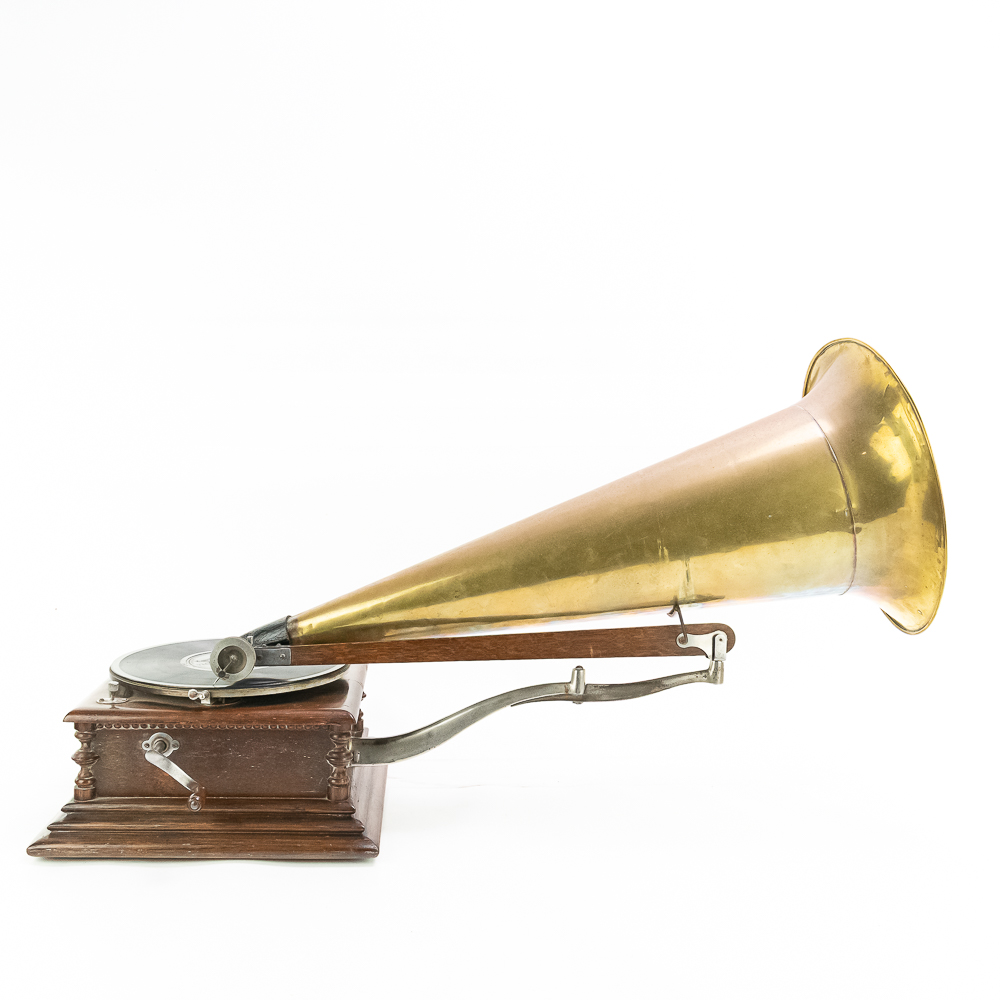 This attractive first style machine in its oak cabinet has its original finish in overall good condition with some minor wear here and there. Has all of its corner columns which are nicely in tact as well as the cabinet corners are nice and tight. As appropriate with a first style machine it has a pre-dog Victor ID tag. Has a Victor marked long throat concert reproducer in average condition with some minor wear. This machine is fitted with a desirable Victor oversized horn ensemble which consists of an original 20″ L wooden tone arm which has its original finish and hardware all of which are in good condition. Has its original cast iron lower support bracket with the addition of the oversized cast iron extension bracket both of which have their original nickel plating in average condition with the usual wear. Has its original winding crank and the motor winds and runs. Also included is one 10″ grand prize record and a reproduction record hold down. Has 27″ all brass long horn with 13″ diameter bell in average condition and lightly tarnished with a few dents and wrinkles here and there. See photos. The small end of the horn is fitted with a reproduction leather elbow. Cabinet measures 13′ X 13″ X 6″ T. A first style machine such as this with an oversized horn ensemble is not often seen and a welcome addition to any collection.