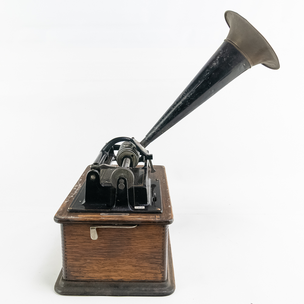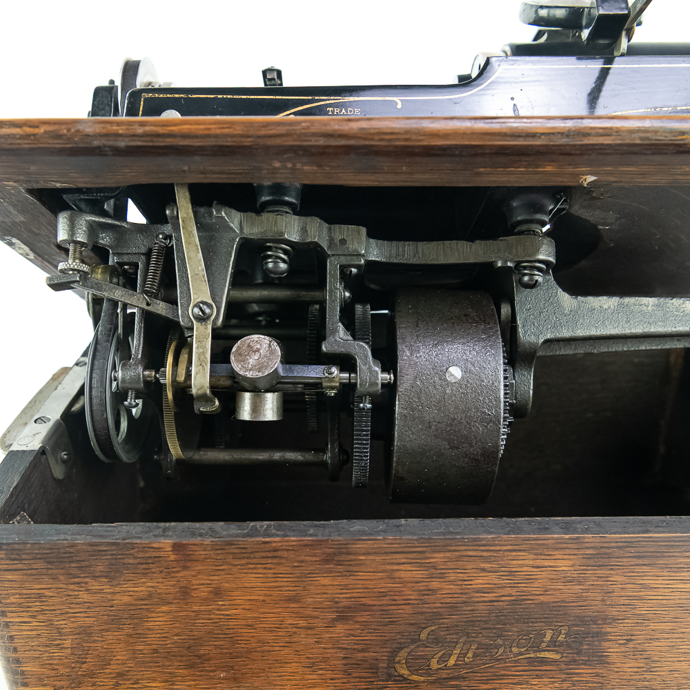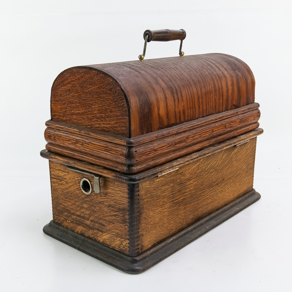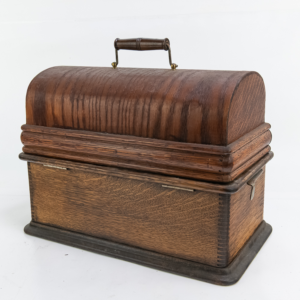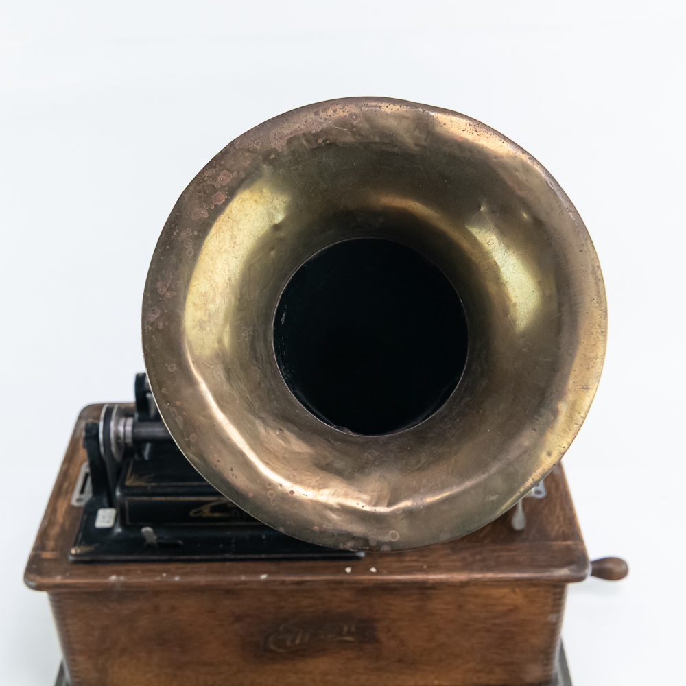 This machine in its oak cabinet has been poorly stripped and refinished. The original decal on the front of the cabinet is present but in poor condition. The top cover has a small hole. See photos. Has an original Model C reproducer with a good stylus. The upper mech has its original black paint and pinstripes in average condition with the usual wear. Mandril and carriage move freely. Has its original winding crank and the motor winds and runs however could use a new drive belt. Also included is a 14″ L brass and black horn with a 7″ bell. The horn body and bell are both in poor condition with numerous dings and wrinkles with some rust. See photos Cabinet measures 16″ L X 9″ W X 12″ T with cover.