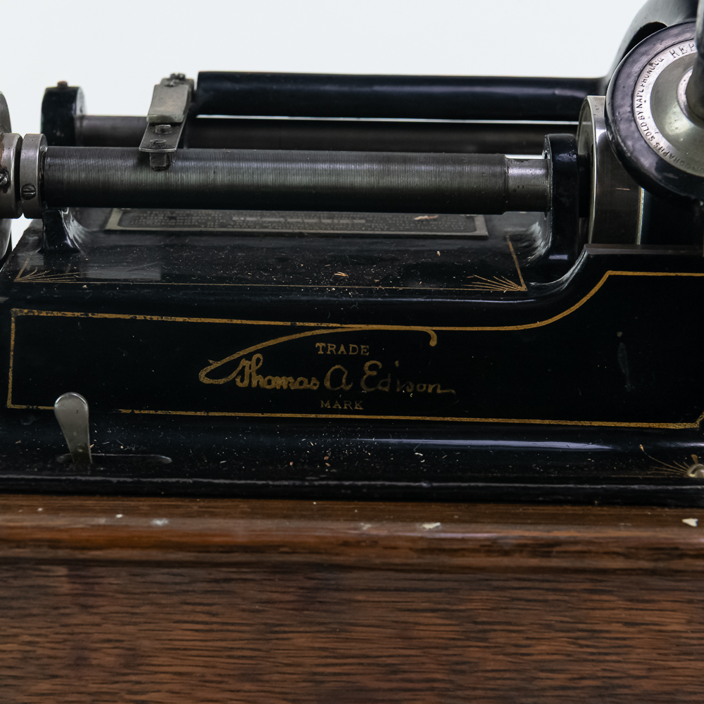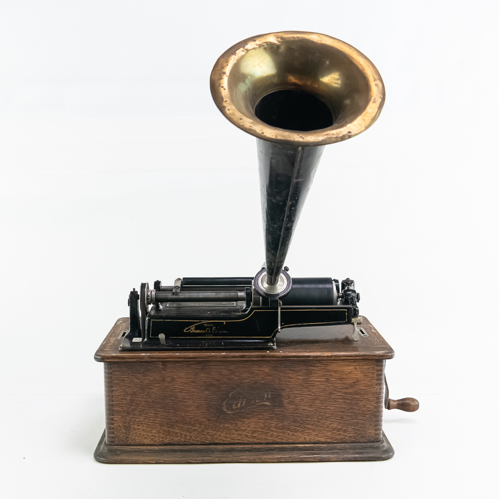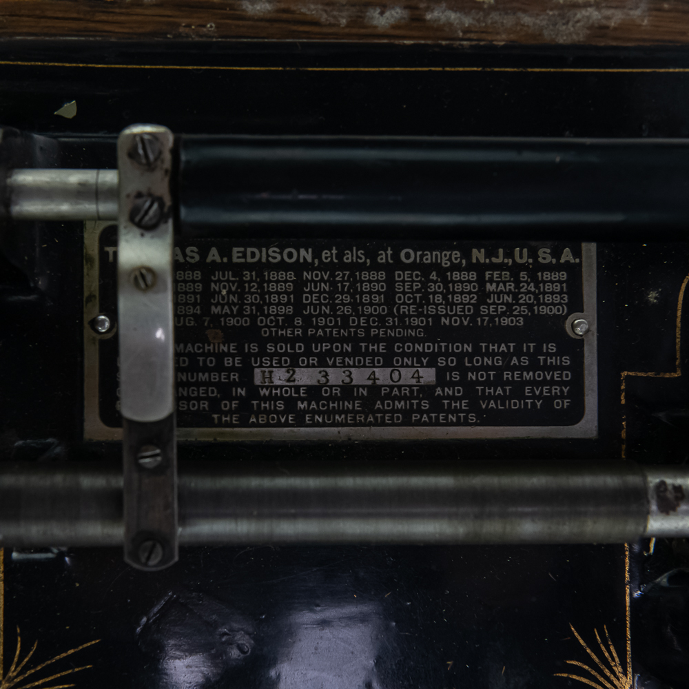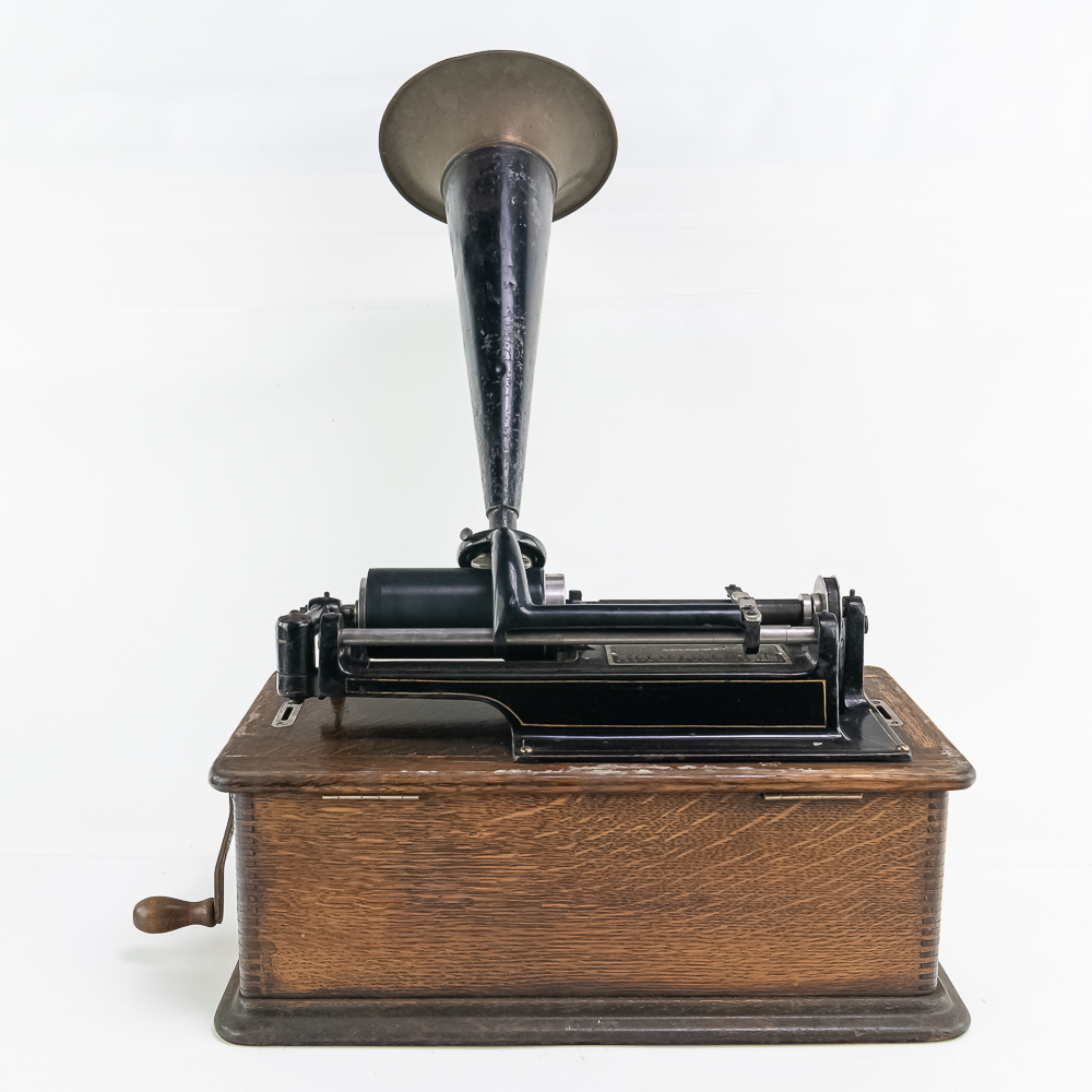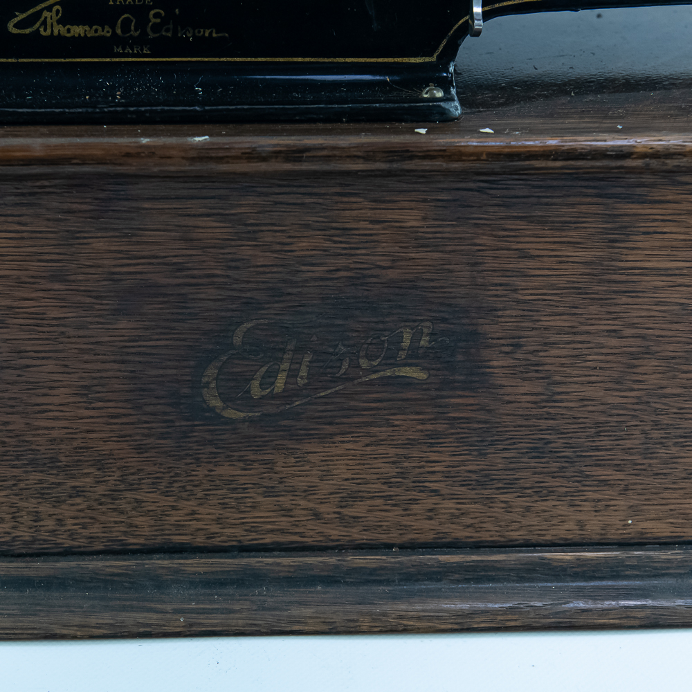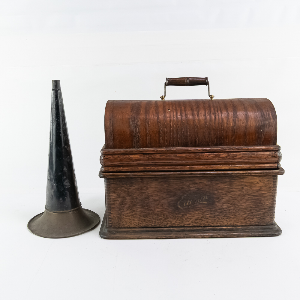 This machine in its oak cabinet has been poorly stripped and refinished. The original decal on the front of the cabinet is present but in poor condition. The top cover has a small hole. See photos. Has an original Model C reproducer with a good stylus. The upper mech has its original black paint and pinstripes in average condition with the usual wear. Mandril and carriage move freely. Has its original winding crank and the motor winds and runs however could use a new drive belt. Also included is a 14″ L brass and black horn with a 7″ bell. The horn body and bell are both in poor condition with numerous dings and wrinkles with some rust. See photos Cabinet measures 16″ L X 9″ W X 12″ T with cover.