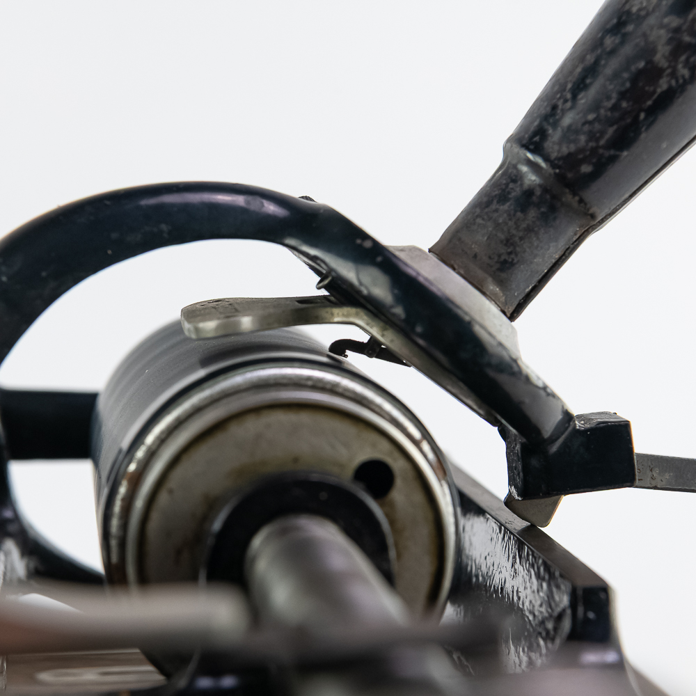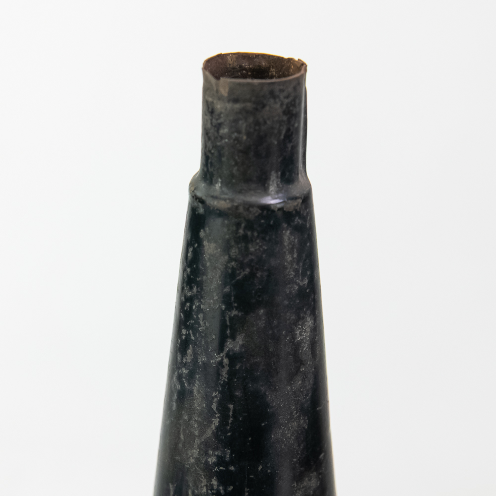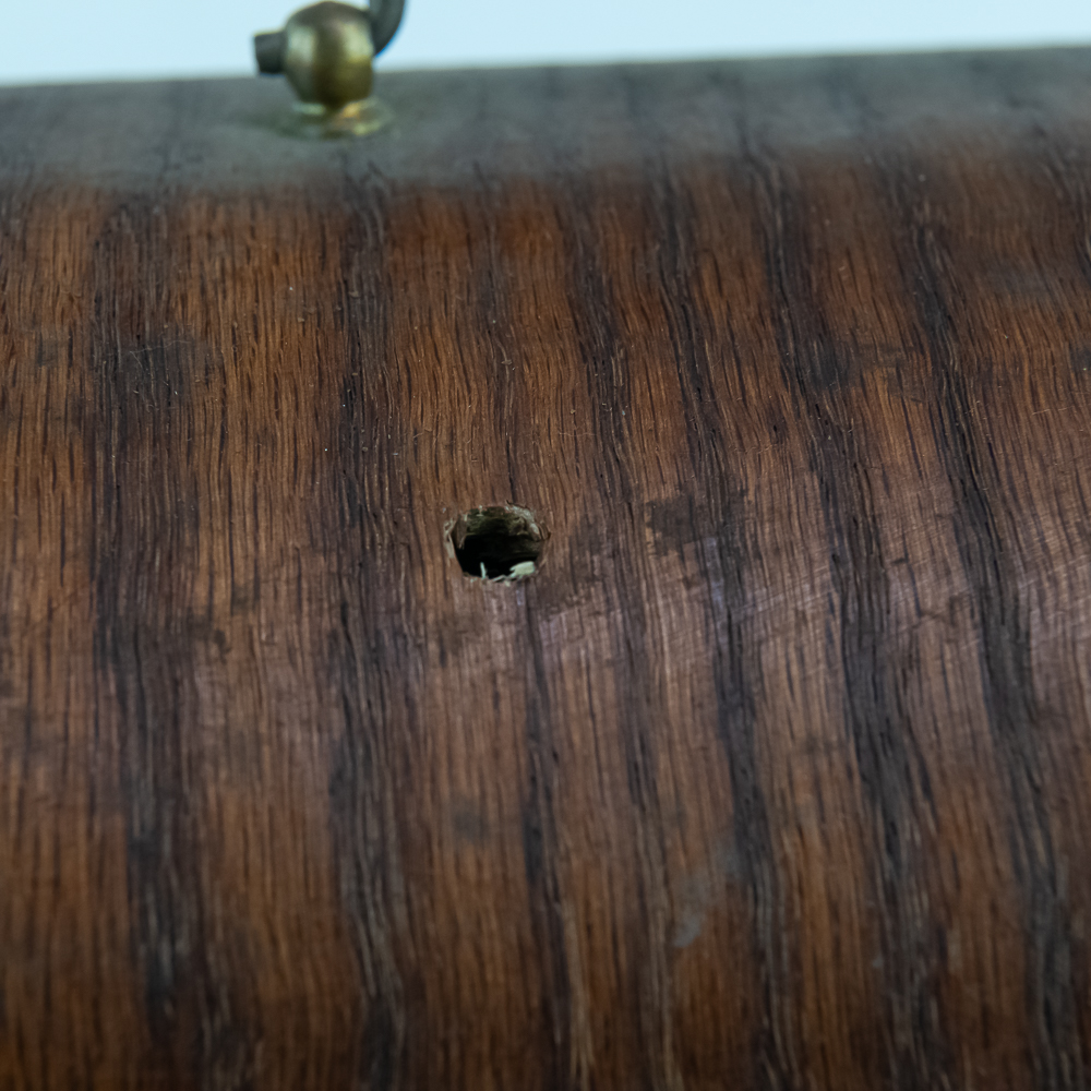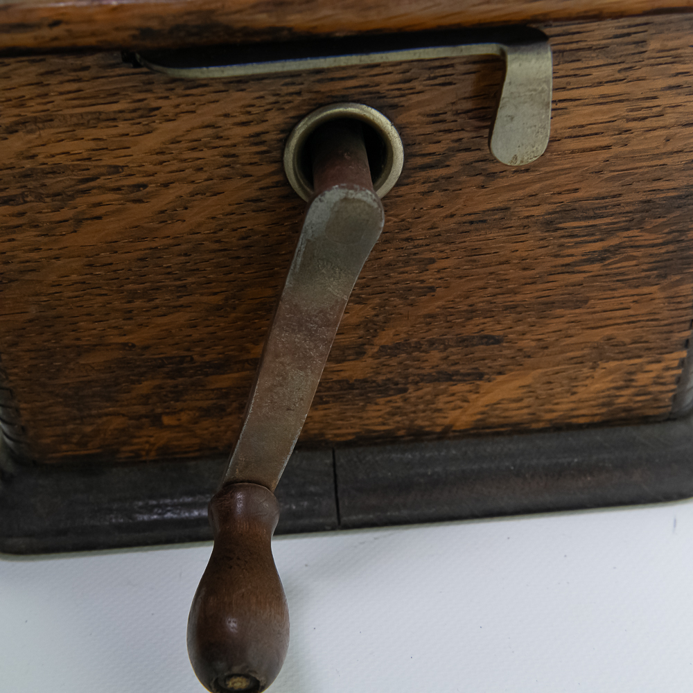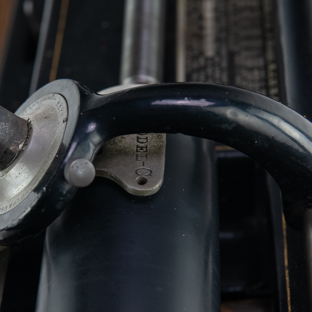 This machine in its oak cabinet has been poorly stripped and refinished. The original decal on the front of the cabinet is present but in poor condition. The top cover has a small hole. See photos. Has an original Model C reproducer with a good stylus. The upper mech has its original black paint and pinstripes in average condition with the usual wear. Mandril and carriage move freely. Has its original winding crank and the motor winds and runs however could use a new drive belt. Also included is a 14″ L brass and black horn with a 7″ bell. The horn body and bell are both in poor condition with numerous dings and wrinkles with some rust. See photos Cabinet measures 16″ L X 9″ W X 12″ T with cover.