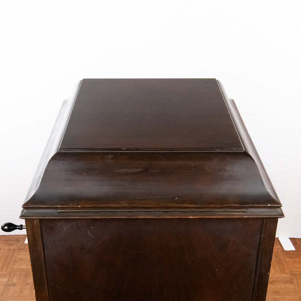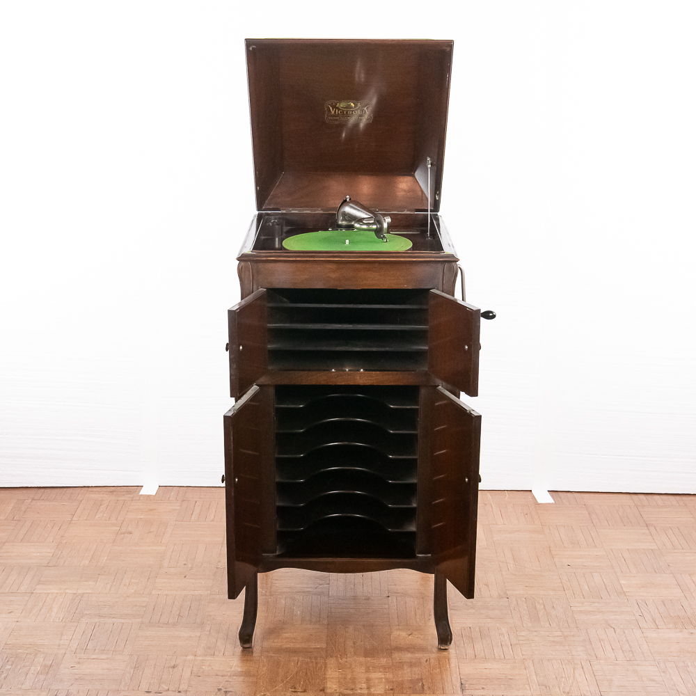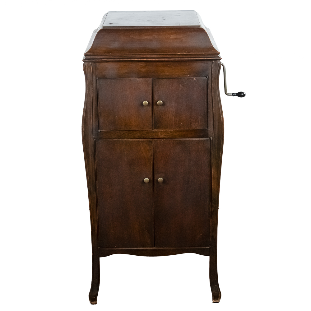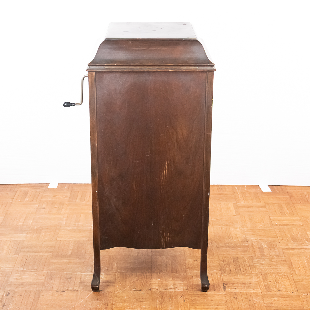 This machine in its American walnut cabinet has its original finish which is lightly crazed throughout with a few minor rings and impressions on the top cover as well as a few minor nicks and scrapes here and there and is in otherwise average as found condition. See photos. The Victrola #2 reproducer, tone arm, needle cup, hardware and crank all have their original nickel plating all in average condition. Motor winds and runs. The record storage compartment has its complete original interior. Cabinet measures 19″ W X 21″ D X 41-1/2″ T. From the Jeff Young Collection.