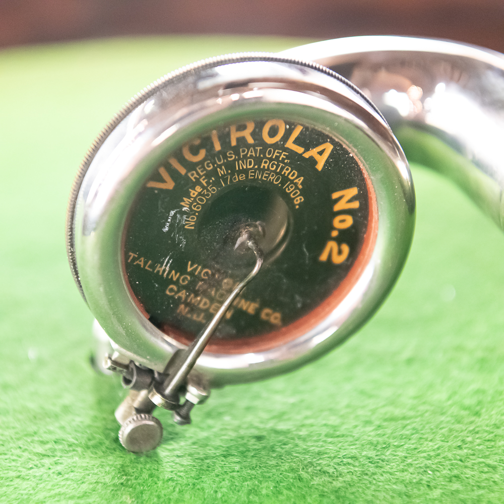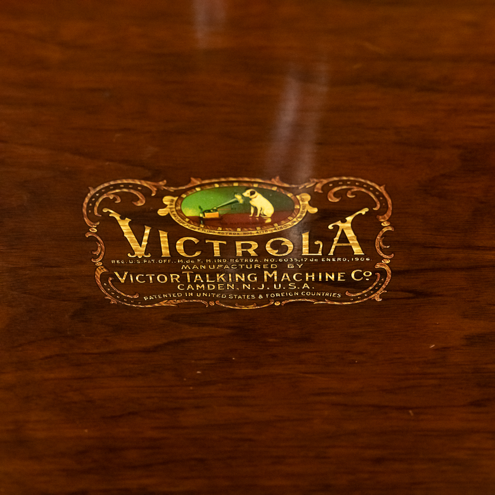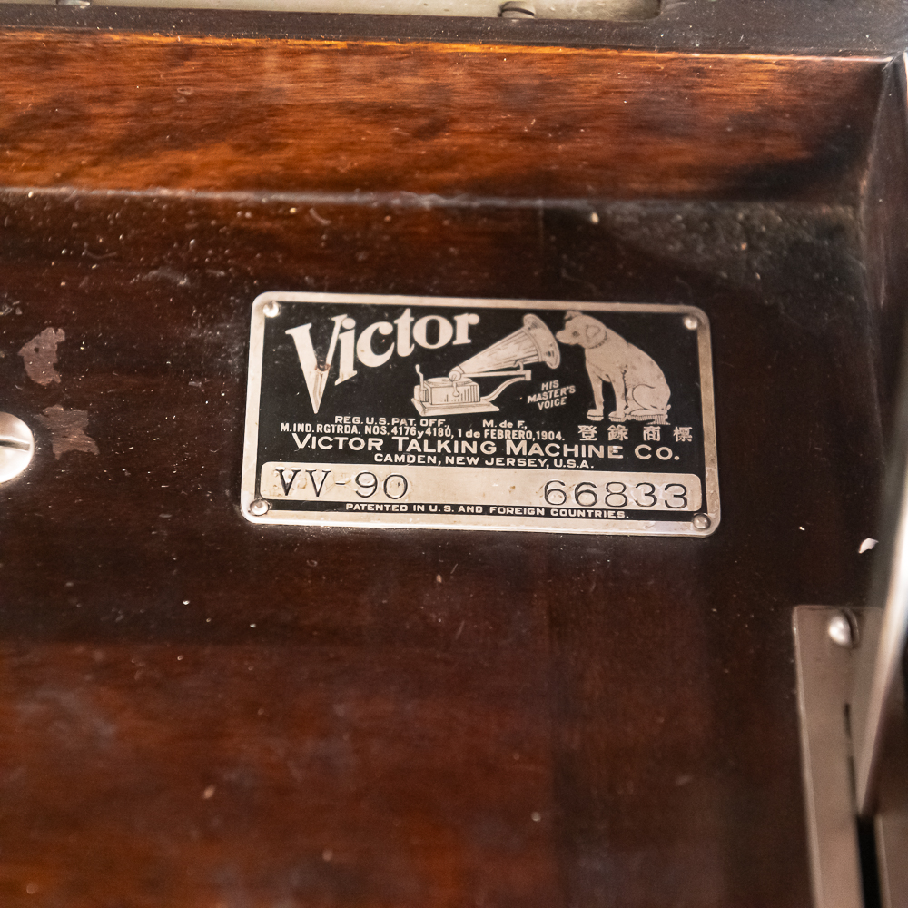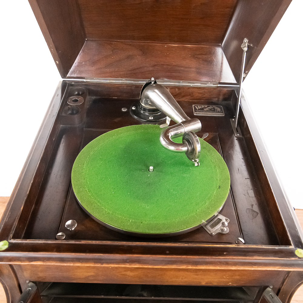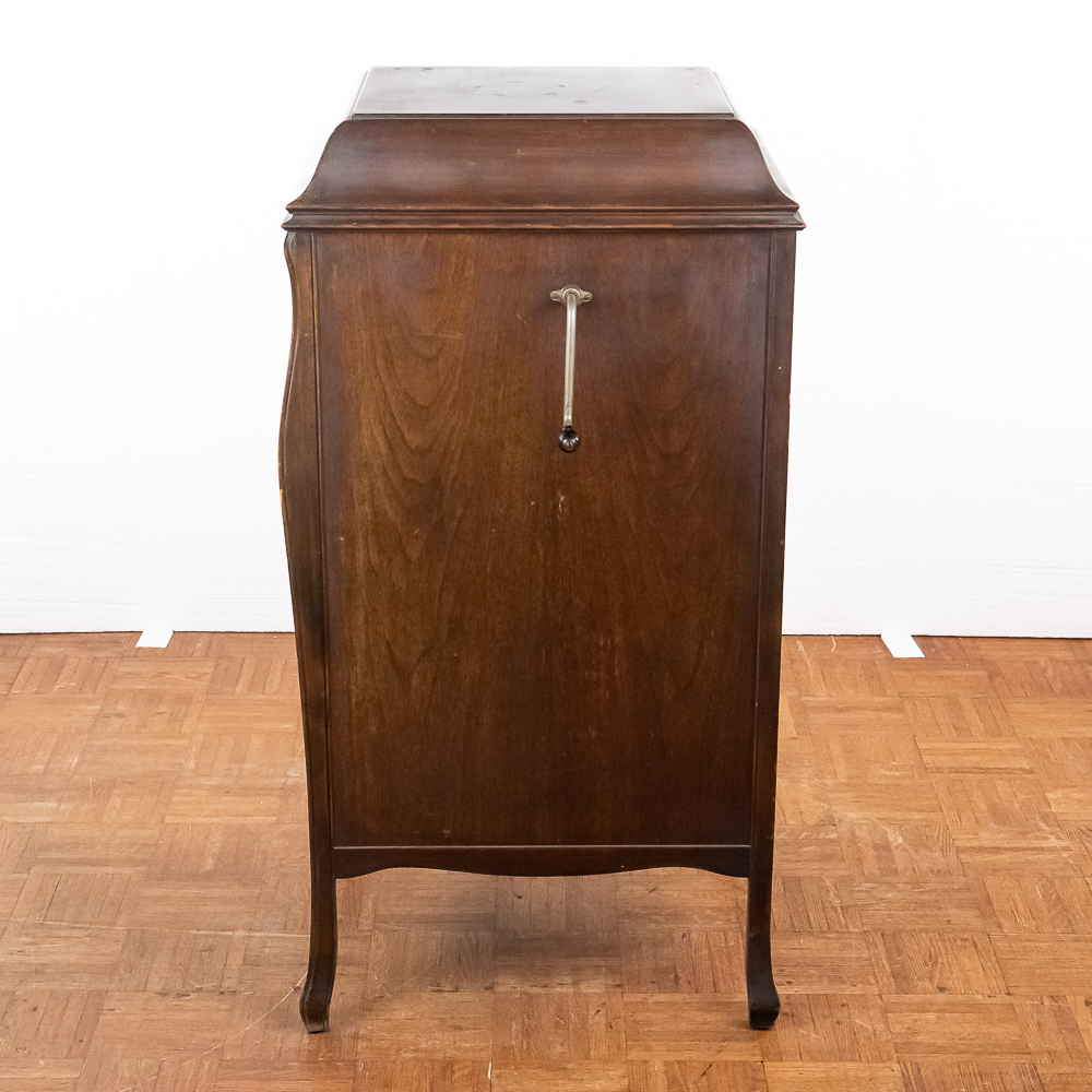This machine in its American walnut cabinet has its original finish which is lightly crazed throughout with a few minor rings and impressions on the top cover as well as a few minor nicks and scrapes here and there and is in otherwise average as found condition. See photos. The Victrola #2 reproducer, tone arm, needle cup, hardware and crank all have their original nickel plating all in average condition. Motor winds and runs. The record storage compartment has its complete original interior. Cabinet measures 19″ W X 21″ D X 41-1/2″ T. From the Jeff Young Collection.