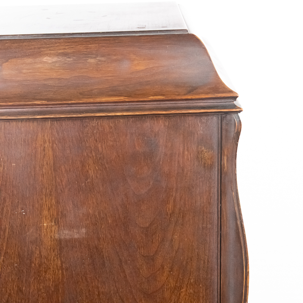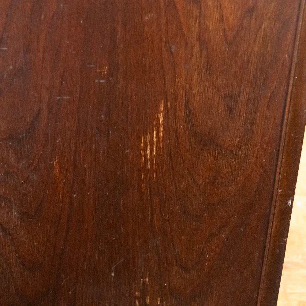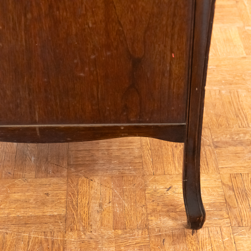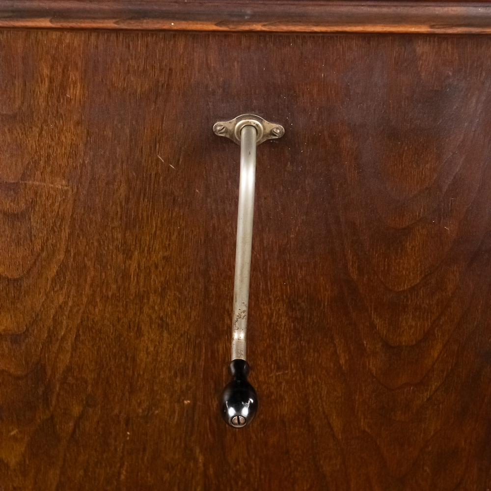This machine in its American walnut cabinet has its original finish which is lightly crazed throughout with a few minor rings and impressions on the top cover as well as a few minor nicks and scrapes here and there and is in otherwise average as found condition. See photos. The Victrola #2 reproducer, tone arm, needle cup, hardware and crank all have their original nickel plating all in average condition. Motor winds and runs. The record storage compartment has its complete original interior. Cabinet measures 19″ W X 21″ D X 41-1/2″ T. From the Jeff Young Collection.