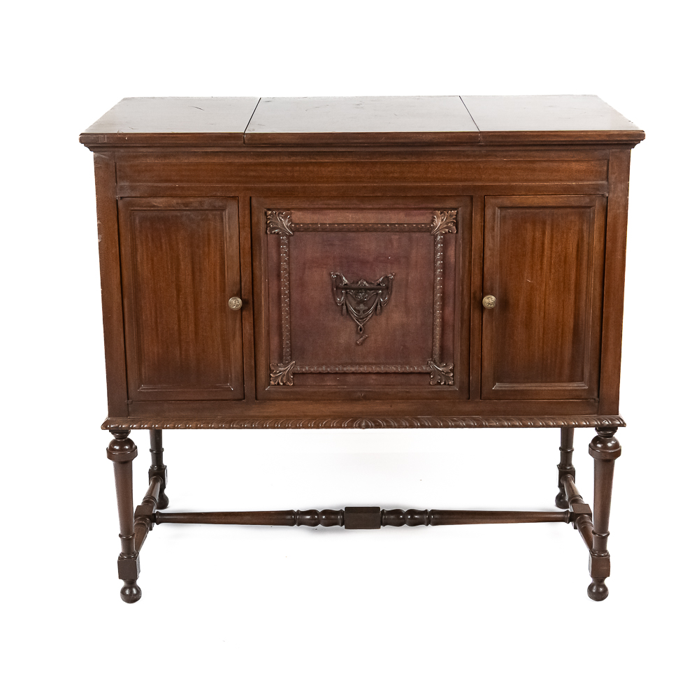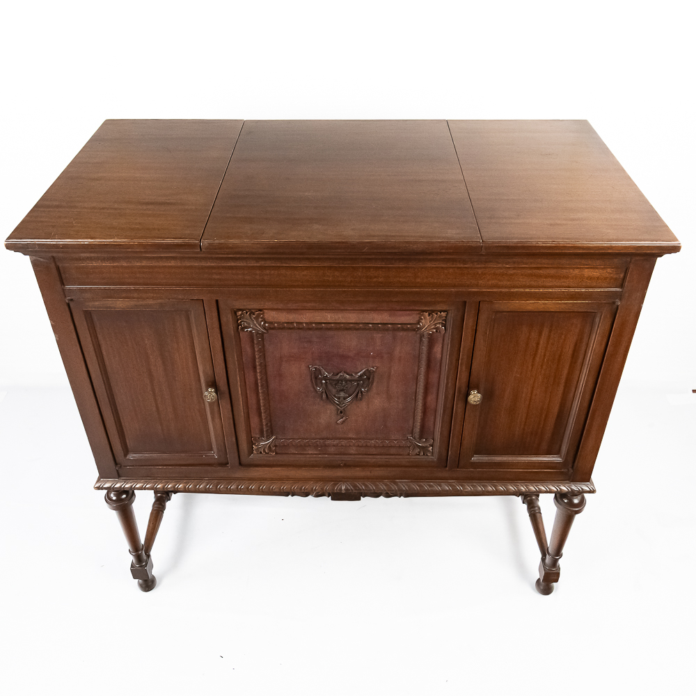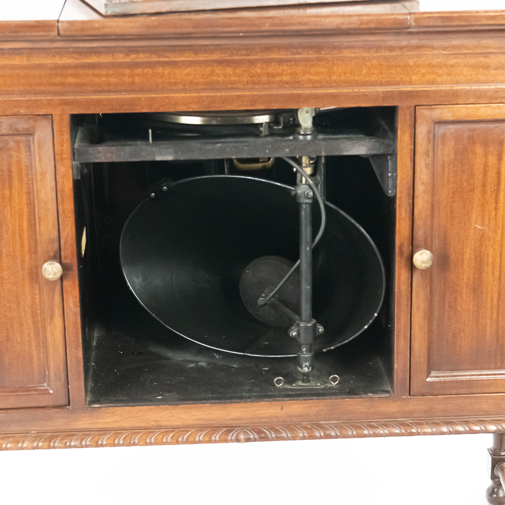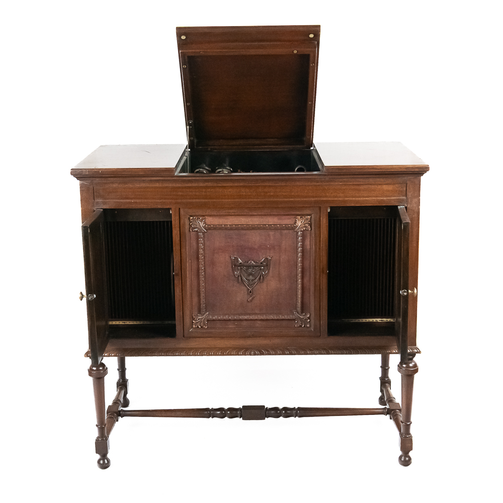This machine in its mahogany cabinet has been refinished and is lighter than the original finish. Has several nicks, scratches and stains on the top and the top cover. The legs and stretchers are steady and tight. Has its original front grill with its grill cloth with all of its decorative trim and central motif in good condition. Has its original cabinet knobs and both record storage compartments have their original interiors in good condition. Machine comes with 2 reproducers – one standard and one long play – both with good stylus and appear to have new diaphragms in overall good condition. The reproducers, horn elbow, and other metal fittings have their original oxidized brass finish all of which are in good condition. The double spring motor is equipped with 2 speed gearing as well as a 10/12″ cueing device. Has its original winding crank and the motor winds and runs. Cabinet measures 40″ X 21″ X 37″ T.