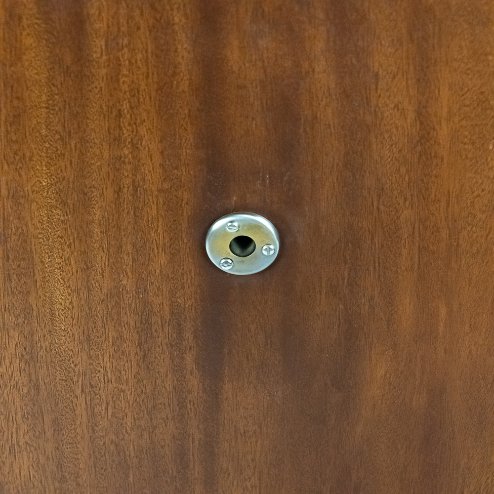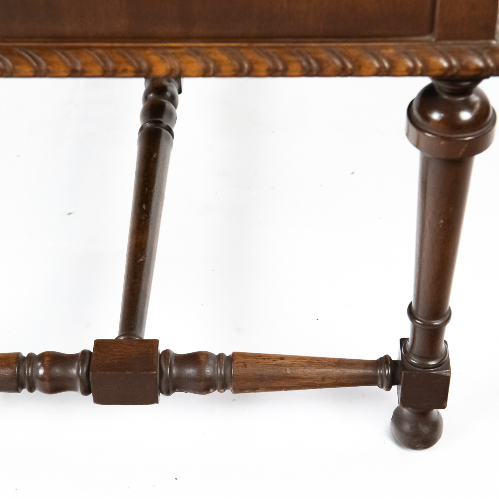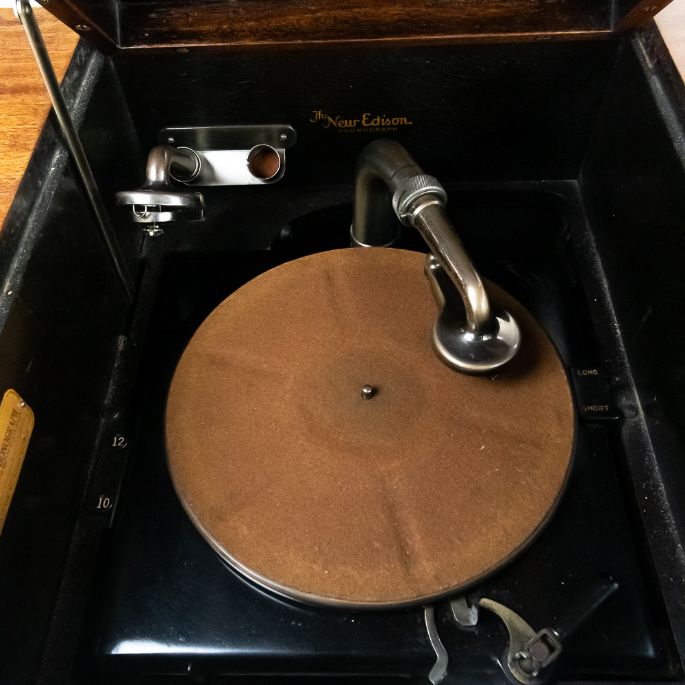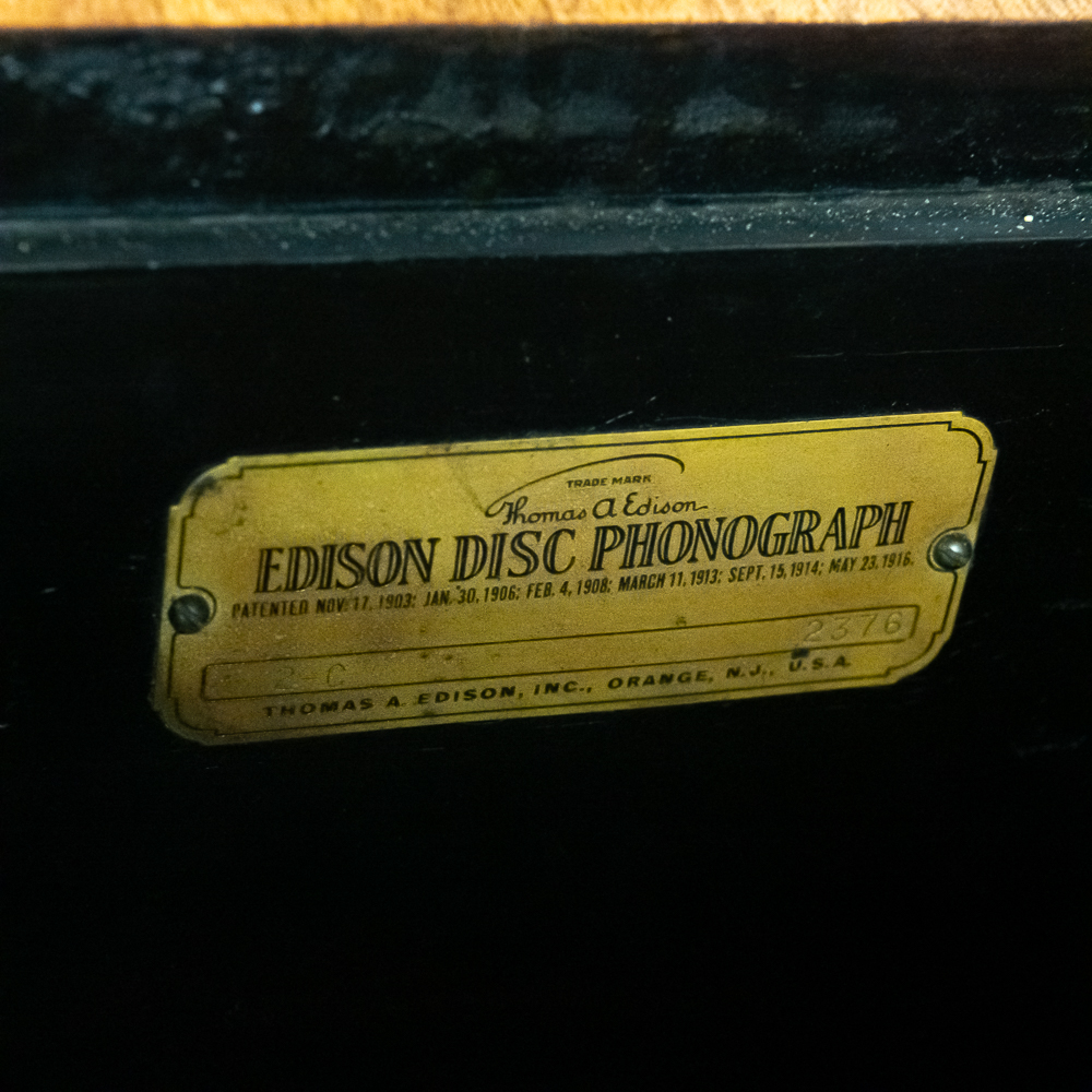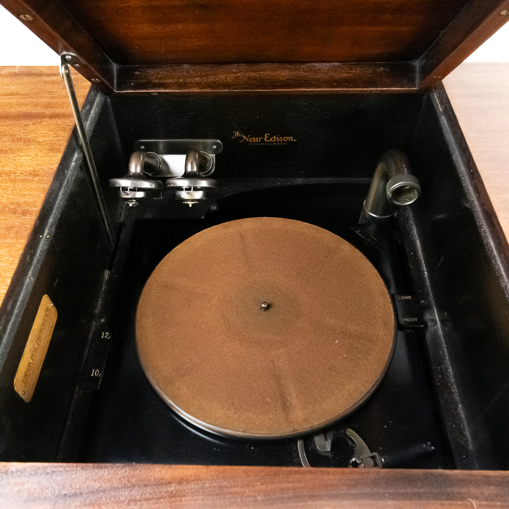 This machine in its mahogany cabinet has been refinished and is lighter than the original finish. Has several nicks, scratches and stains on the top and the top cover. The legs and stretchers are steady and tight. Has its original front grill with its grill cloth with all of its decorative trim and central motif in good condition. Has its original cabinet knobs and both record storage compartments have their original interiors in good condition. Machine comes with 2 reproducers – one standard and one long play – both with good stylus and appear to have new diaphragms in overall good condition. The reproducers, horn elbow, and other metal fittings have their original oxidized brass finish all of which are in good condition. The double spring motor is equipped with 2 speed gearing as well as a 10/12″ cueing device. Has its original winding crank and the motor winds and runs. Cabinet measures 40″ X 21″ X 37″ T.