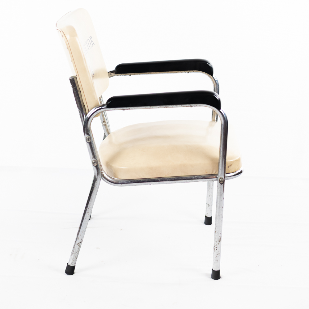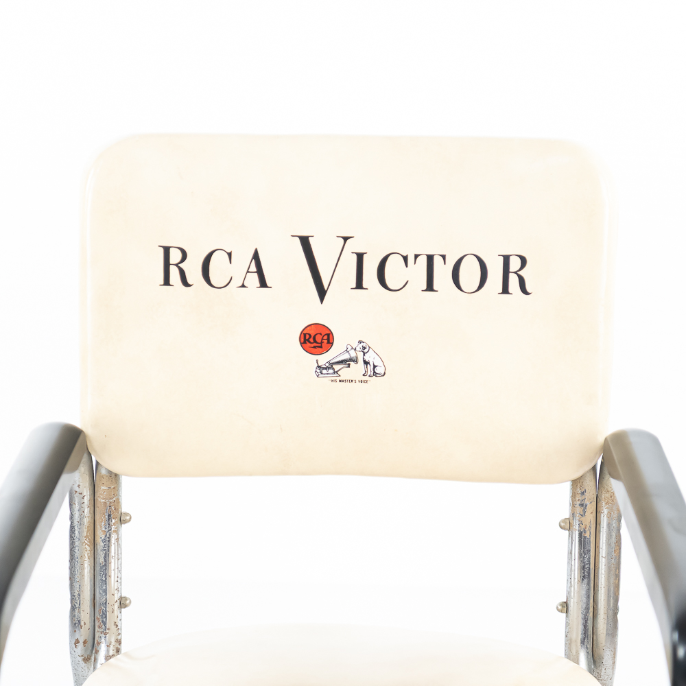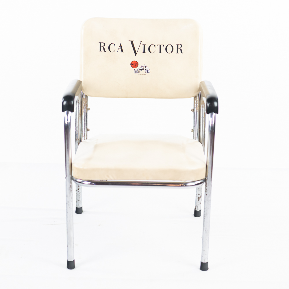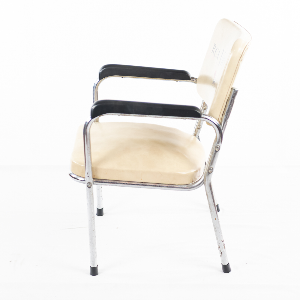 This chair has a chrome plated frame. In overall VG condition. The heavy off white seat covering in in VG condition with no rips or tears. Marked on bottom of seat back TRADEMARKS PROPERTY OF RCA VICTIOR COMPANY OF AMERICA. From the Jeff Young Collection.