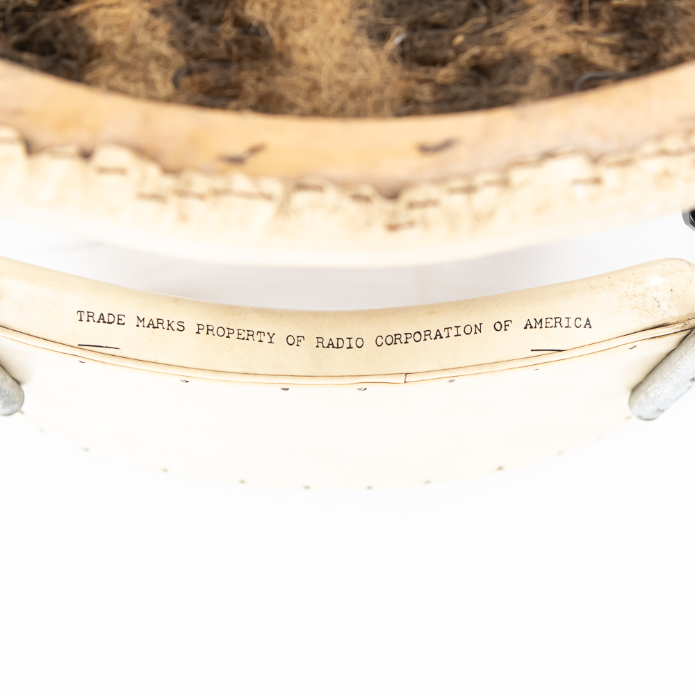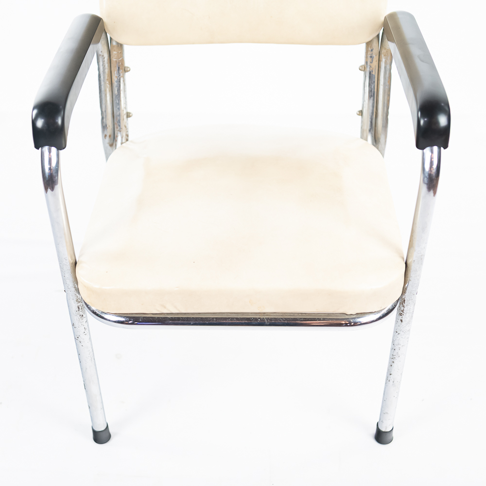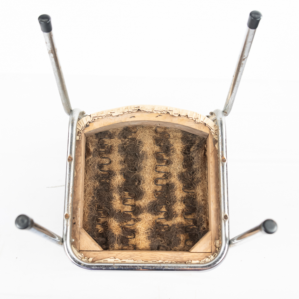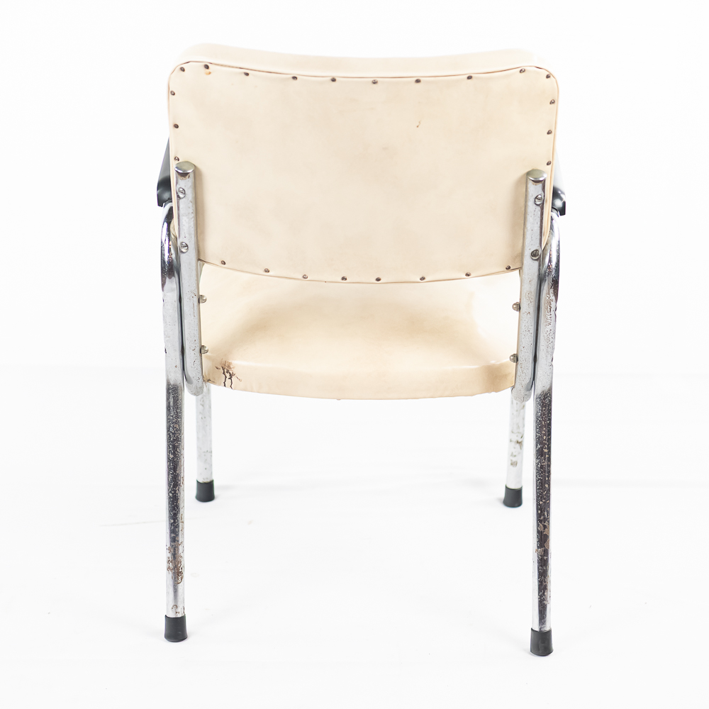 This chair has a chrome plated frame. In overall VG condition. The heavy off white seat covering in in VG condition with no rips or tears. Marked on bottom of seat back TRADEMARKS PROPERTY OF RCA VICTIOR COMPANY OF AMERICA. From the Jeff Young Collection.