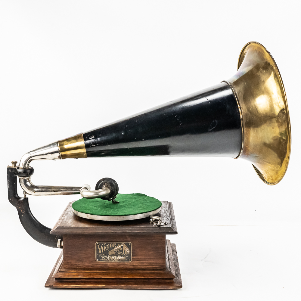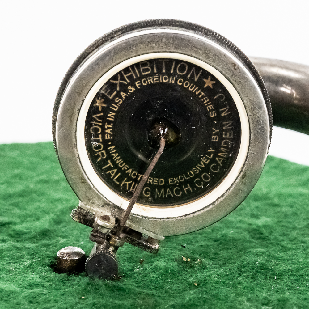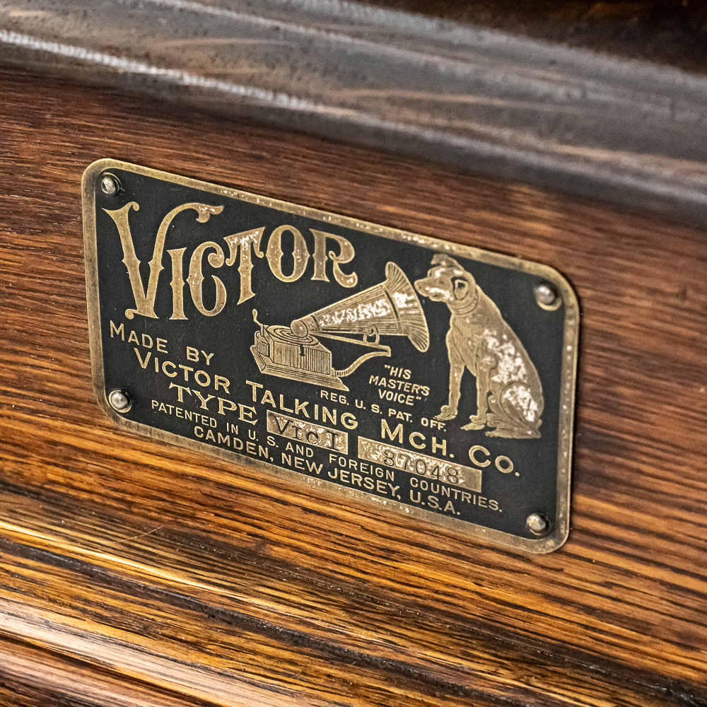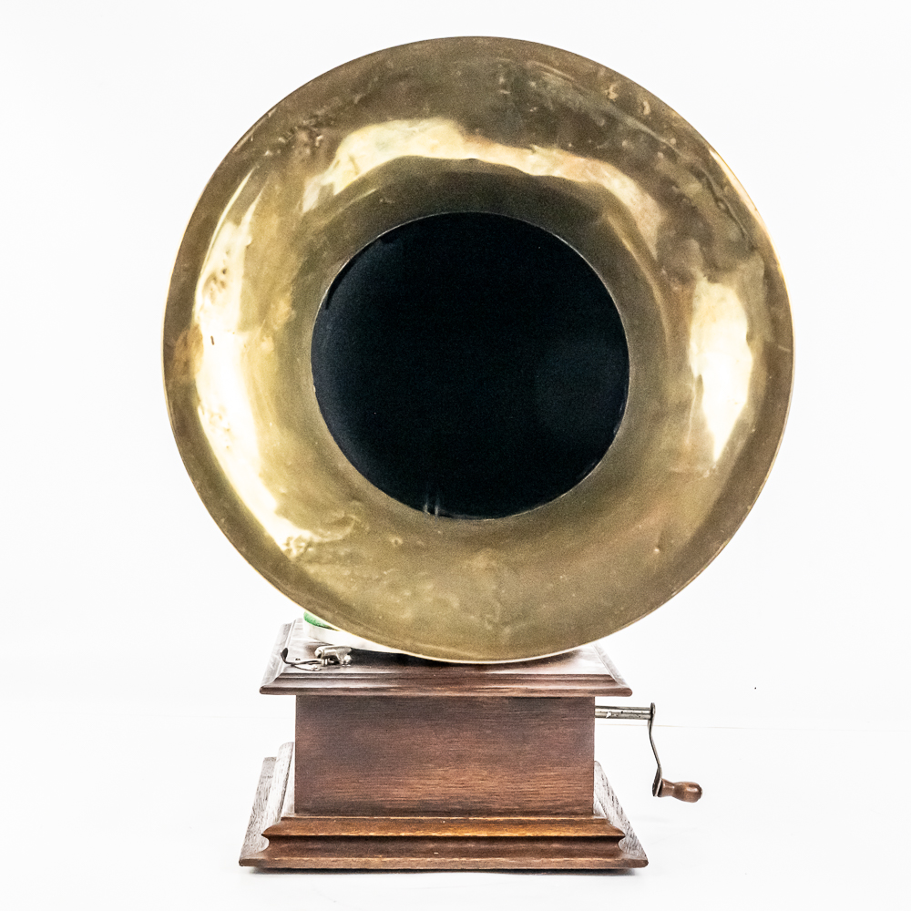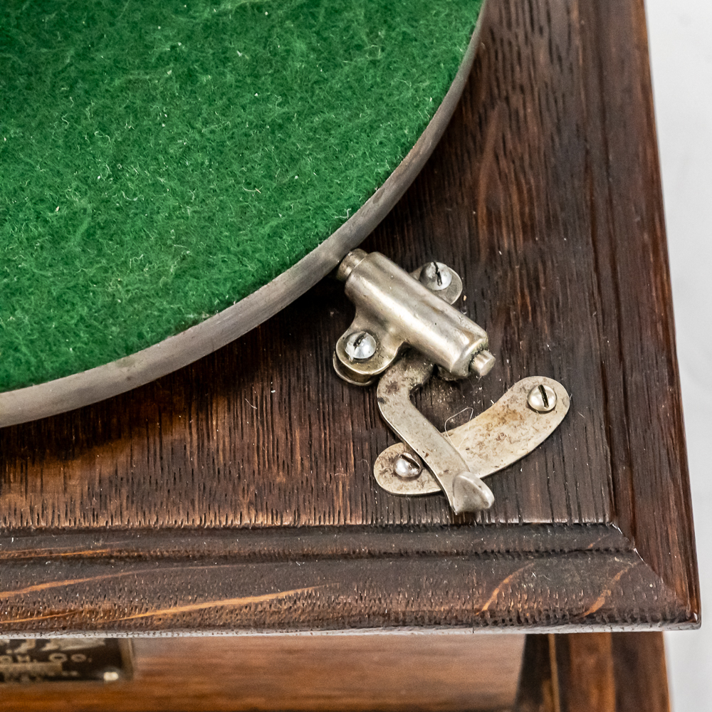 This machine in its first style oak cabinet has its original finish but has evidence of having been cleaned. Has nice tight corners and is in overall good condition and presents well. Has an exhibition reproducer which has been rebuilt with a new rubber back flange. The tone arm, horn elbow, and horn elbow hold down all have their original nickel plating in average condition with the usual wear. Both tone arm and elbow have a few small dents with some rust on the horn elbow hold down. The back bracket has its original black paint and pinstripes in fair condition. Has reproduction mounting thumb screws. Has its original bullet break that is attached with modern replacement screws. Has a reproduction winding crank and the motor winds and runs. Has a 19″ L Victor black and brass horn with a 13-1/2″ Diameter bell. The bell has several dents and wrinkles and the horn body has been repainted and redecaled in average condition. This horn is oversized for this machine as a result has an original reducing collar which allows it to fit. This reducing collar has been polished to the brass and therefore has none of its nickel plating remaining. Cabinet measures 10-1/2″ X 11-1/4″ X 5-1/2″ T