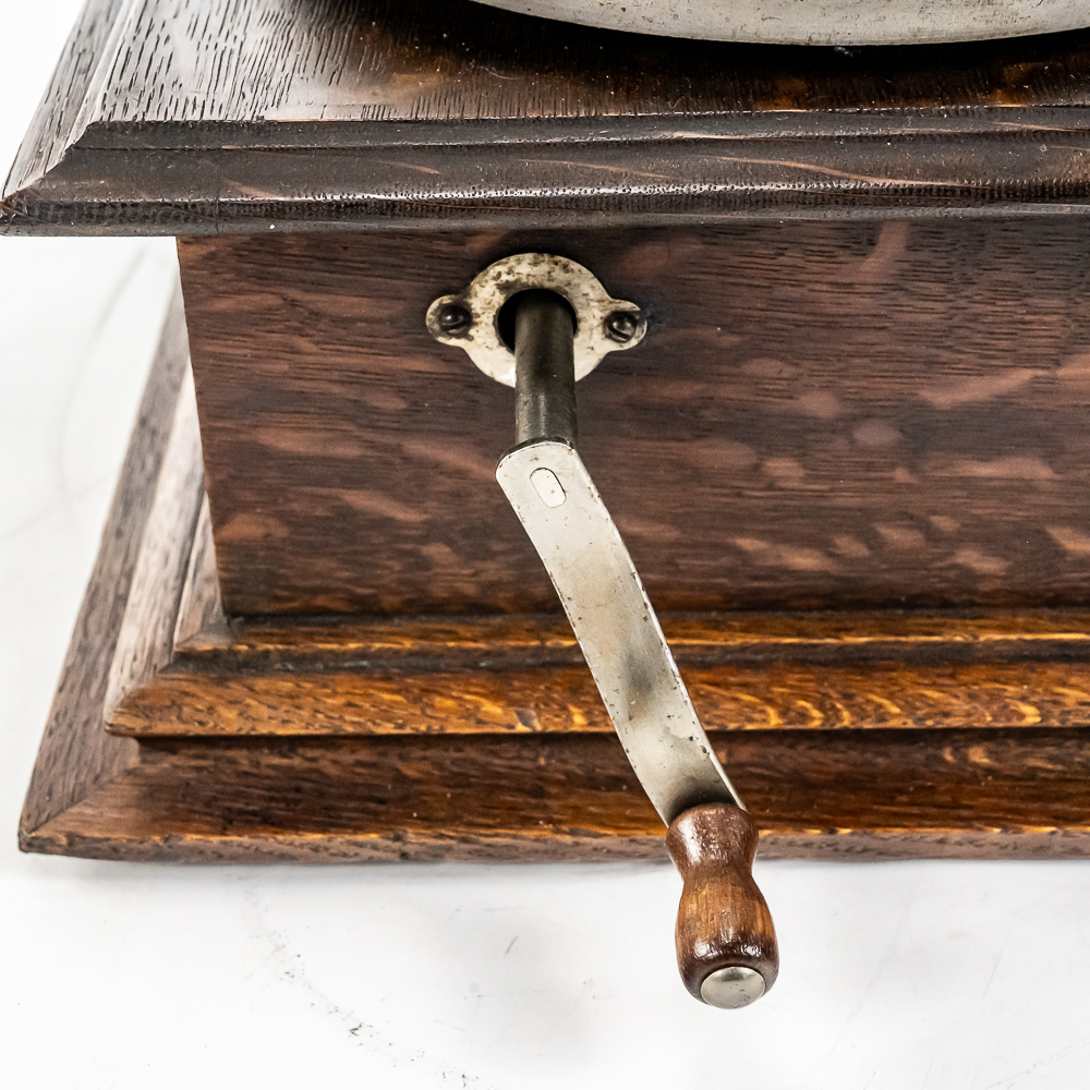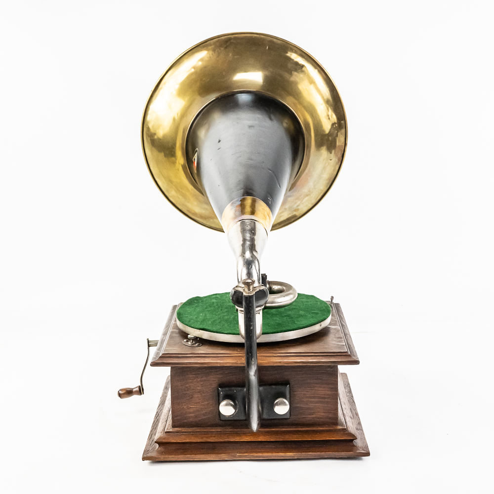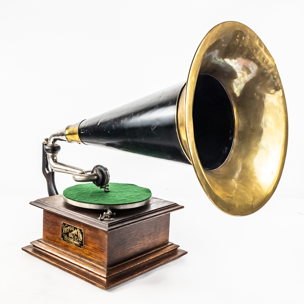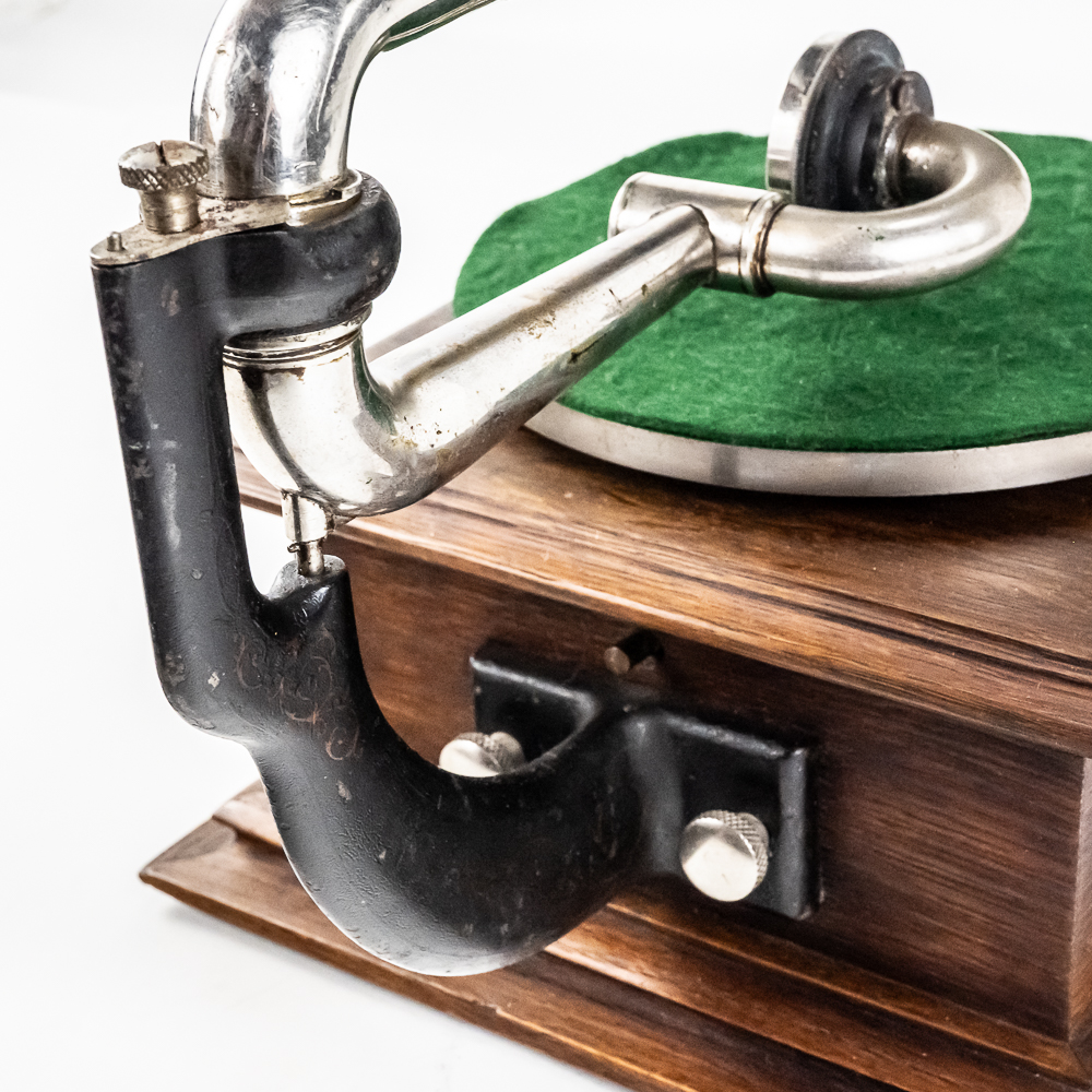 This machine in its first style oak cabinet has its original finish but has evidence of having been cleaned. Has nice tight corners and is in overall good condition and presents well. Has an exhibition reproducer which has been rebuilt with a new rubber back flange. The tone arm, horn elbow, and horn elbow hold down all have their original nickel plating in average condition with the usual wear. Both tone arm and elbow have a few small dents with some rust on the horn elbow hold down. The back bracket has its original black paint and pinstripes in fair condition. Has reproduction mounting thumb screws. Has its original bullet break that is attached with modern replacement screws. Has a reproduction winding crank and the motor winds and runs. Has a 19″ L Victor black and brass horn with a 13-1/2″ Diameter bell. The bell has several dents and wrinkles and the horn body has been repainted and redecaled in average condition. This horn is oversized for this machine as a result has an original reducing collar which allows it to fit. This reducing collar has been polished to the brass and therefore has none of its nickel plating remaining. Cabinet measures 10-1/2″ X 11-1/4″ X 5-1/2″ T