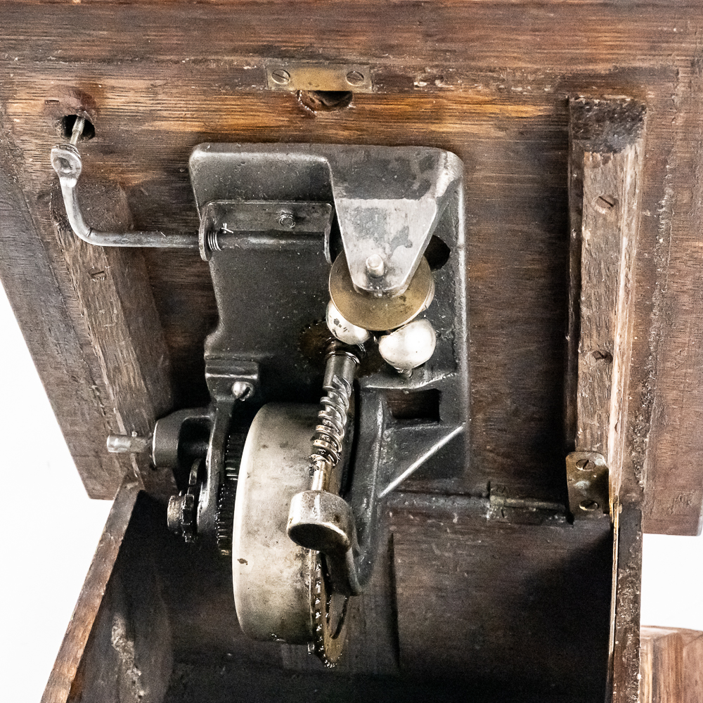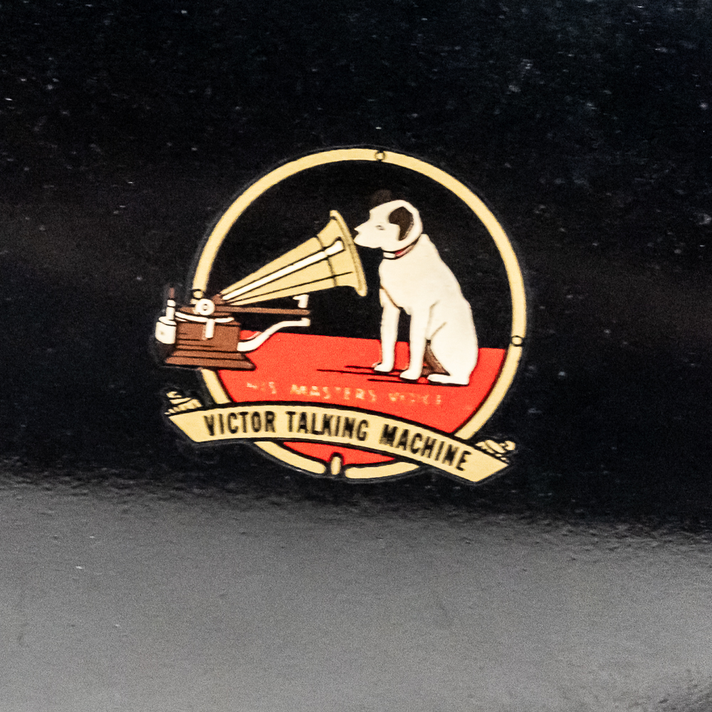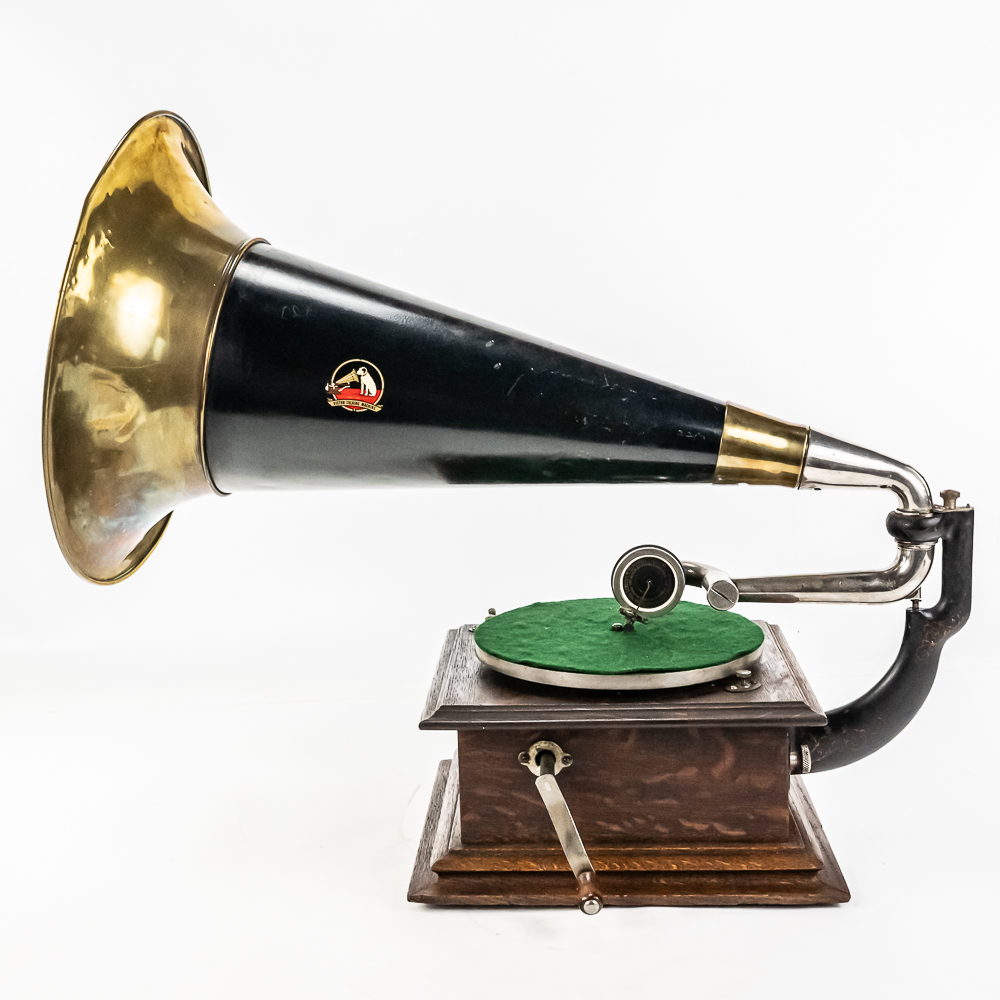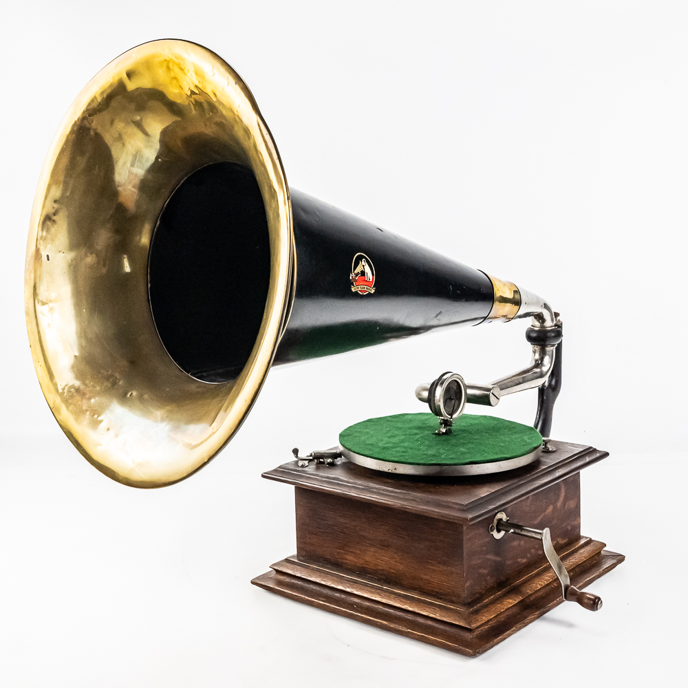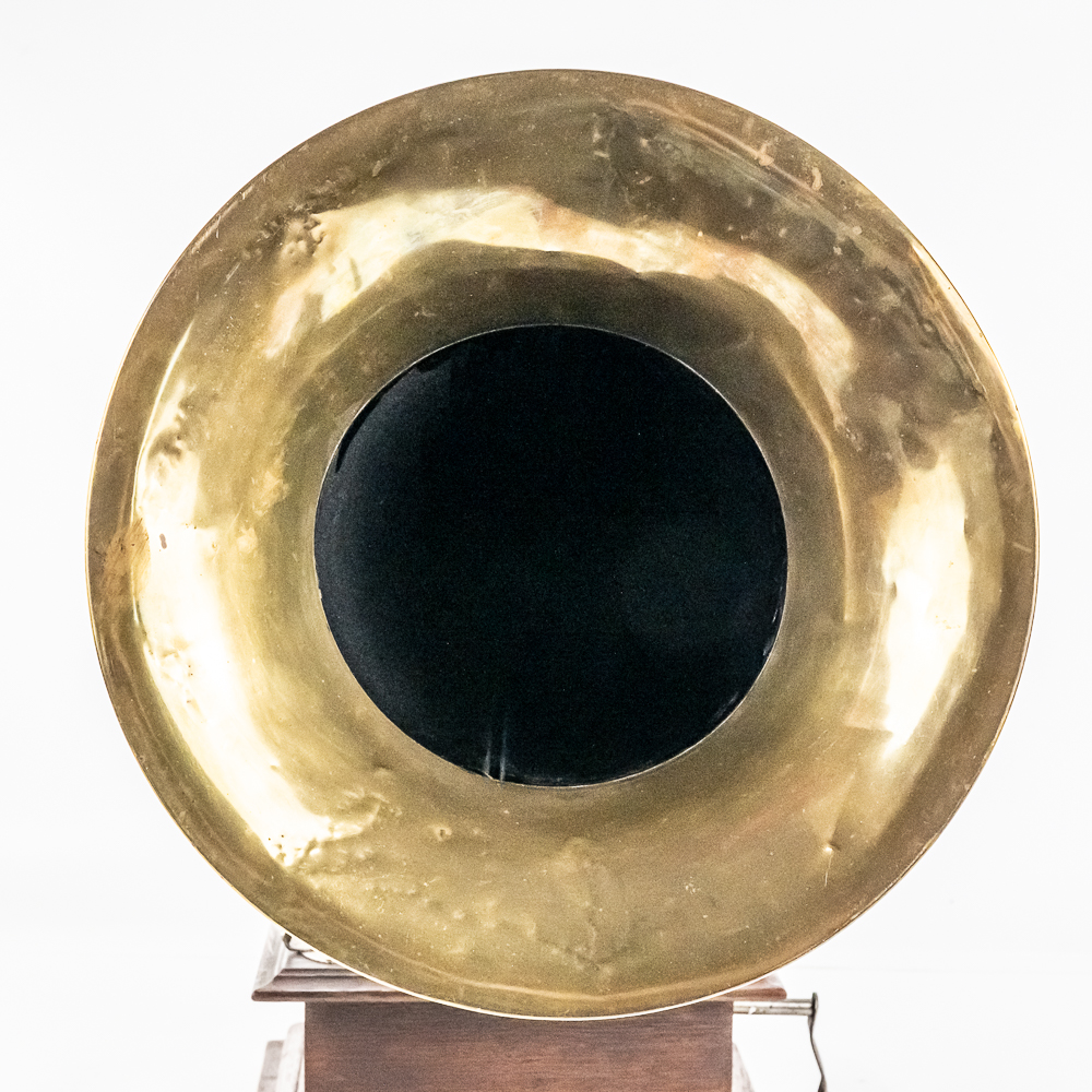 This machine in its first style oak cabinet has its original finish but has evidence of having been cleaned. Has nice tight corners and is in overall good condition and presents well. Has an exhibition reproducer which has been rebuilt with a new rubber back flange. The tone arm, horn elbow, and horn elbow hold down all have their original nickel plating in average condition with the usual wear. Both tone arm and elbow have a few small dents with some rust on the horn elbow hold down. The back bracket has its original black paint and pinstripes in fair condition. Has reproduction mounting thumb screws. Has its original bullet break that is attached with modern replacement screws. Has a reproduction winding crank and the motor winds and runs. Has a 19″ L Victor black and brass horn with a 13-1/2″ Diameter bell. The bell has several dents and wrinkles and the horn body has been repainted and redecaled in average condition. This horn is oversized for this machine as a result has an original reducing collar which allows it to fit. This reducing collar has been polished to the brass and therefore has none of its nickel plating remaining. Cabinet measures 10-1/2″ X 11-1/4″ X 5-1/2″ T