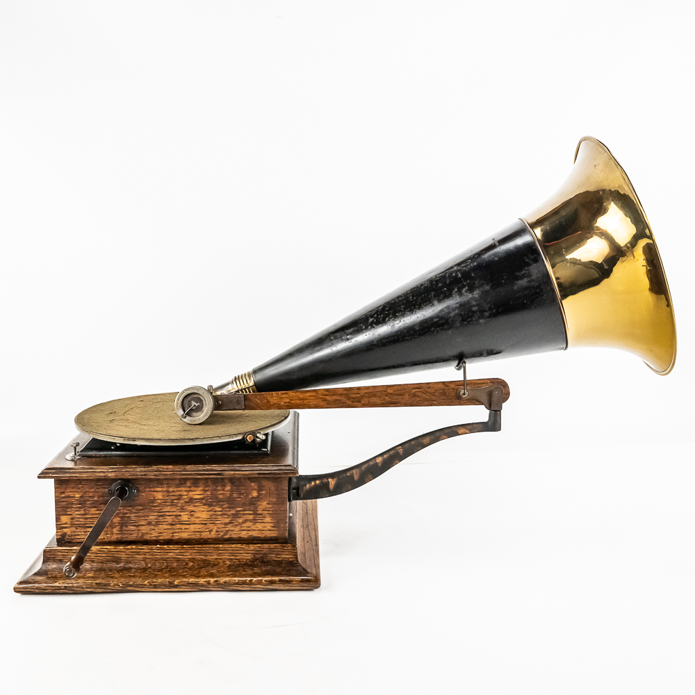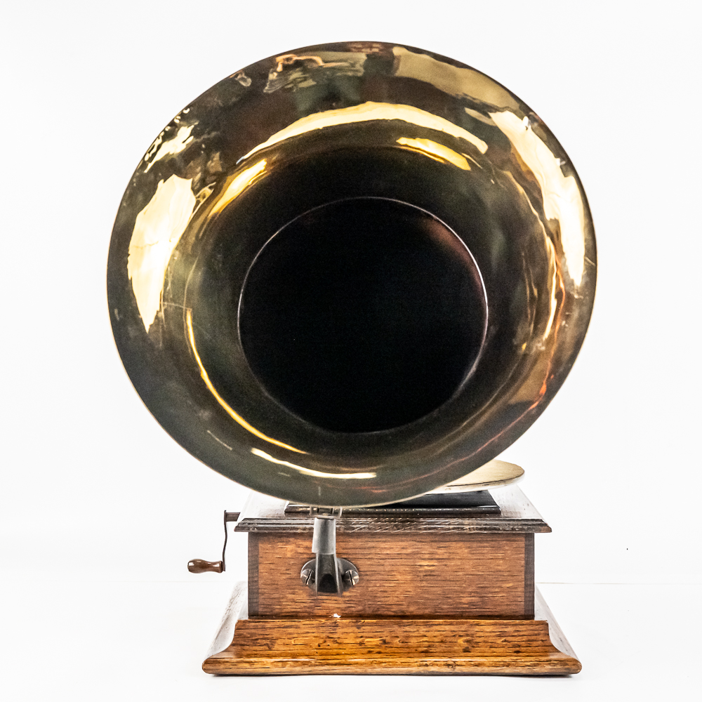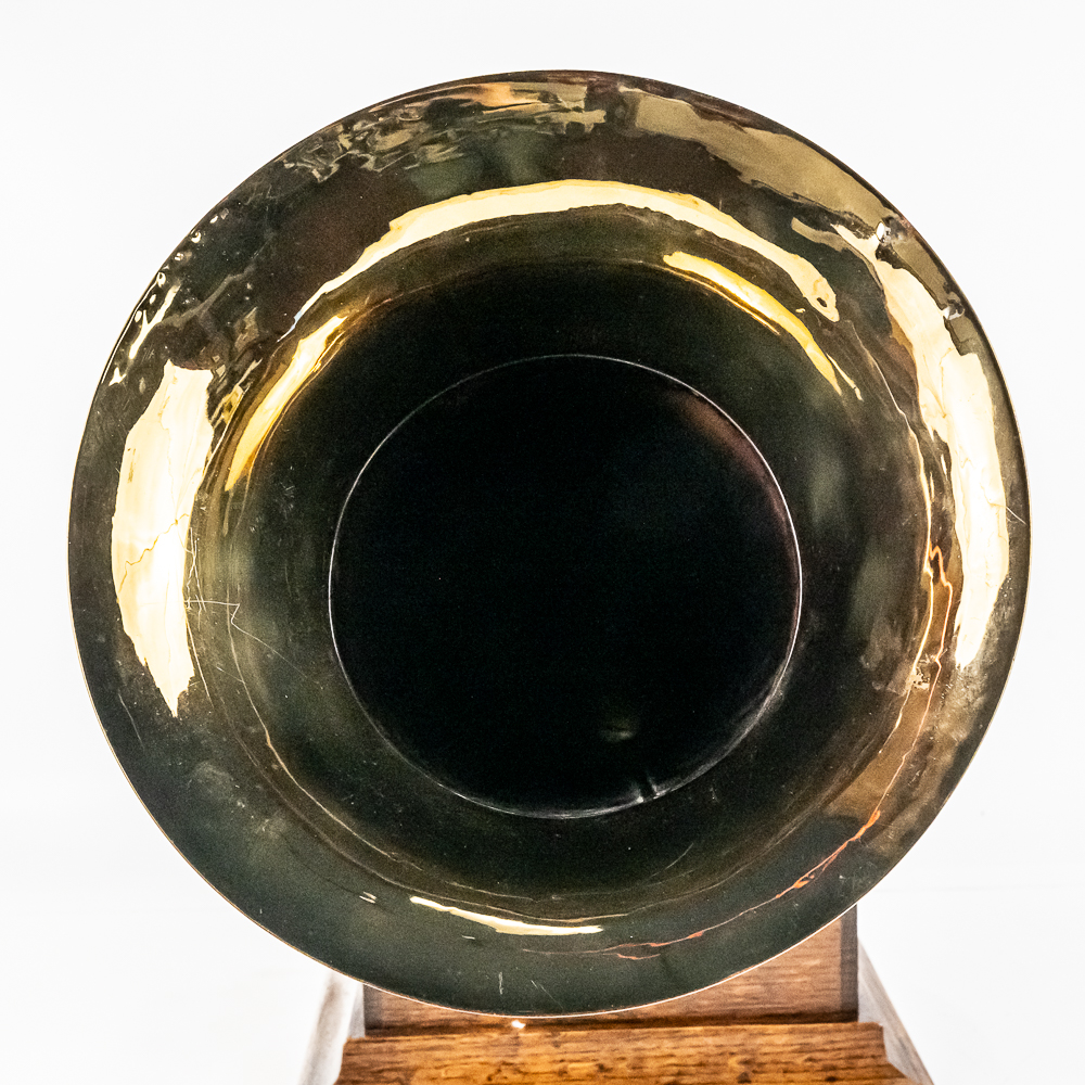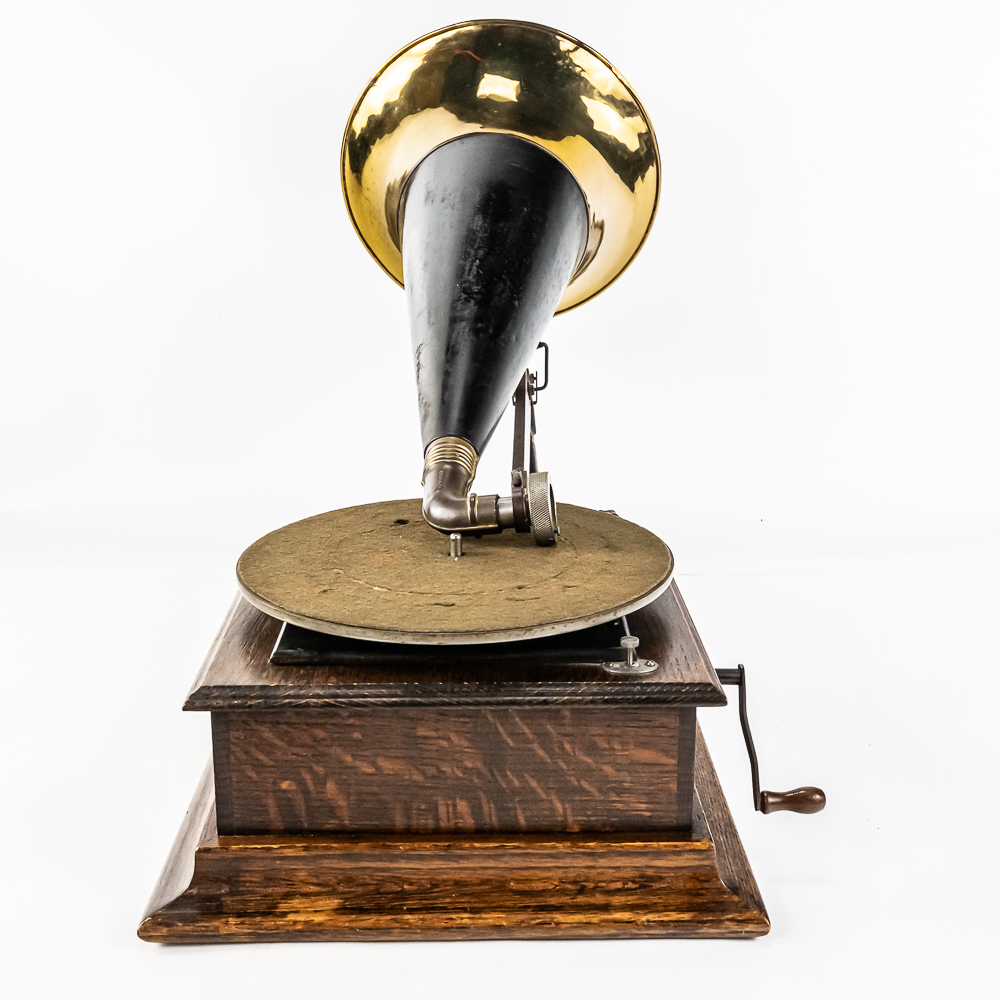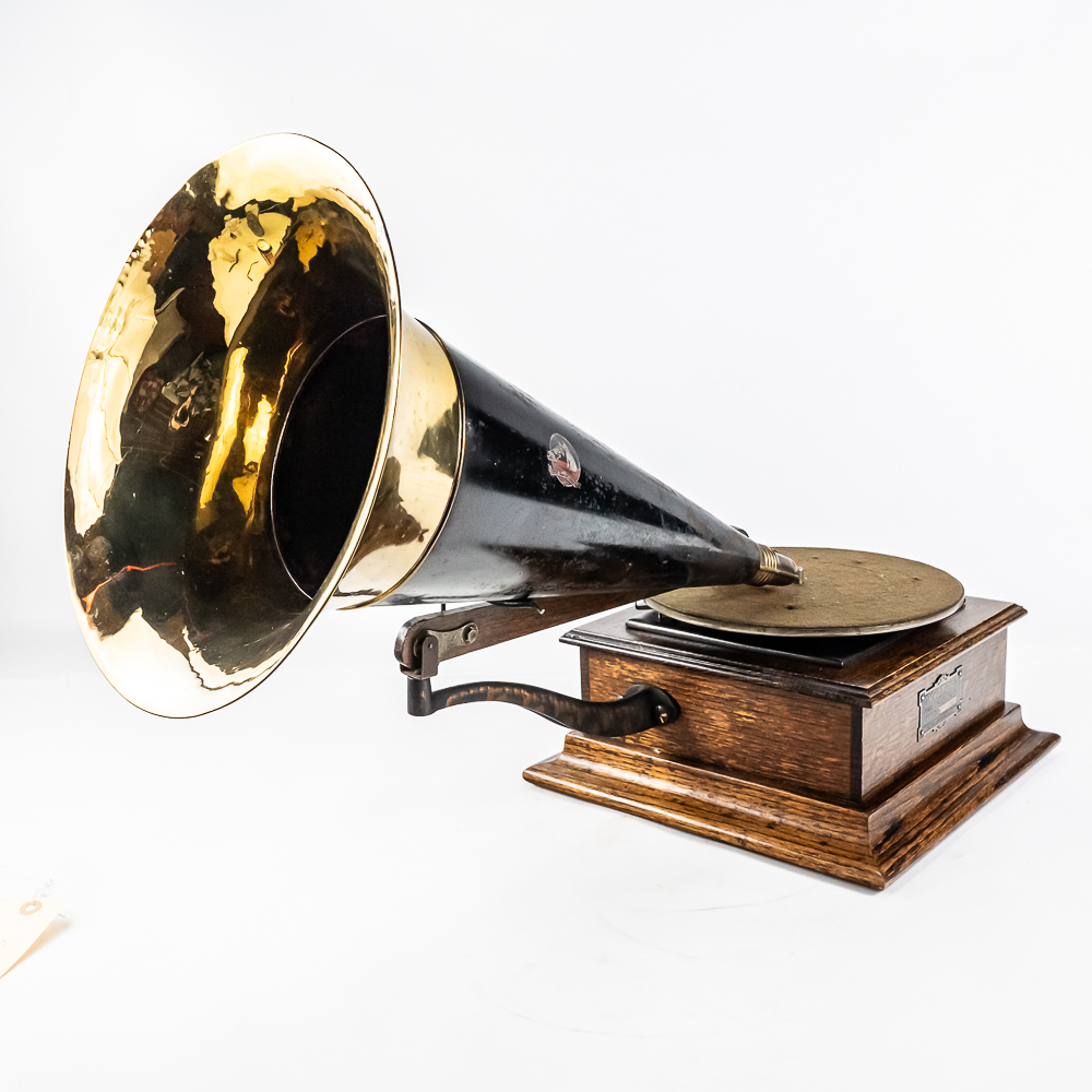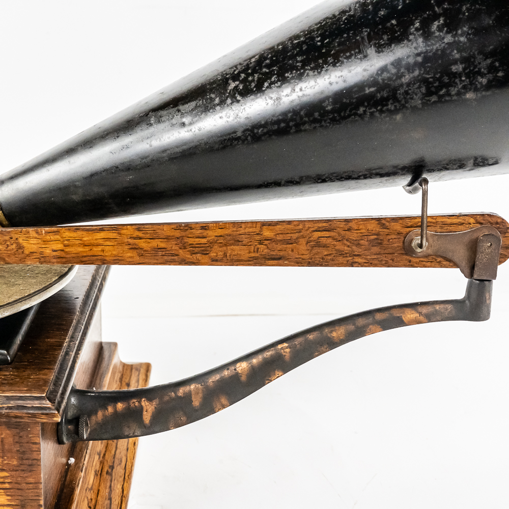 This machine in its oak cabinet has its original finish and appears to be lightly recoated with some minor finish loss and is in good condition and presents well. Has an original pre dog ID tag. Has an original concert long throat reproducer in average condition with a sloppy glue repair at the center of the diaphragm. Has its original tone arm with all of its original hardware with some rust and the usual finish wear. The lower support bracket and thumb screws have their original oxidized copper finish in average condition. The cast iron bed plate has its original oxidized copper finish with some minor rust and is in otherwise in good condition. Has its original slotted winding crank with some rust and usual wear and the motor winds and runs. Has an original 19-1/2″ Long black and brass horn with a 11-1/2″ Diameter bell. The bell has been brightly polished with a few minor dings. The body has its original black paint and decal with some rust and wear but in fair condition. Has its original threaded brass elbow attached to the small end of the horn in average condition however the rubber bushing is old and hard and needs to be replaced. Cabinet measures 12-1/2″ X 12-1/2″ X 5-1/2″ T
