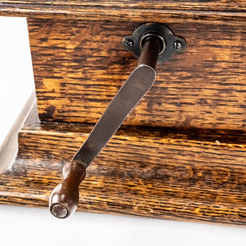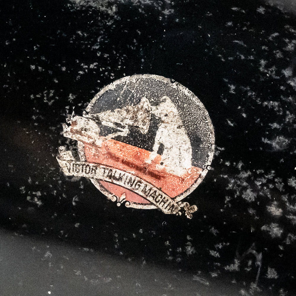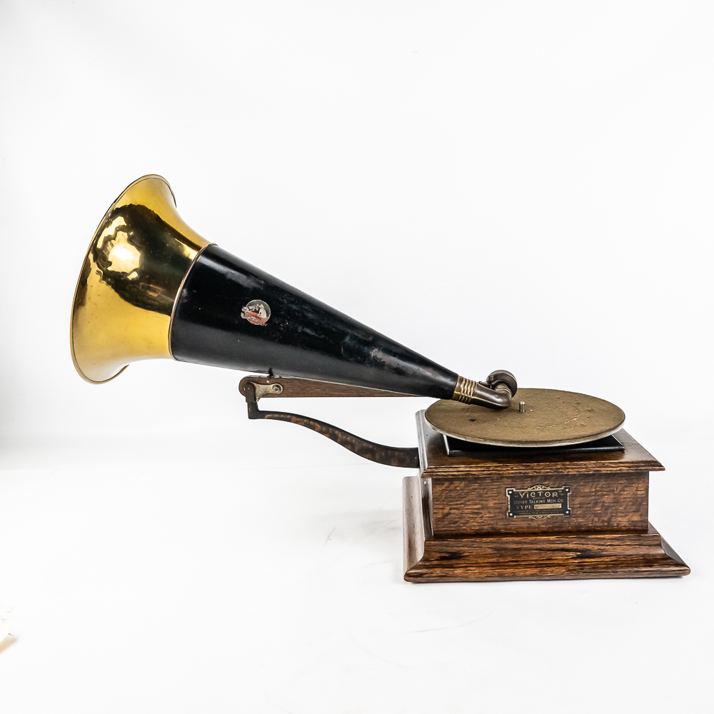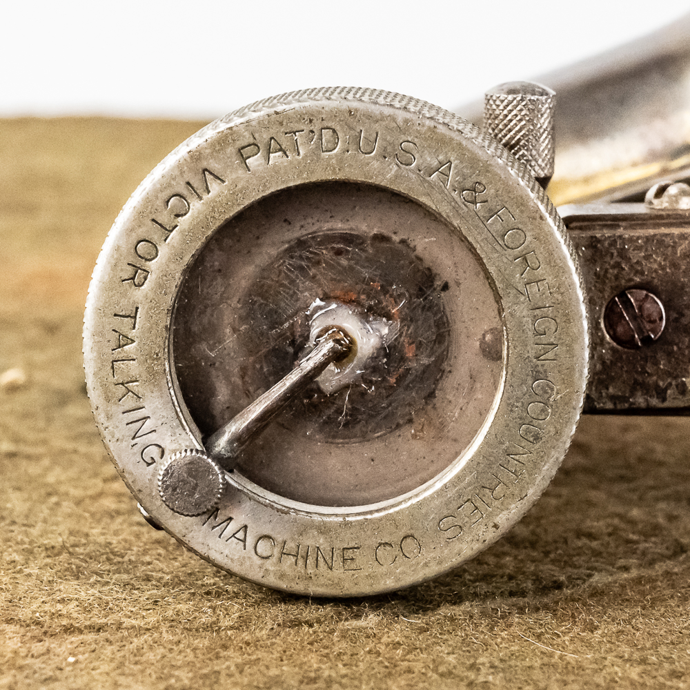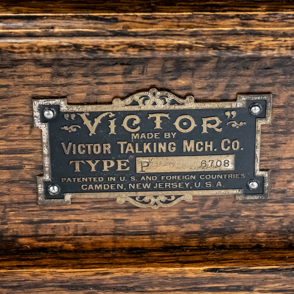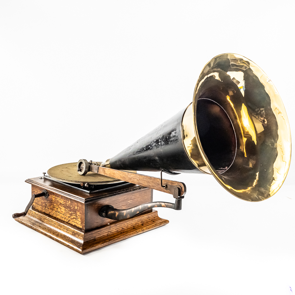 This machine in its oak cabinet has its original finish and appears to be lightly recoated with some minor finish loss and is in good condition and presents well. Has an original pre dog ID tag. Has an original concert long throat reproducer in average condition with a sloppy glue repair at the center of the diaphragm. Has its original tone arm with all of its original hardware with some rust and the usual finish wear. The lower support bracket and thumb screws have their original oxidized copper finish in average condition. The cast iron bed plate has its original oxidized copper finish with some minor rust and is in otherwise in good condition. Has its original slotted winding crank with some rust and usual wear and the motor winds and runs. Has an original 19-1/2″ Long black and brass horn with a 11-1/2″ Diameter bell. The bell has been brightly polished with a few minor dings. The body has its original black paint and decal with some rust and wear but in fair condition. Has its original threaded brass elbow attached to the small end of the horn in average condition however the rubber bushing is old and hard and needs to be replaced. Cabinet measures 12-1/2″ X 12-1/2″ X 5-1/2″ T