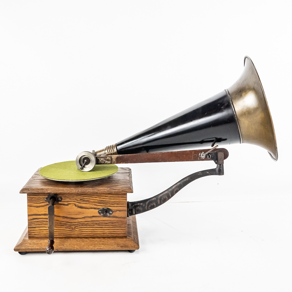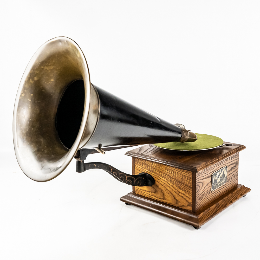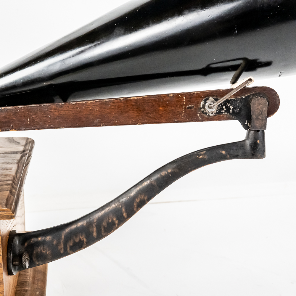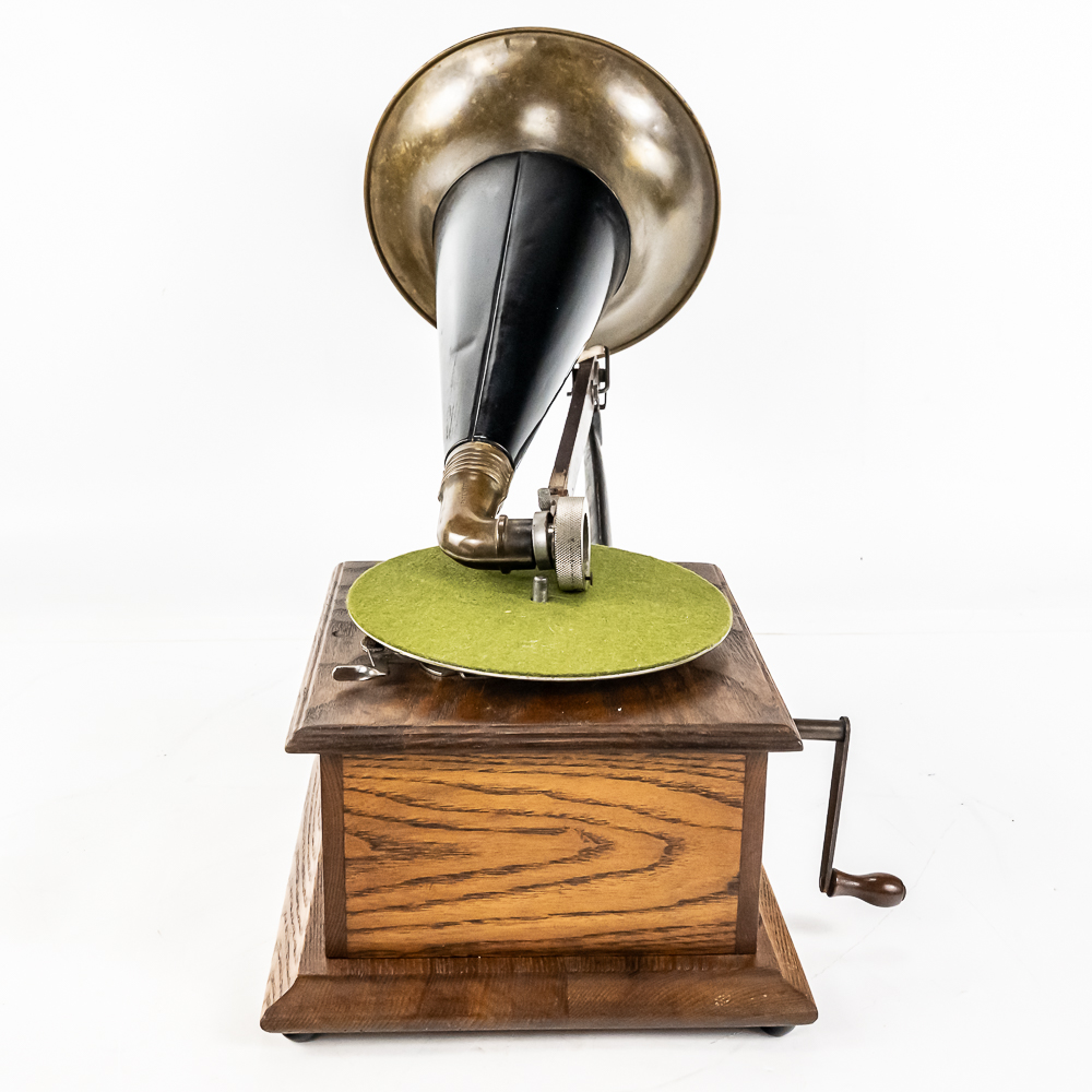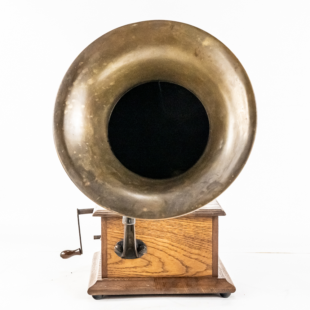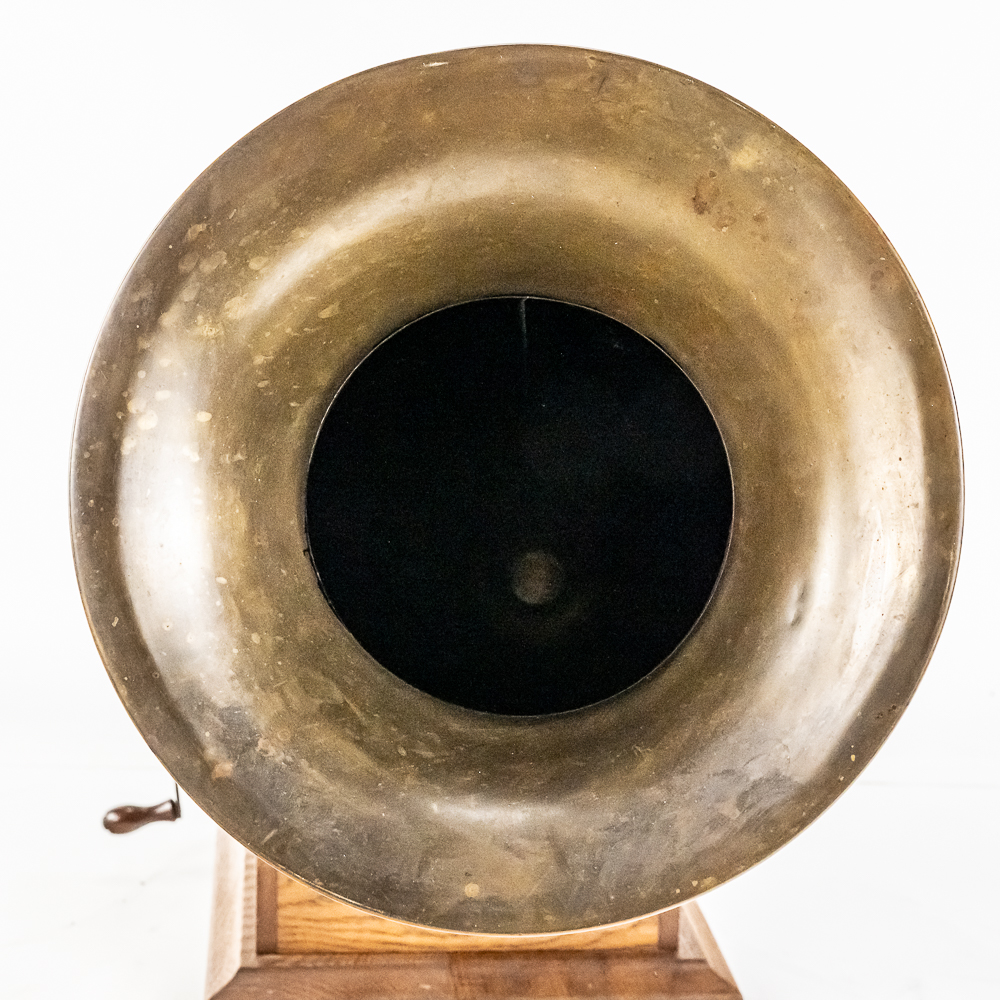 This machine in its oak cabinet has been refinished in overall good condition and presents well. Has a high quality reproduction Victor long throat reproducer in new condition. The original wooden tone arm has its original finish and all of its original hardware in fair condition with some rust and finish loss See photos. Has its original cast iron lower support arm and thumb screws with their original oxidized copper finish in average condition. The original cast iron turntable has replacement felt. Has its original slotted winding crank with some rust and the motor winds and runs. Has an original 14-1/2″ brass and black horn with a 9-1/2″ Diameter brass bell. Both bell and body are in average condition with a few minor dings. Has an original threaded brass elbow attached to the small end of the horn in average condition Cabinet measures 9″ X 10″ X 5-1/2″ T.