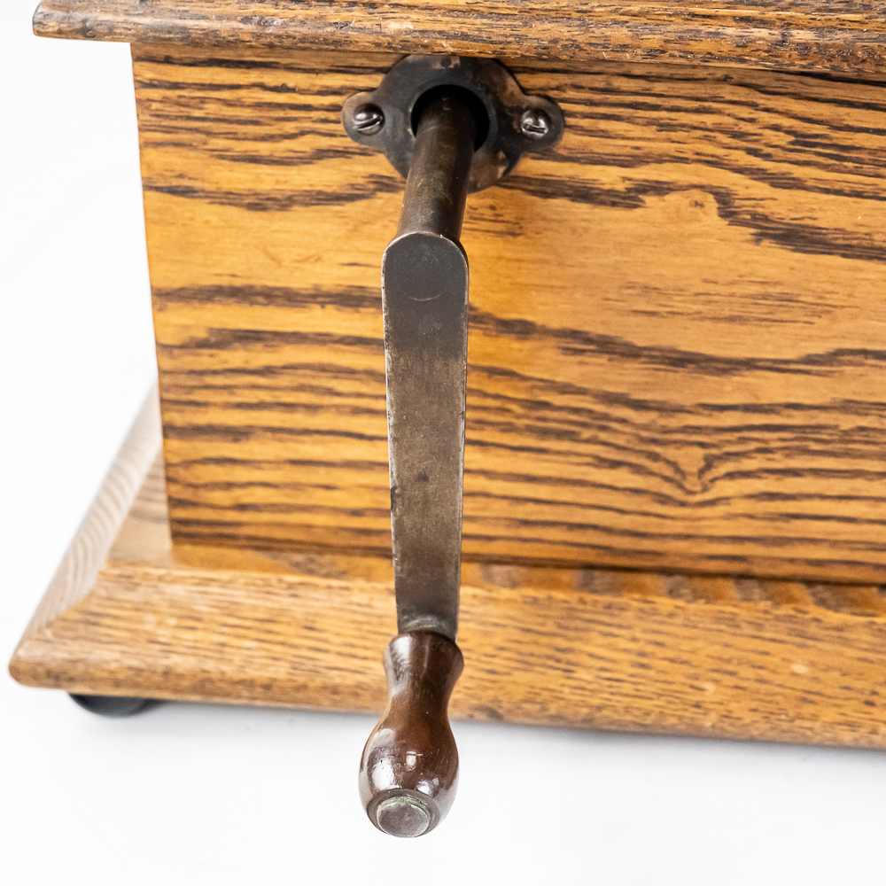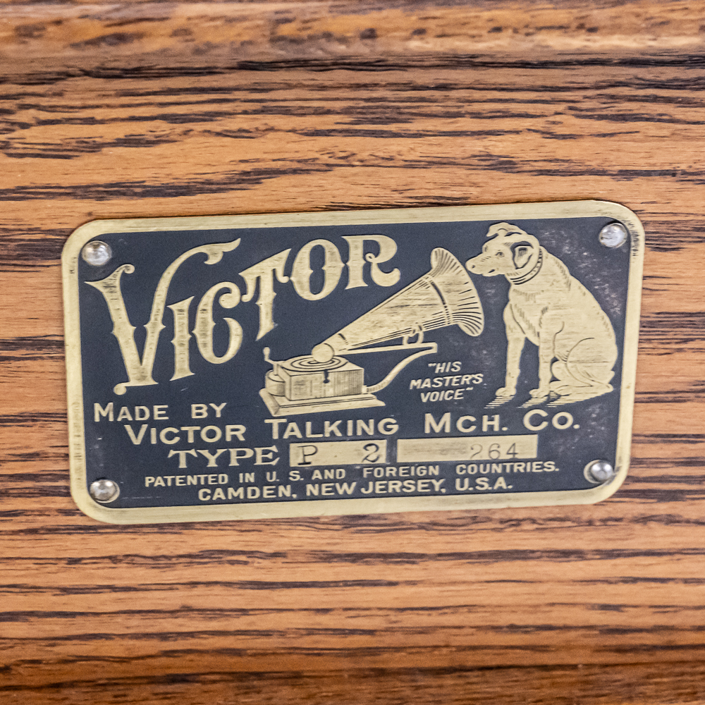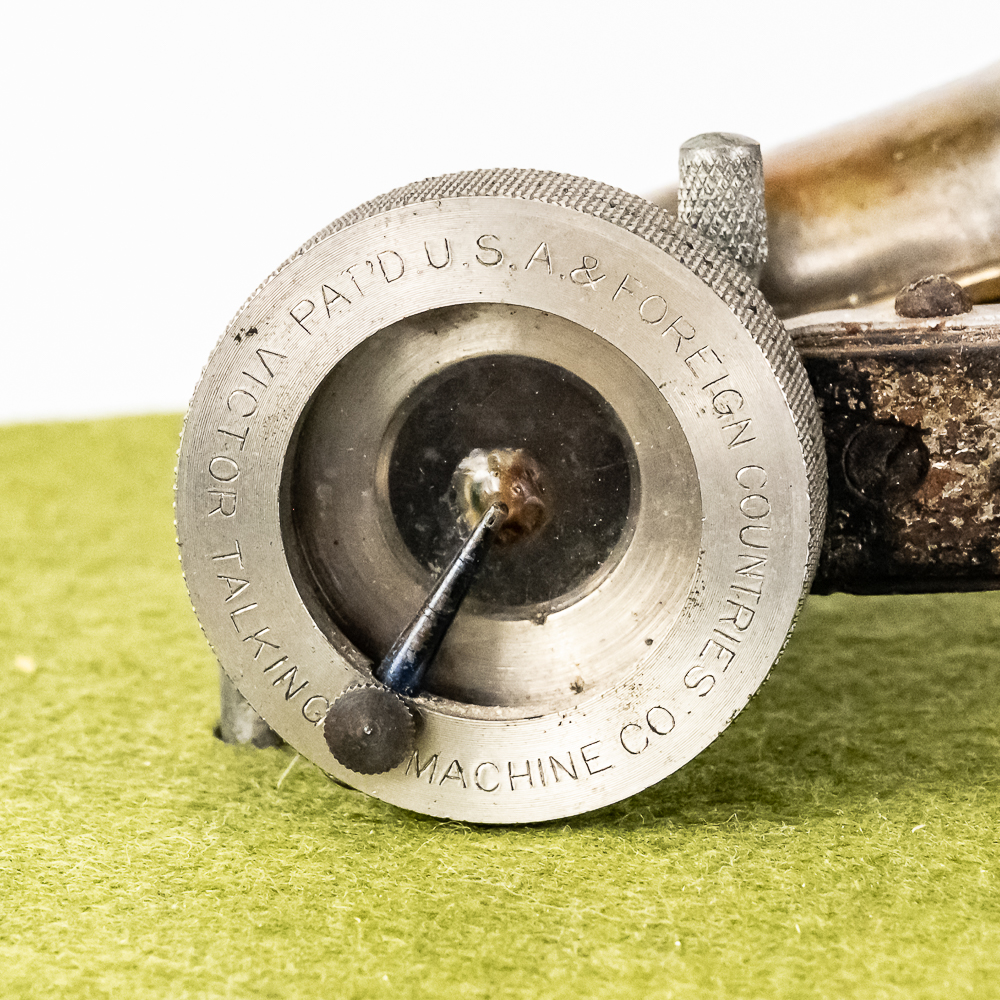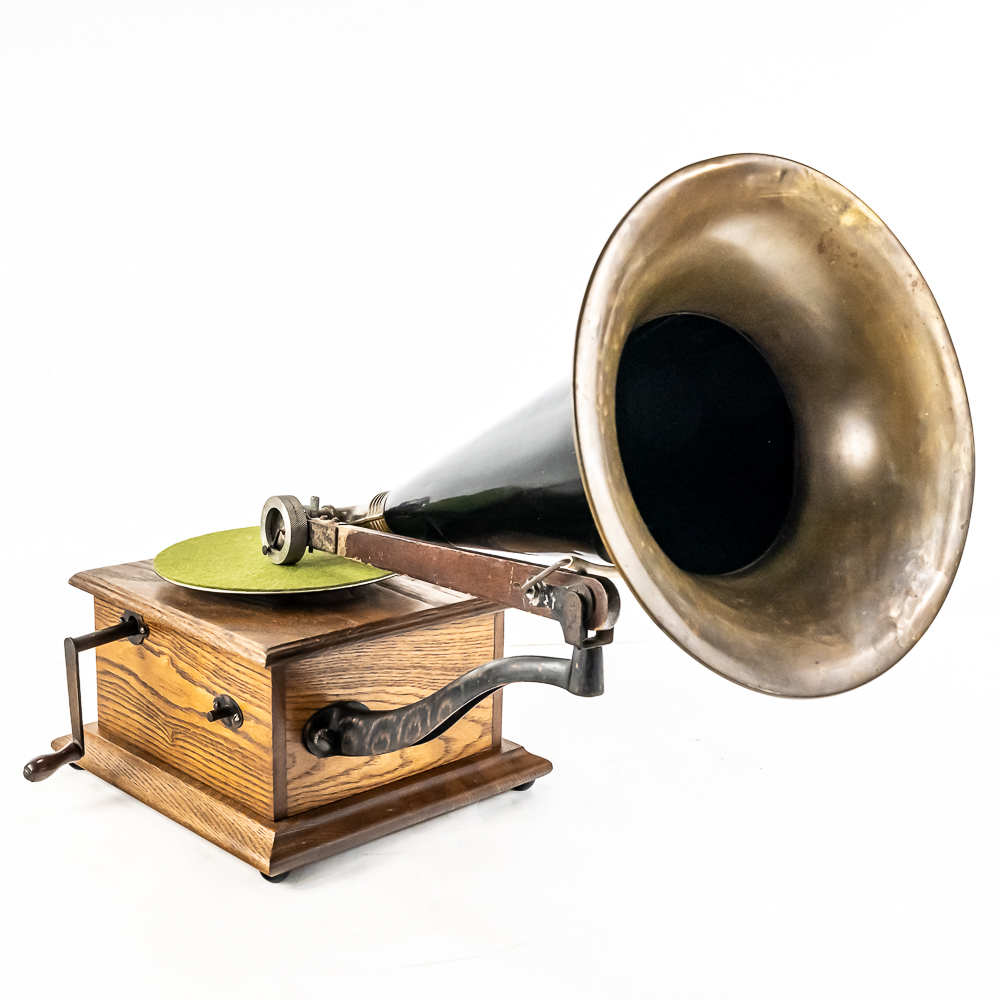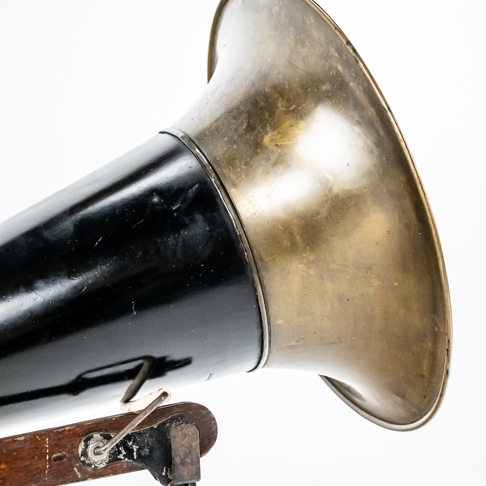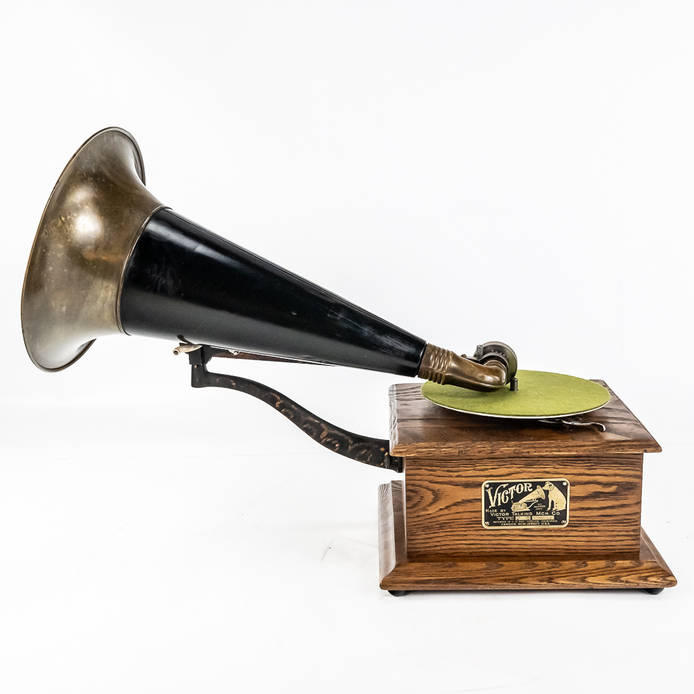 This machine in its oak cabinet has been refinished in overall good condition and presents well. Has a high quality reproduction Victor long throat reproducer in new condition. The original wooden tone arm has its original finish and all of its original hardware in fair condition with some rust and finish loss See photos. Has its original cast iron lower support arm and thumb screws with their original oxidized copper finish in average condition. The original cast iron turntable has replacement felt. Has its original slotted winding crank with some rust and the motor winds and runs. Has an original 14-1/2″ brass and black horn with a 9-1/2″ Diameter brass bell. Both bell and body are in average condition with a few minor dings. Has an original threaded brass elbow attached to the small end of the horn in average condition Cabinet measures 9″ X 10″ X 5-1/2″ T.